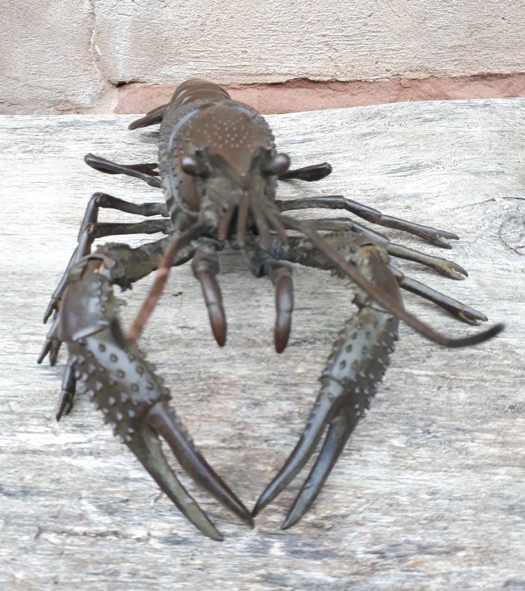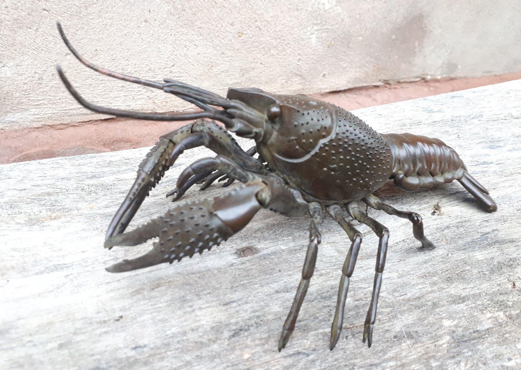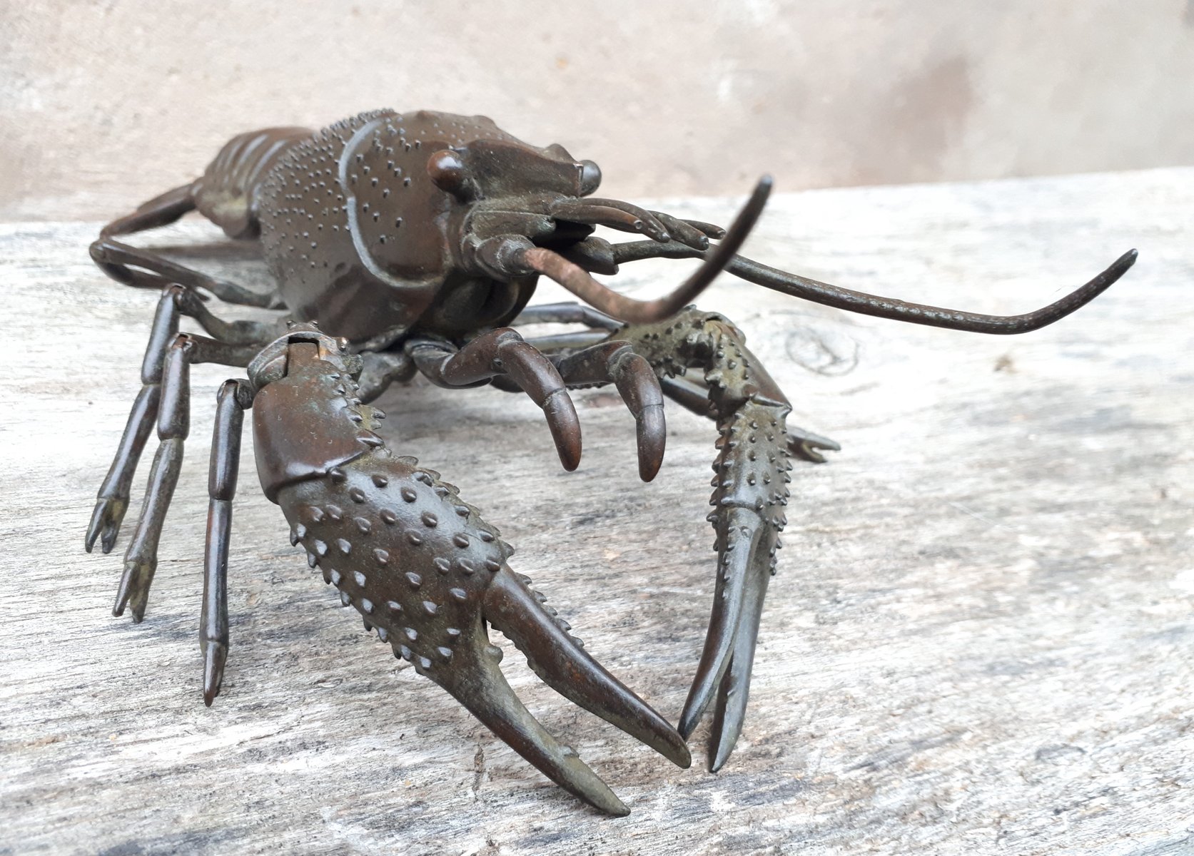 Rare articulated okimono in bronze with brown patina representing a crayfish, identical to those that can be found in nature.