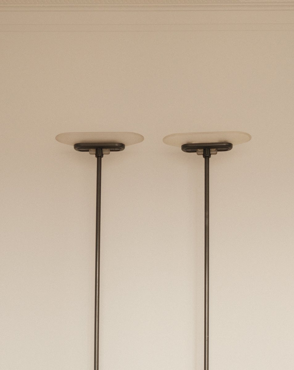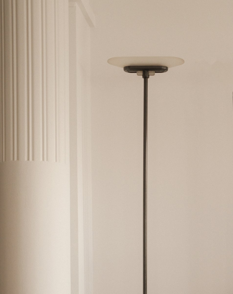 The minimal structure is complemented by a discreet reflector head, engineered to provide a controlled and ambient upward light. The design reflects the post-rationalist evolution of Italian lighting in the late 20th century—where clarity of form meets quiet sophistication.