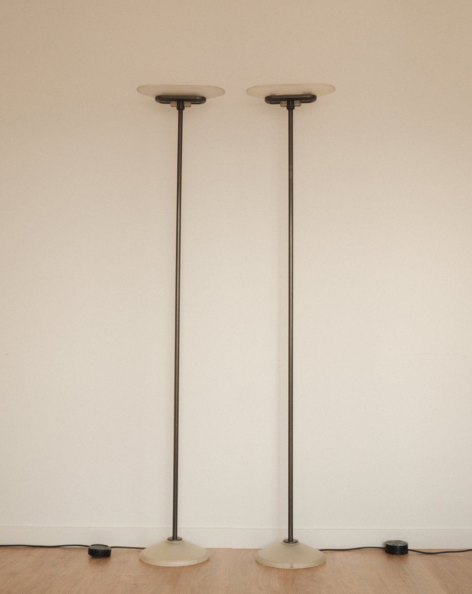 Ein seltenes und elegantes Paar „Jill“-Stehlampen, entworfen von Perry A. King, Santiago Miranda und Gianluigi Arnaldi für Arteluce Milano. Geprägt von ihrer schlanken, architektonischen Silhouette verfügt jede Lampe über einen hohen, rohrförmigen Schaft aus grau lackiertem Metall, der aus einem sanft geschwungenen Sockel aus Milchglas emporragt und so eine raffinierte Balance zwischen industrieller Präzision und subtiler Materialwärme schafft.