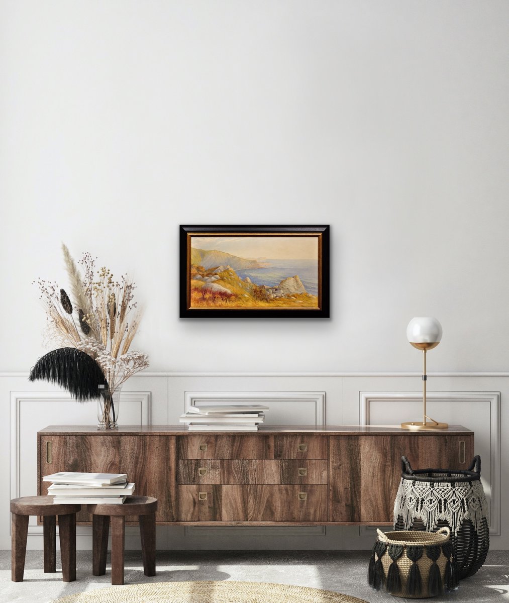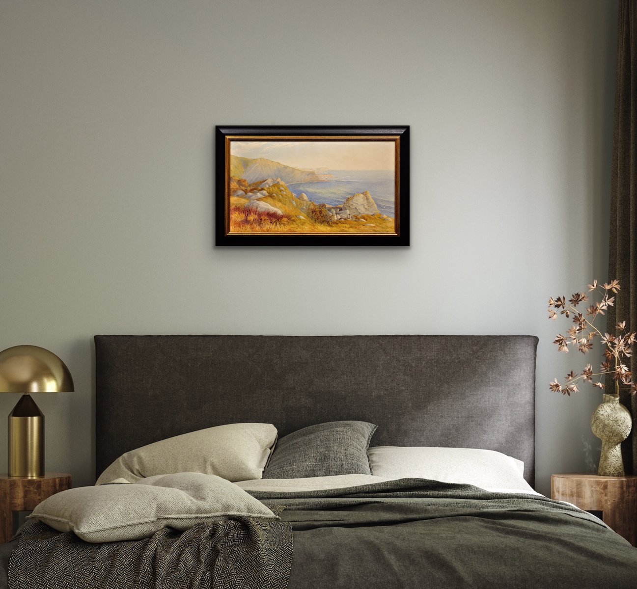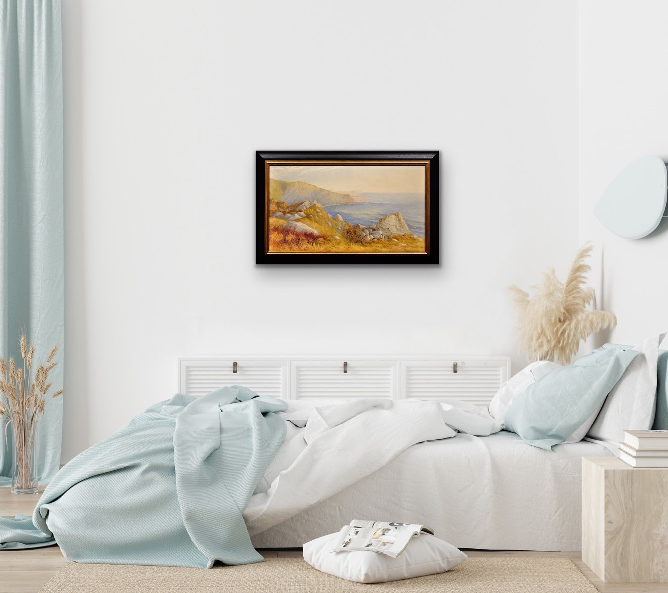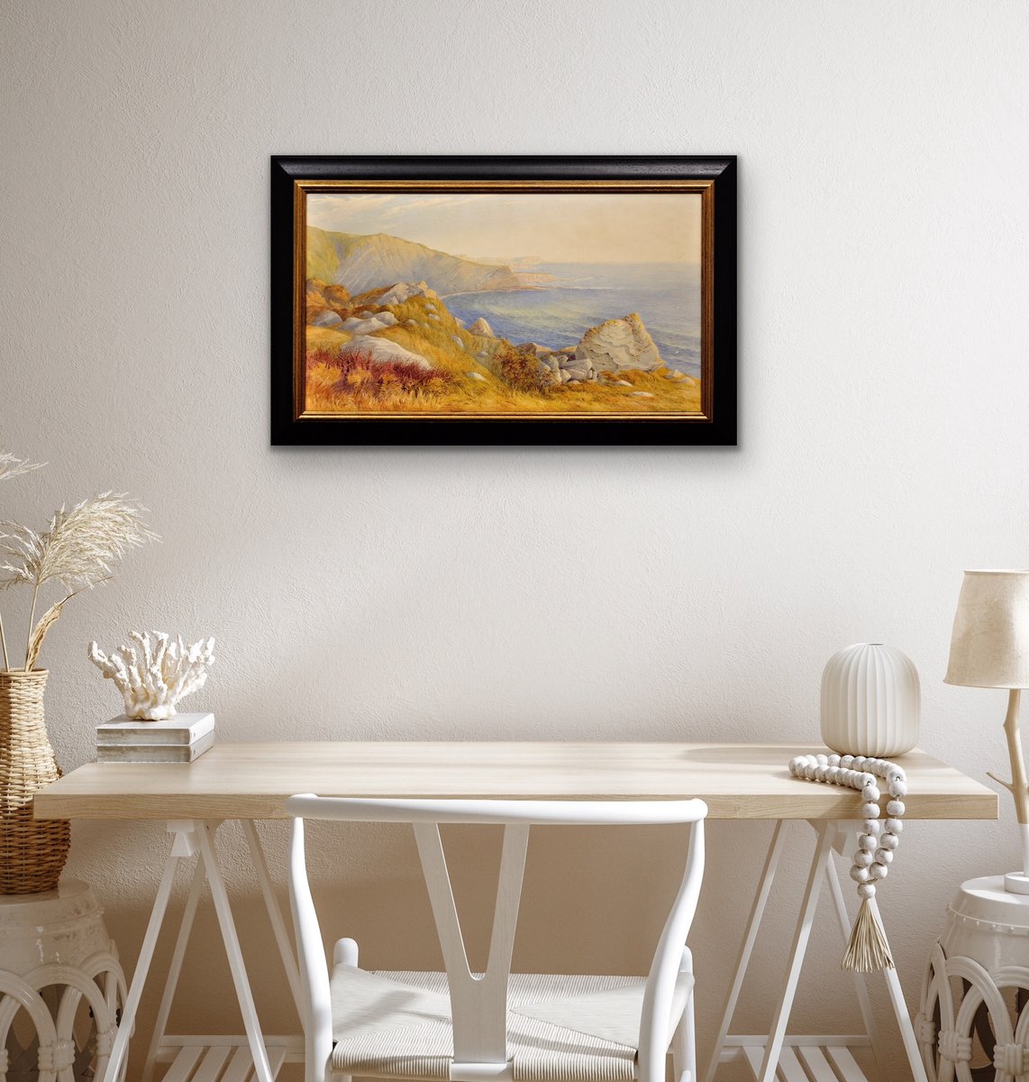 The foreground features weathered rocks scattered among golden grasses and low shrubs, rendered in warm, earthy tones that suggest late summer. The middle ground shows the sloping hills leading down to the cove, with visible layers of sedimentary rock in the cliffs. These cliffs curve gently toward the sea, with light and shadow adding depth. The background reveals more cliffs fading into the distance, with lighter tones indicating atmospheric perspective. The sea is painted in soft shades of blue and green, with gentle waves reflecting the light of the sky, creating a tranquil effect. The transition from deep blue to lighter tones near the shore is skilfully handled. The sky is a pale blue with warm, golden hues, suggesting either early morning or late afternoon, contributing to the painting’s peaceful atmosphere.