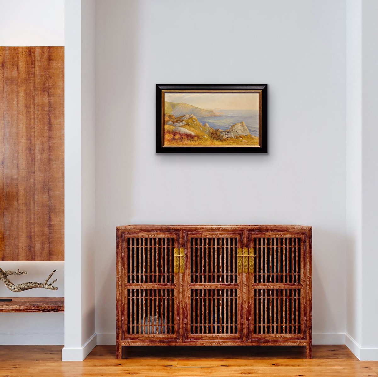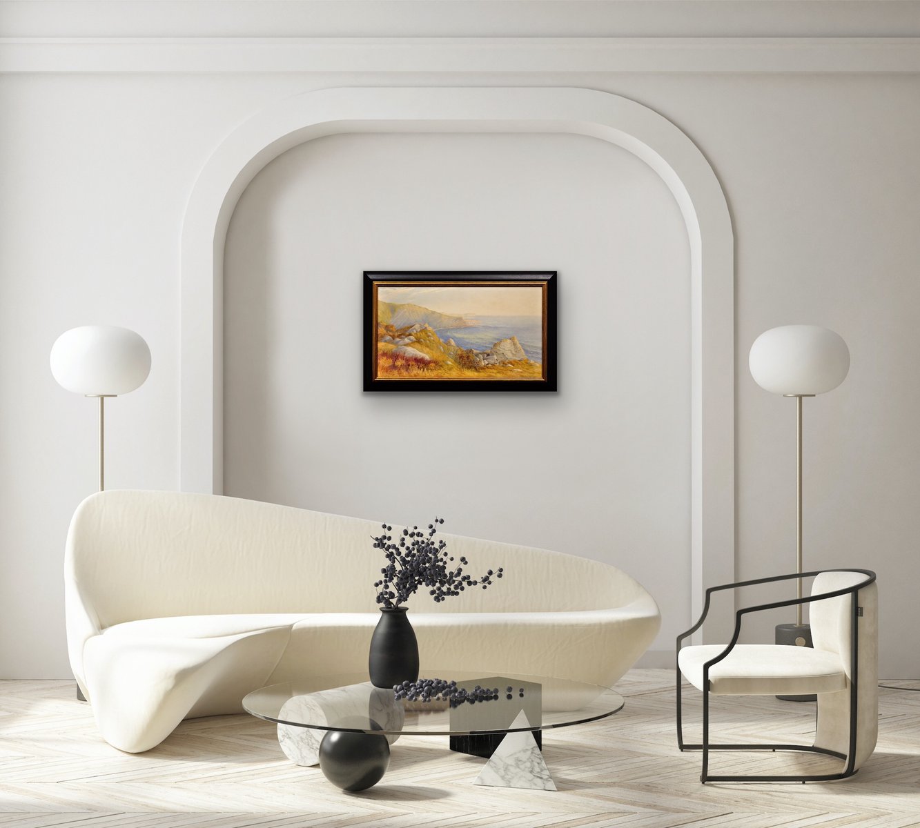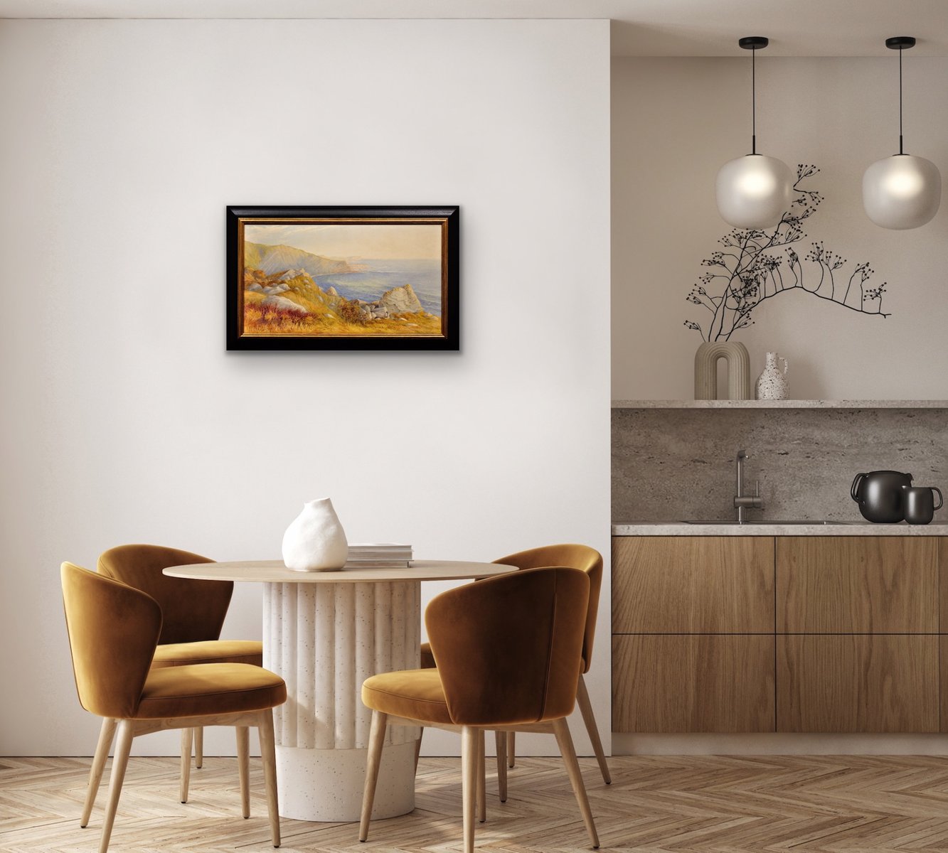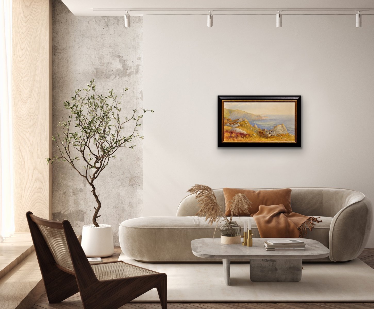The foreground features weathered rocks scattered among golden grasses and low shrubs, rendered in warm, earthy tones that suggest late summer. The middle ground shows the sloping hills leading down to the cove, with visible layers of sedimentary rock in the cliffs. These cliffs curve gently toward the sea, with light and shadow adding depth. The background reveals more cliffs fading into the distance, with lighter tones indicating atmospheric perspective. The sea is painted in soft shades of blue and green, with gentle waves reflecting the light of the sky, creating a tranquil effect. The transition from deep blue to lighter tones near the shore is skilfully handled. The sky is a pale blue with warm, golden hues, suggesting either early morning or late afternoon, contributing to the painting’s peaceful atmosphere.
