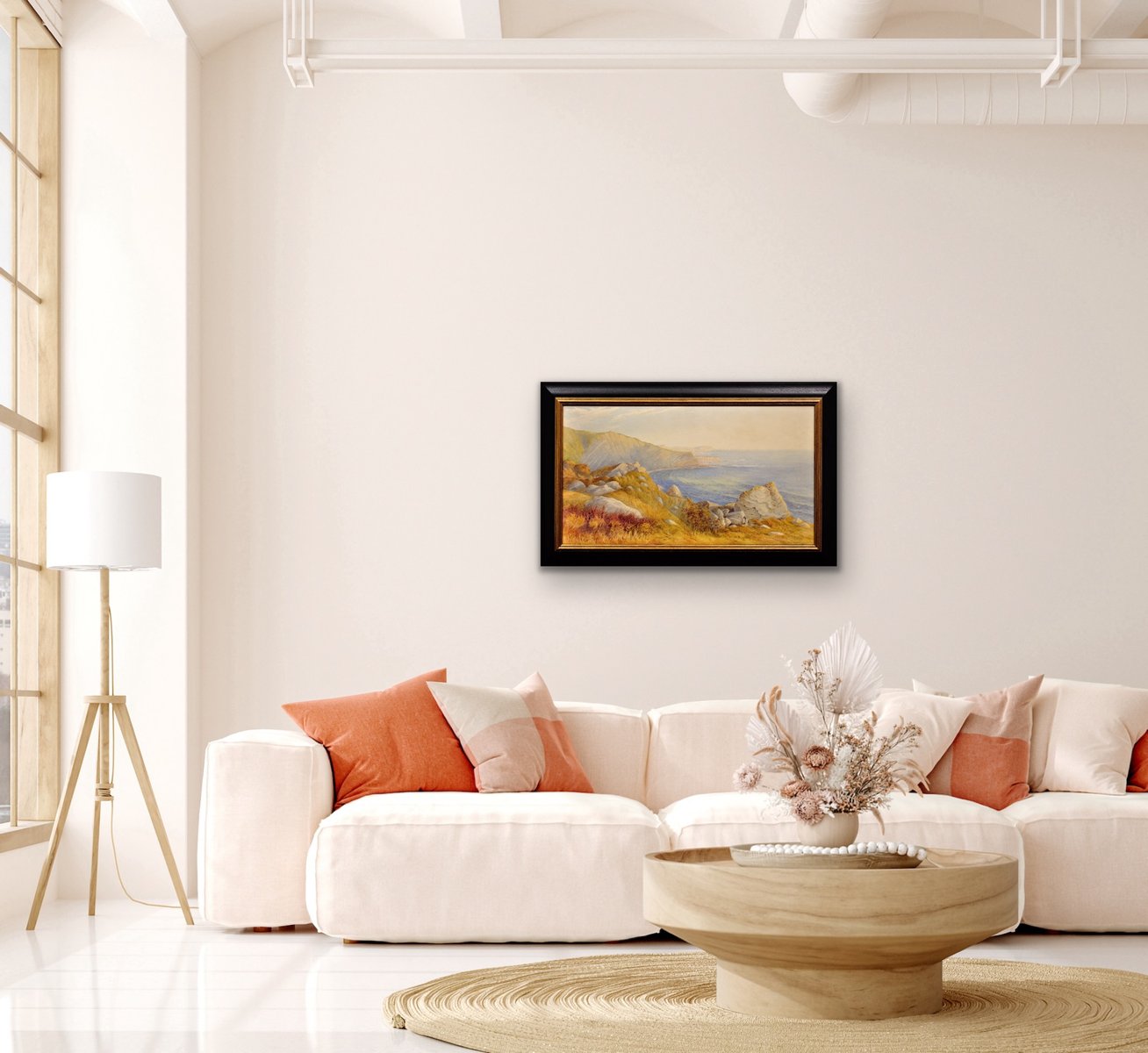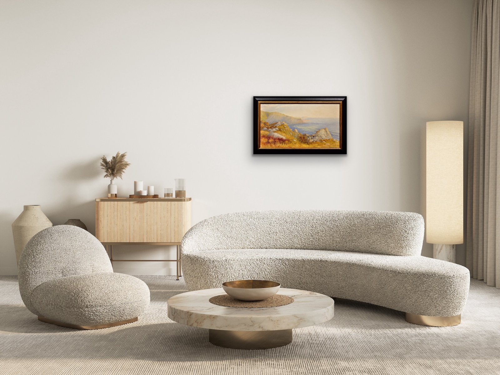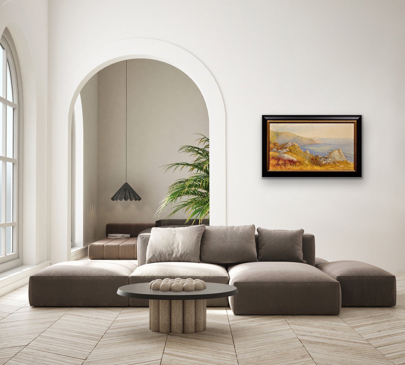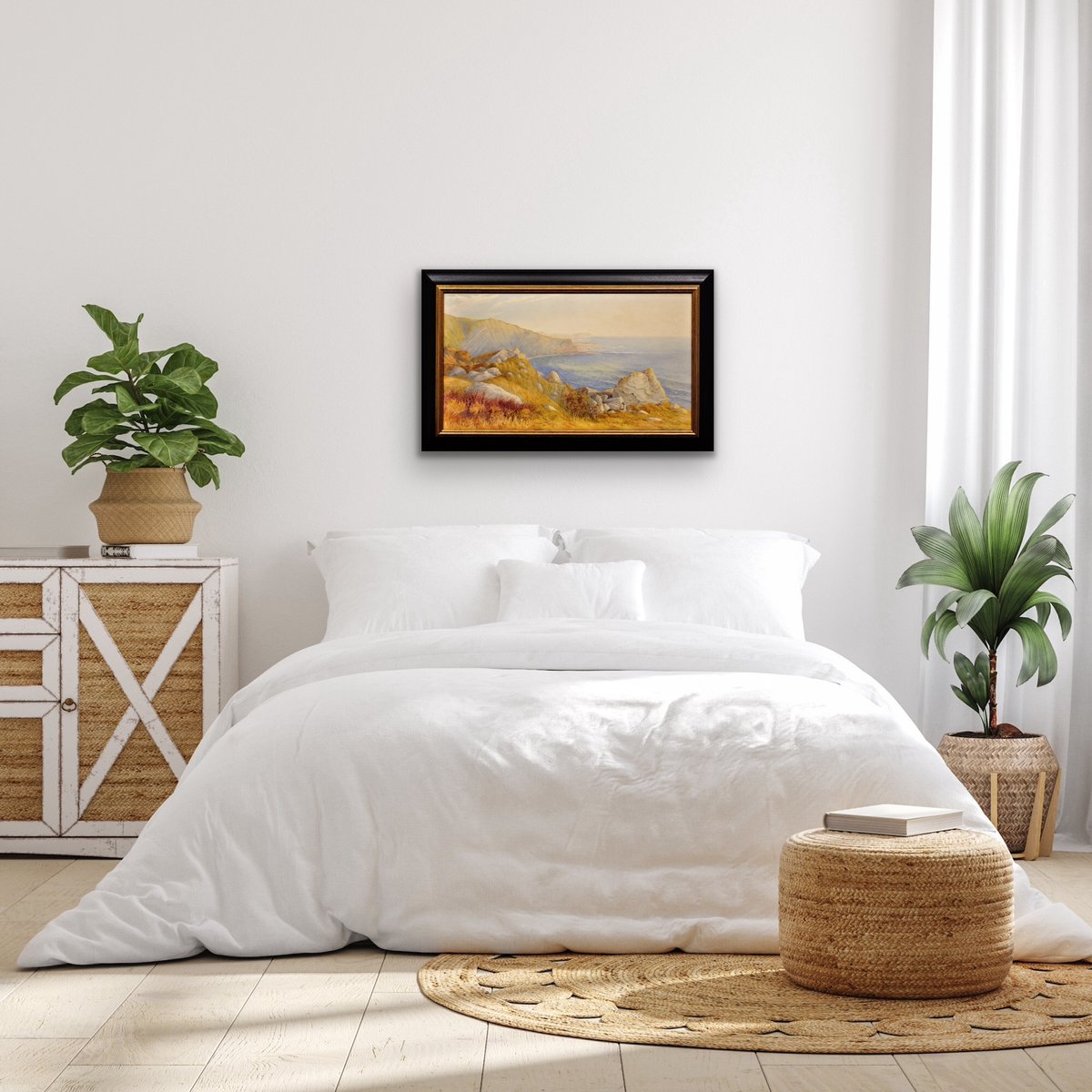 The foreground features weathered rocks scattered among golden grasses and low shrubs, rendered in warm, earthy tones that suggest late summer. The middle ground shows the sloping hills leading down to the cove, with visible layers of sedimentary rock in the cliffs. These cliffs curve gently toward the sea, with light and shadow adding depth. The background reveals more cliffs fading into the distance, with lighter tones indicating atmospheric perspective. The sea is painted in soft shades of blue and green, with gentle waves reflecting the light of the sky, creating a tranquil effect. The transition from deep blue to lighter tones near the shore is skilfully handled. The sky is a pale blue with warm, golden hues, suggesting either early morning or late afternoon, contributing to the painting’s peaceful atmosphere.