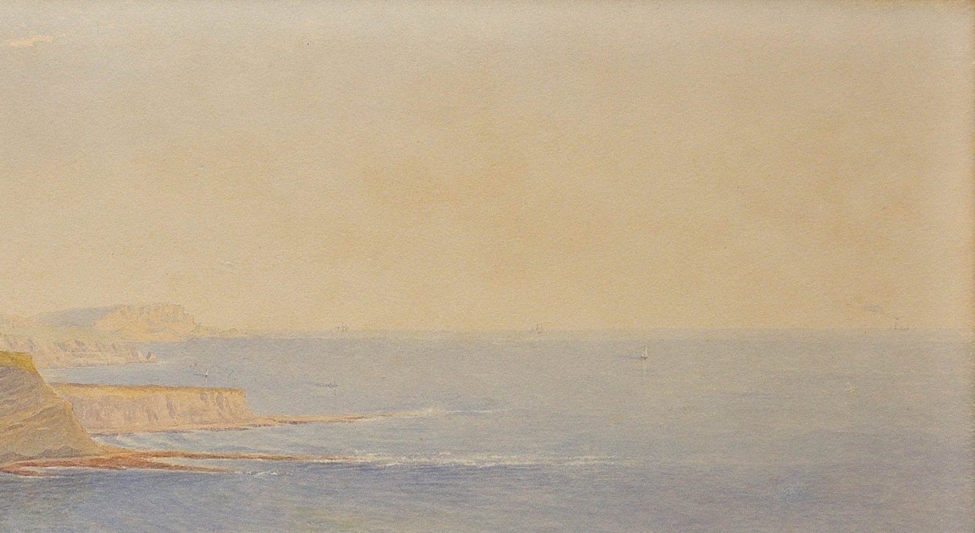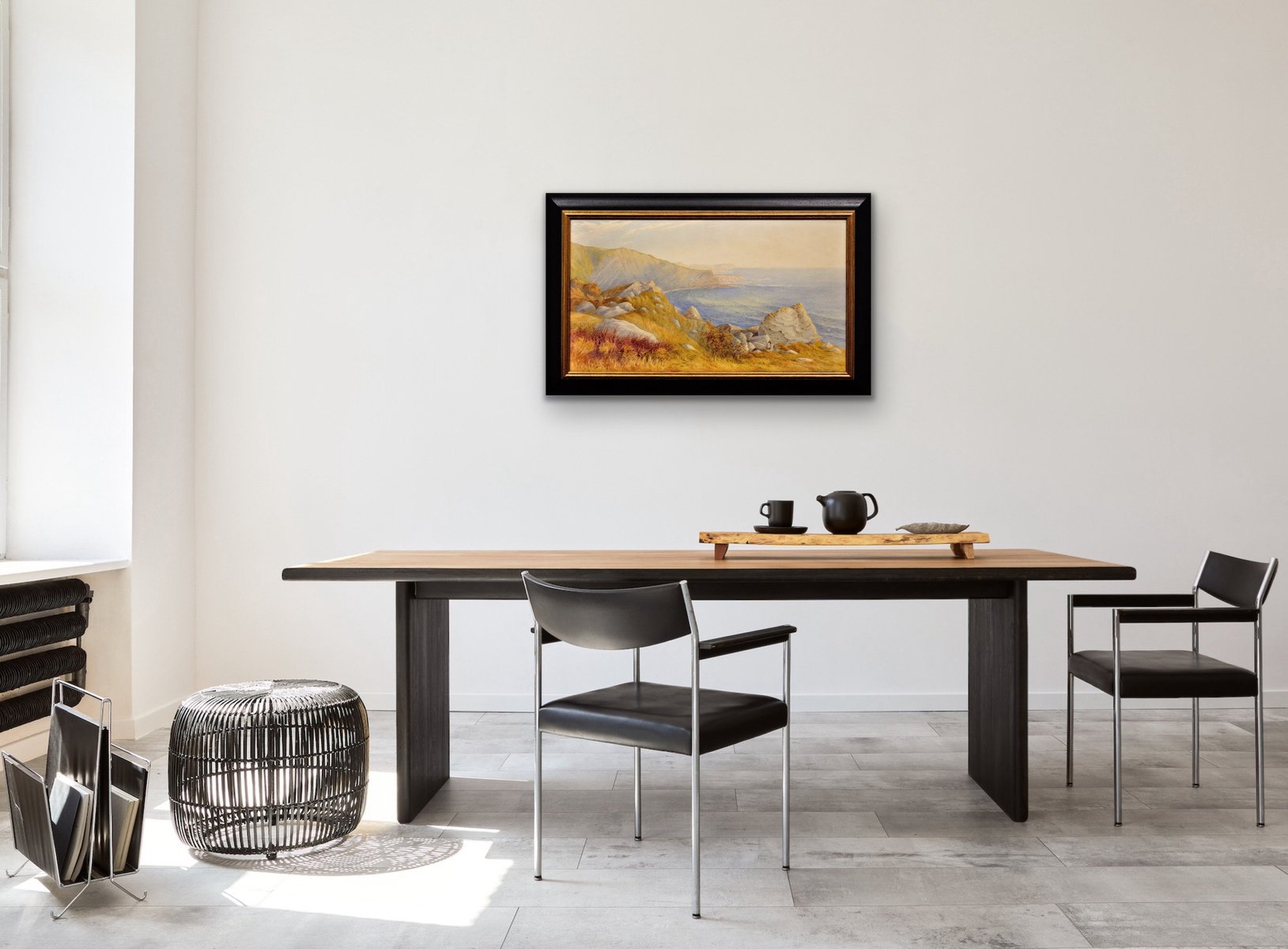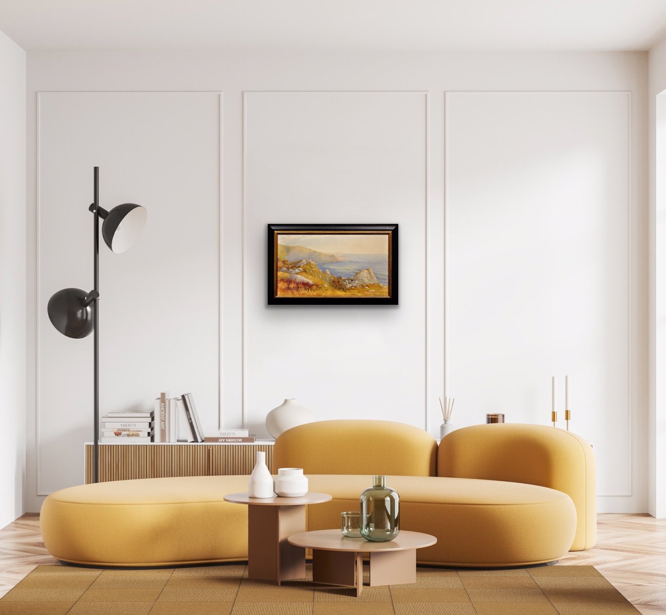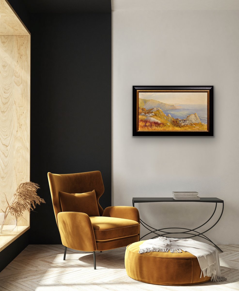 The foreground features weathered rocks scattered among golden grasses and low shrubs, rendered in warm, earthy tones that suggest late summer. The middle ground shows the sloping hills leading down to the cove, with visible layers of sedimentary rock in the cliffs. These cliffs curve gently toward the sea, with light and shadow adding depth. The background reveals more cliffs fading into the distance, with lighter tones indicating atmospheric perspective. The sea is painted in soft shades of blue and green, with gentle waves reflecting the light of the sky, creating a tranquil effect. The transition from deep blue to lighter tones near the shore is skilfully handled. The sky is a pale blue with warm, golden hues, suggesting either early morning or late afternoon, contributing to the painting’s peaceful atmosphere.