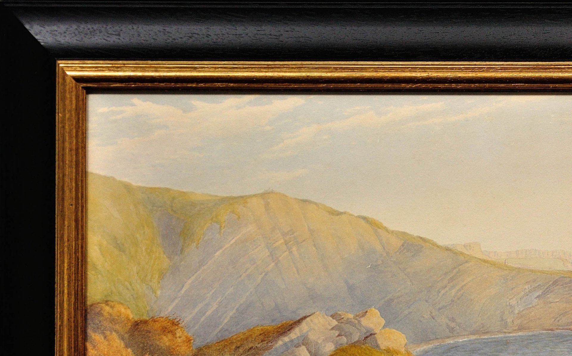 Dieses Aquarell von John Bedloe Goddard aus dem Jahr 1875 zeigt die ruhige und raue Landschaft der Man O' War Cove in Dorset, England. Das Kunstwerk zeigt Goddards akribische Liebe zum Detail und seine Fähigkeit, die natürliche Schönheit der englischen Küste zu vermitteln.