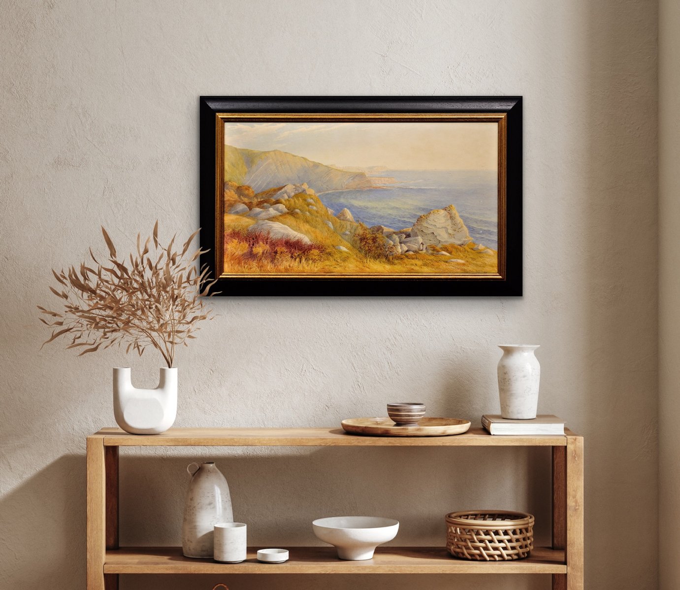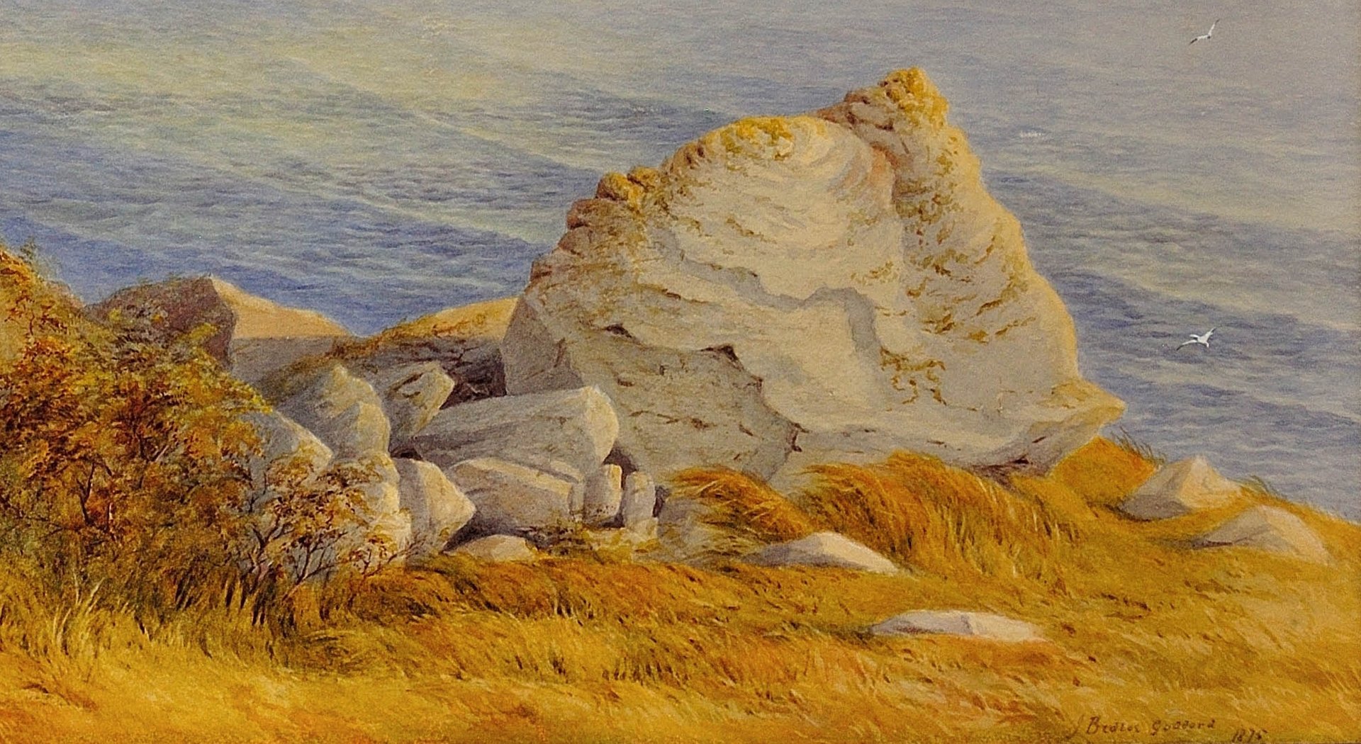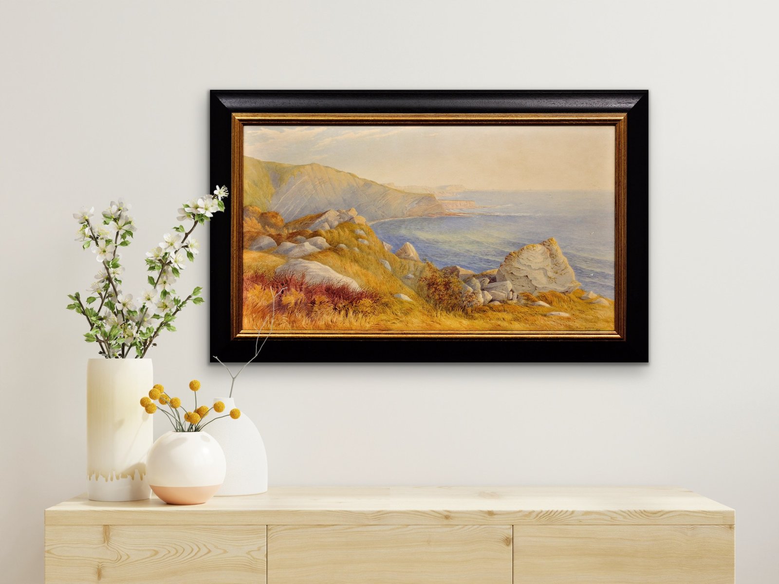 This watercolour painting by John Bedloe Goddard, created in 1875, beautifully captures the serene and rugged landscape of Man O’ War Cove in Dorset, England. The artwork showcases Goddard’s meticulous attention to detail and his ability to convey the natural beauty of the English coastline.