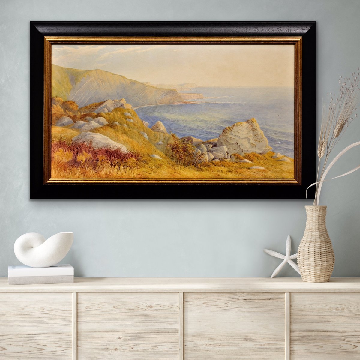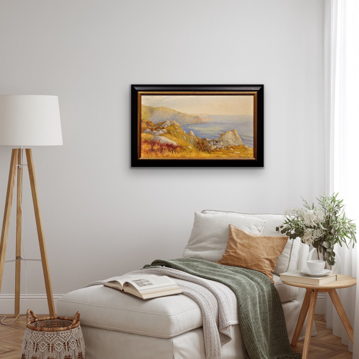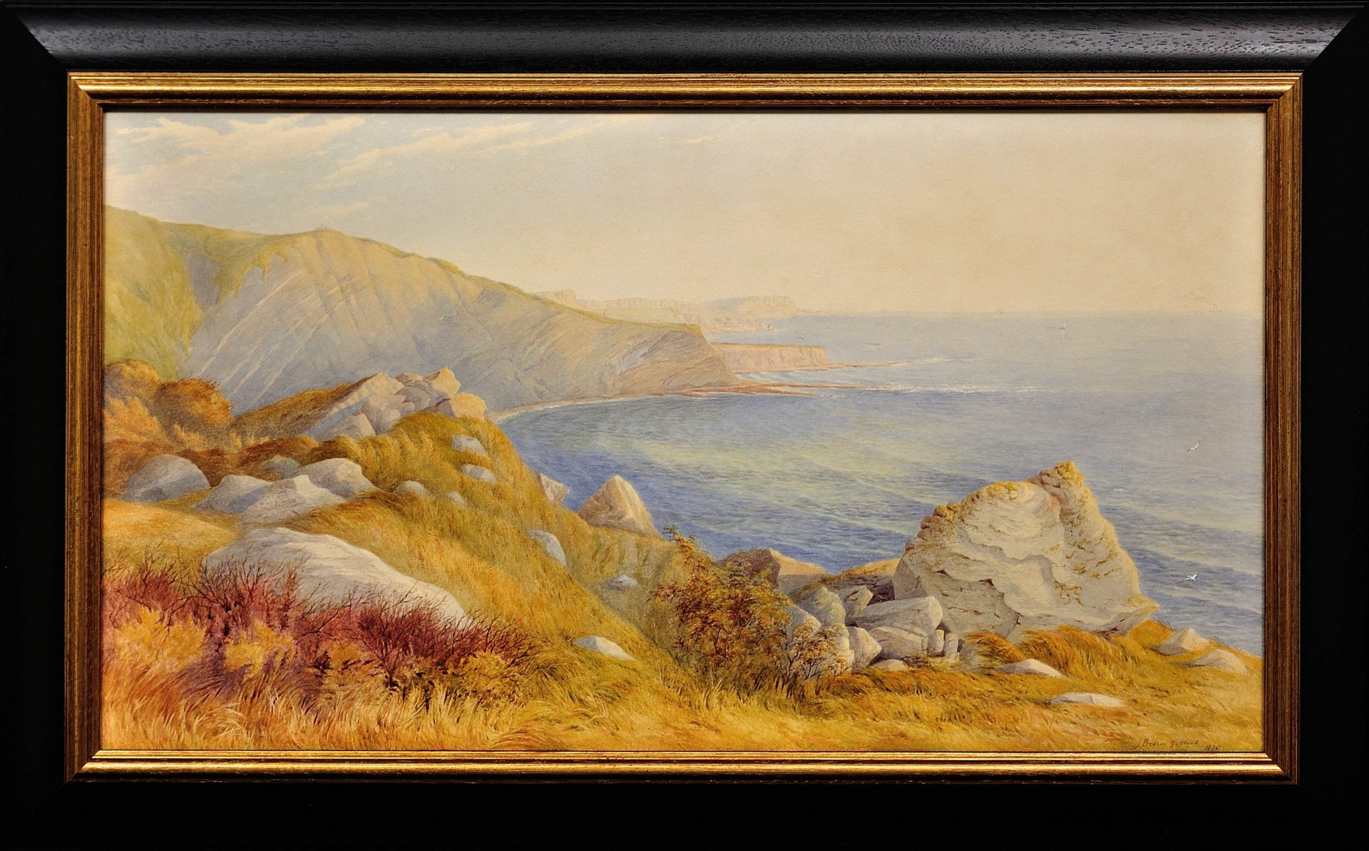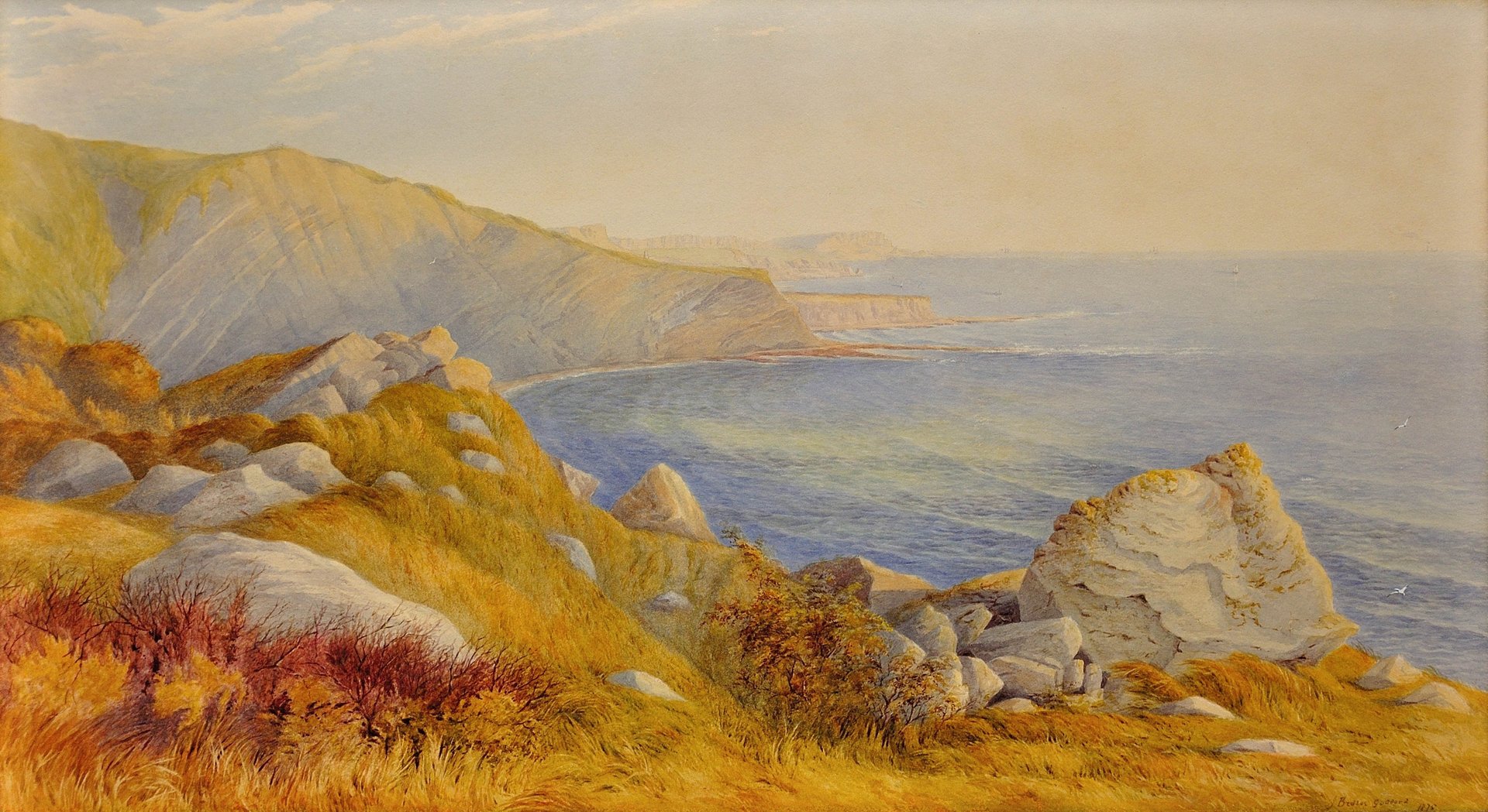 This watercolour painting by John Bedloe Goddard, created in 1875, beautifully captures the serene and rugged landscape of Man O’ War Cove in Dorset, England. The artwork showcases Goddard’s meticulous attention to detail and his ability to convey the natural beauty of the English coastline.