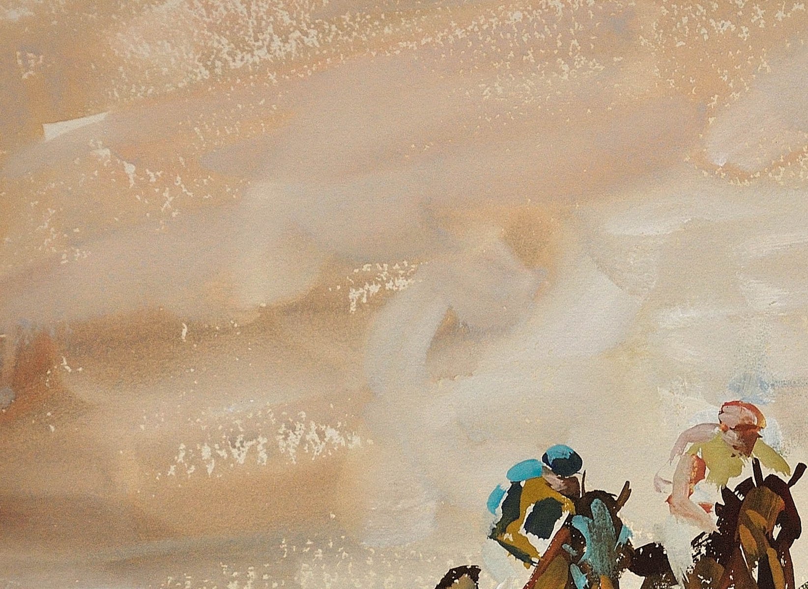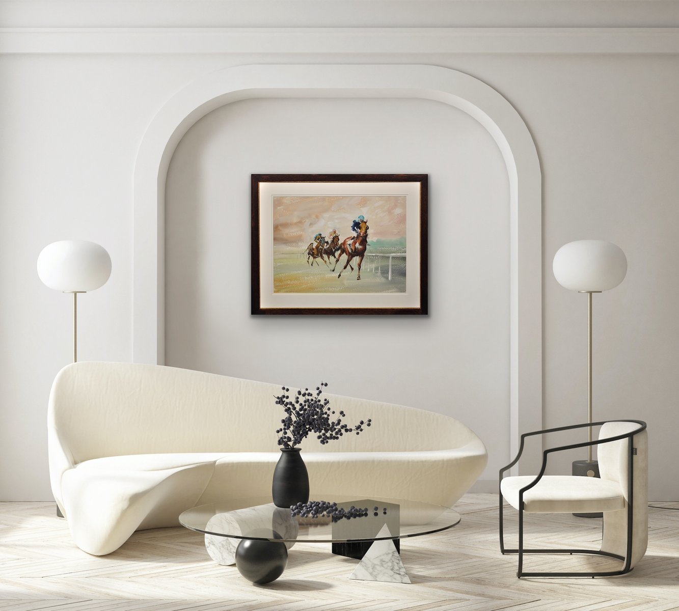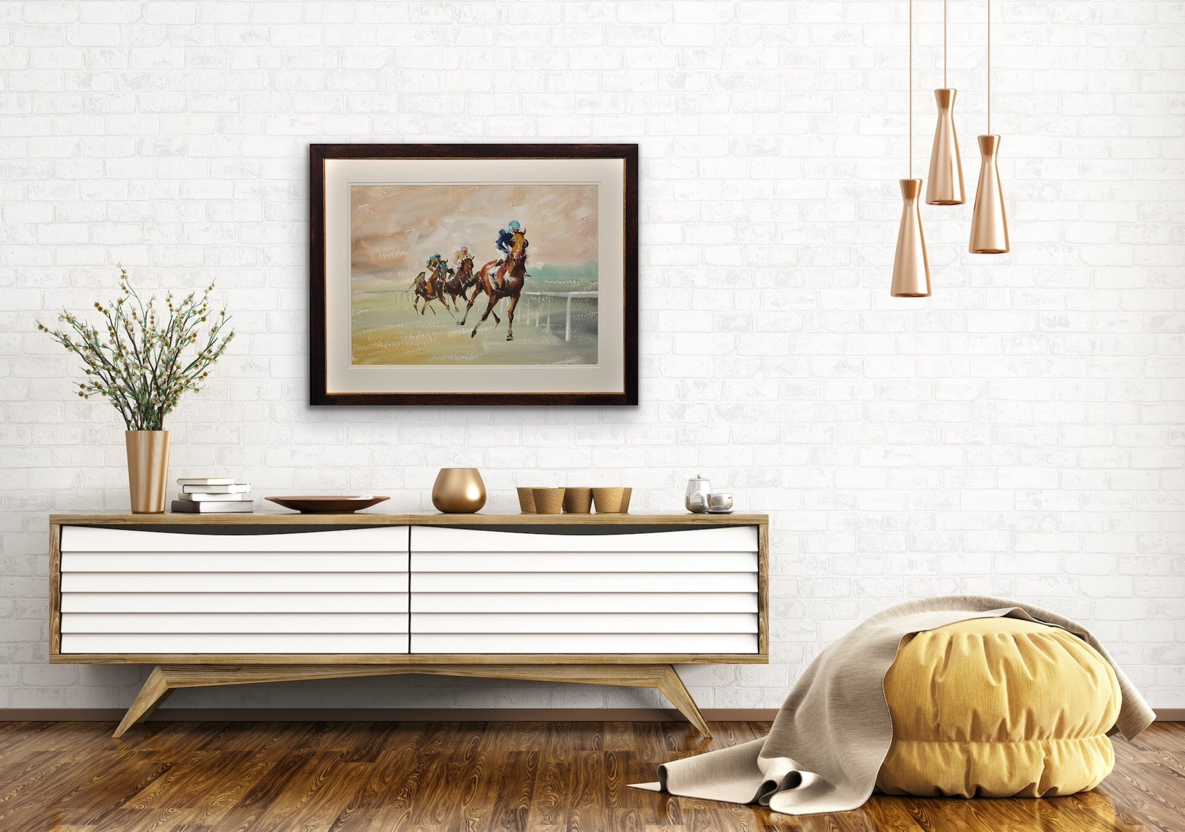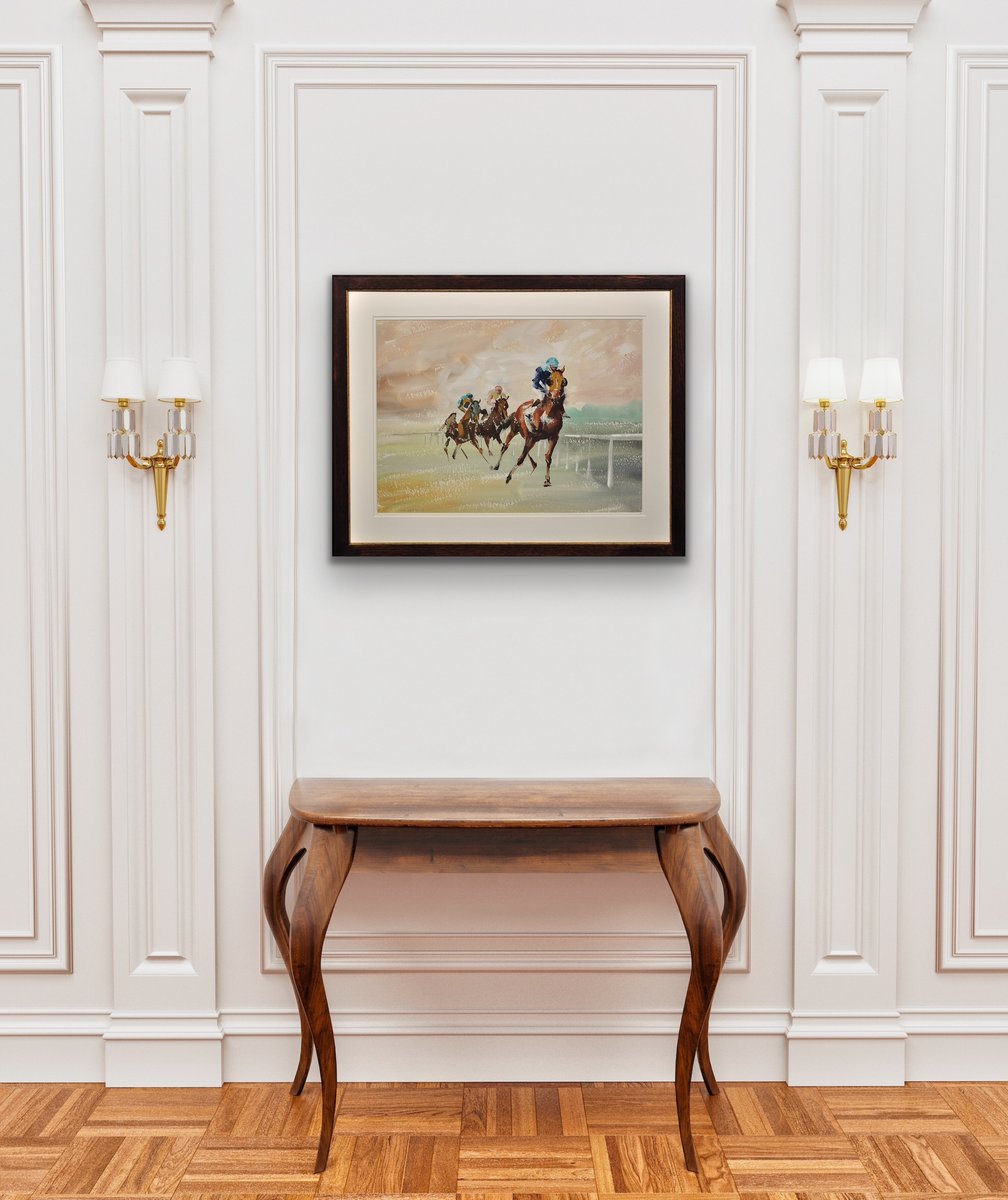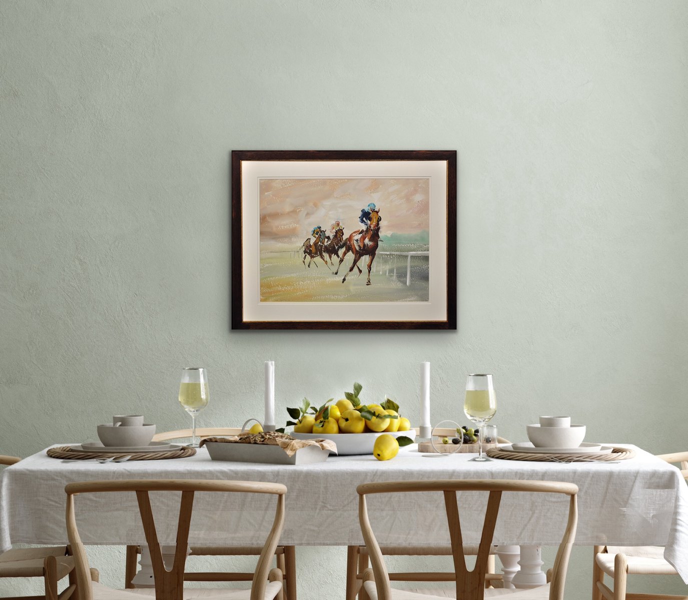 Es handelt sich um ein täuschend einfaches Gemälde von drei Rennpferden, die auf einer Rennbahn galoppieren, mit weißen Zäunen im Hintergrund einer übermäßig minimalen und ländlichen Landschaft. Alle drei Pferde sind rotbraun. Ihre Jockeys, die alle über ihre Sättel erhoben sind, tragen die Farben der Rennpferde, zwei von ihnen in Marine und Türkis, das dritte in Rosa und Creme. Die Pferde sind so gekonnt und leichtfüßig gemalt, dass ein echtes Gefühl von Bewegung und Geschwindigkeit entsteht. Man kann fast die Hufe hören, wenn sie die Zielgerade hinunterdonnern!
