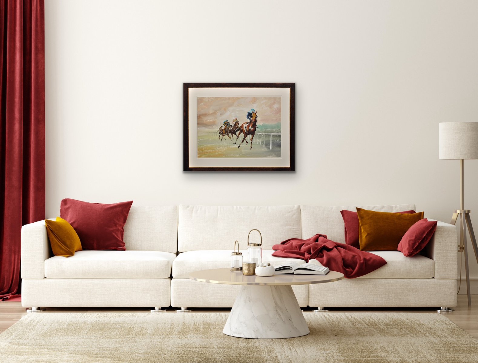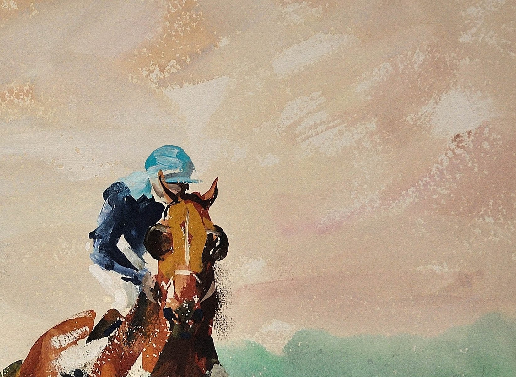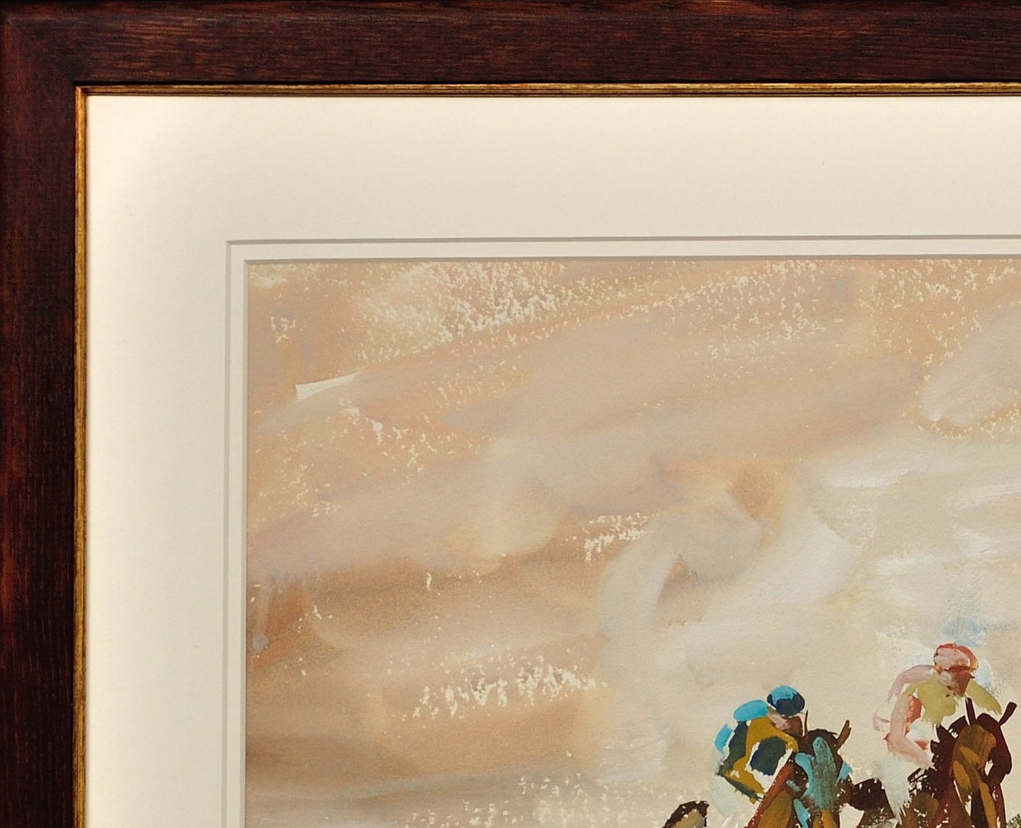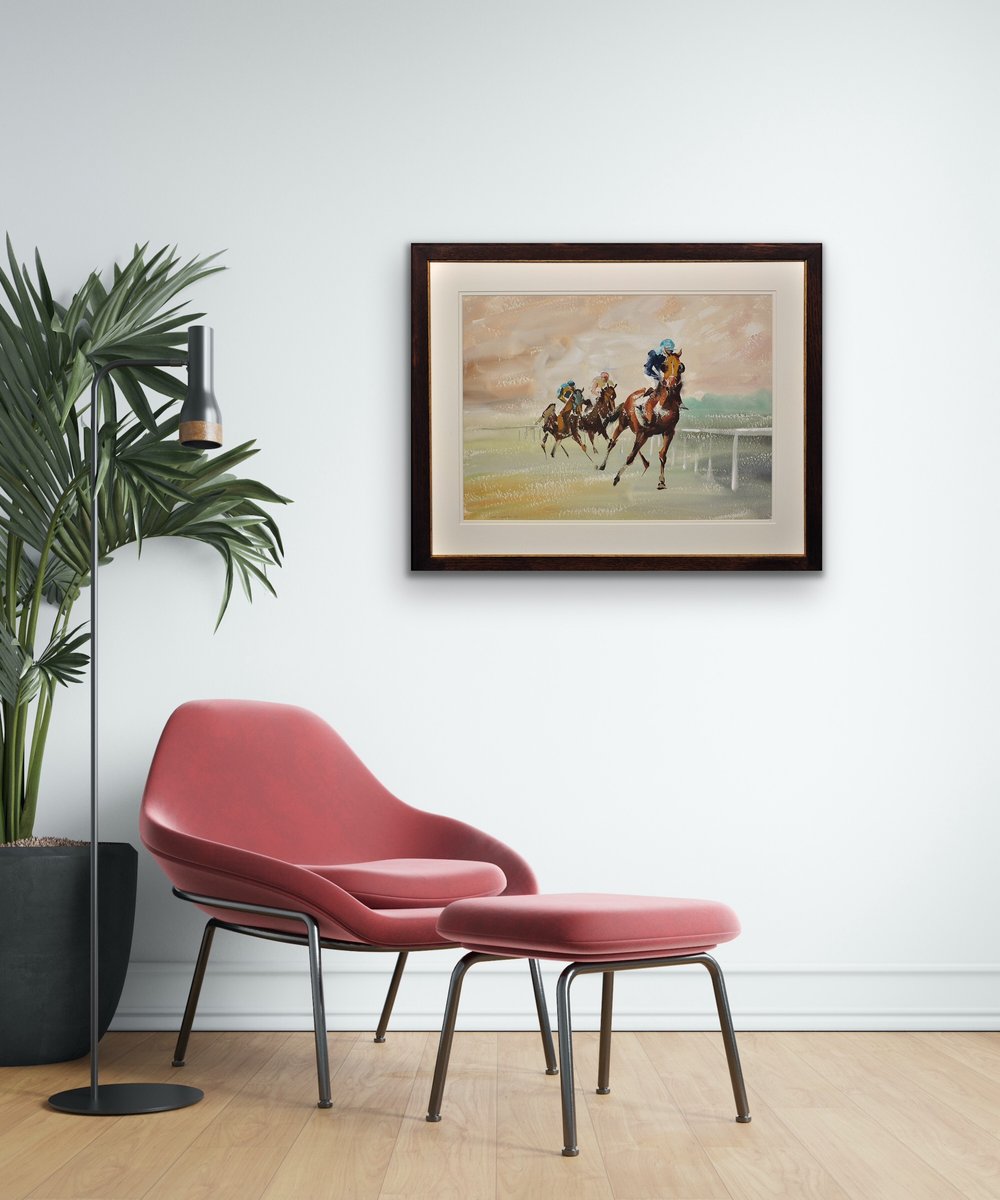 Es handelt sich um ein täuschend einfaches Gemälde von drei Rennpferden, die auf einer Rennbahn galoppieren, mit weißen Zäunen im Hintergrund einer übermäßig minimalen und ländlichen Landschaft. Alle drei Pferde sind rotbraun. Ihre Jockeys, die alle über ihre Sättel erhoben sind, tragen die Farben der Rennpferde, zwei von ihnen in Marine und Türkis, das dritte in Rosa und Creme. Die Pferde sind so gekonnt und leichtfüßig gemalt, dass ein echtes Gefühl von Bewegung und Geschwindigkeit entsteht. Man kann fast die Hufe hören, wenn sie die Zielgerade hinunterdonnern!