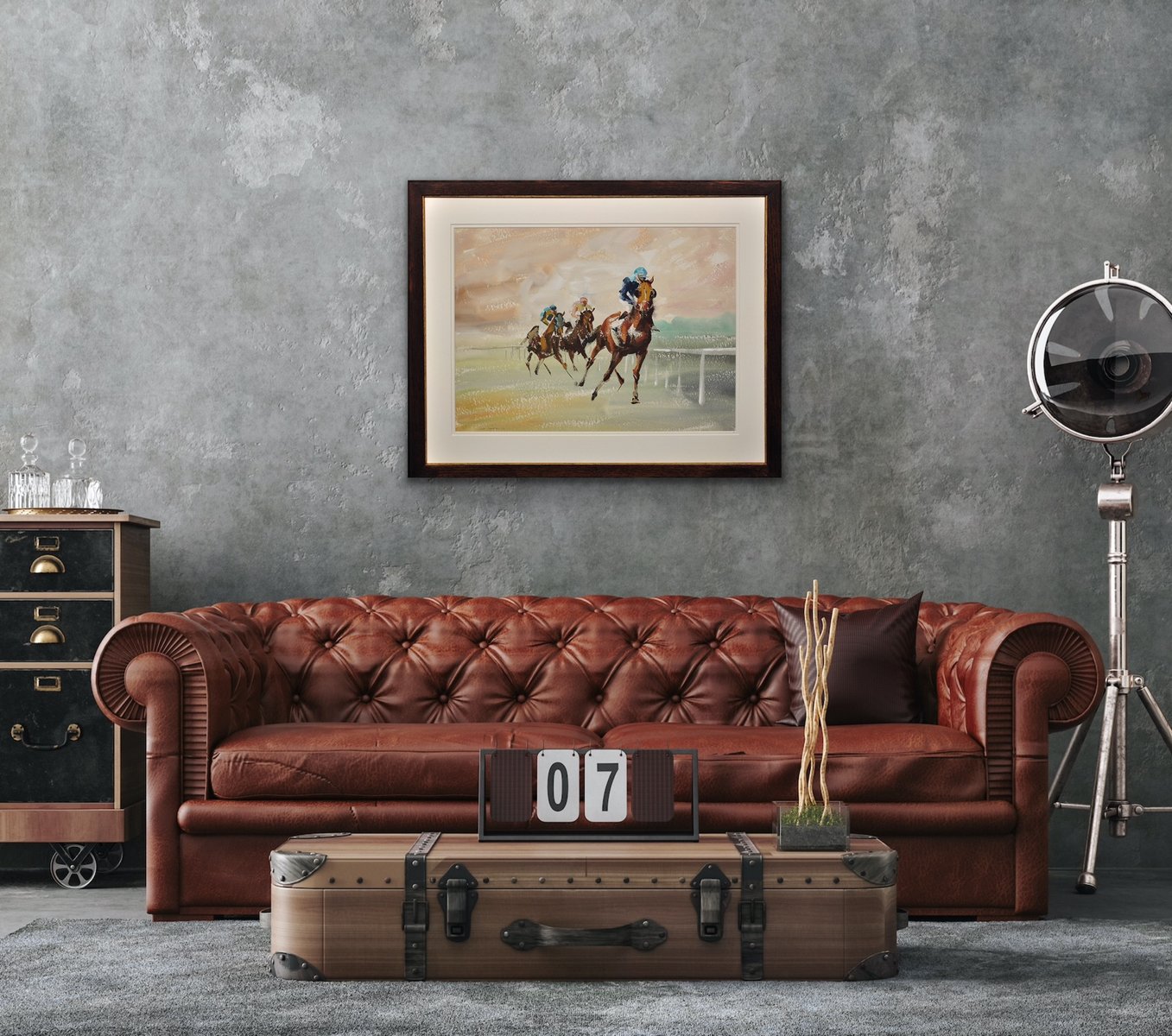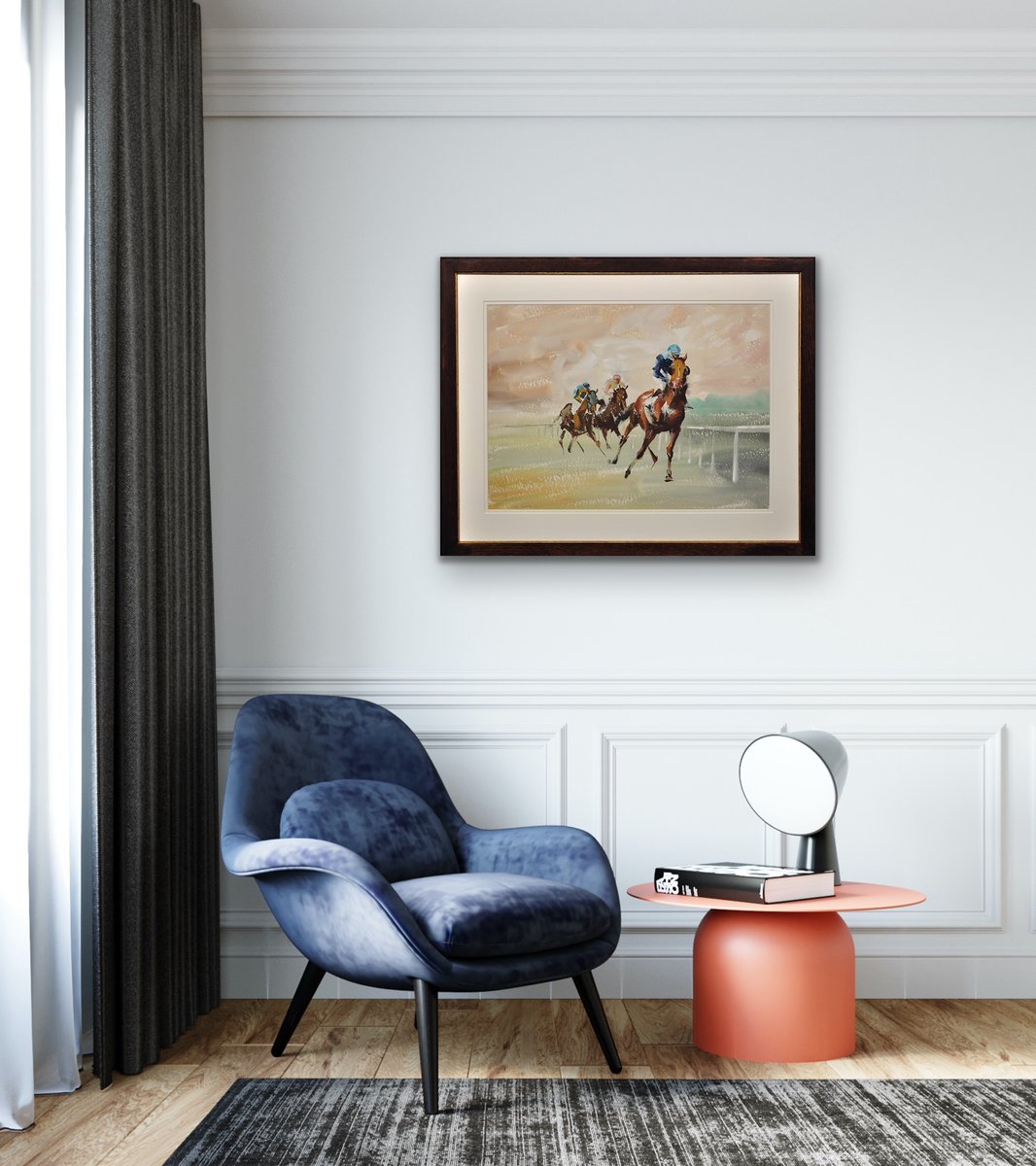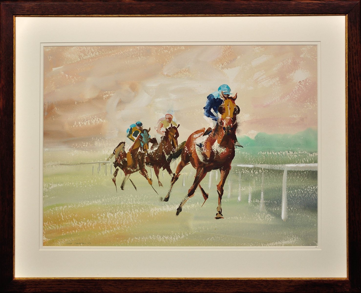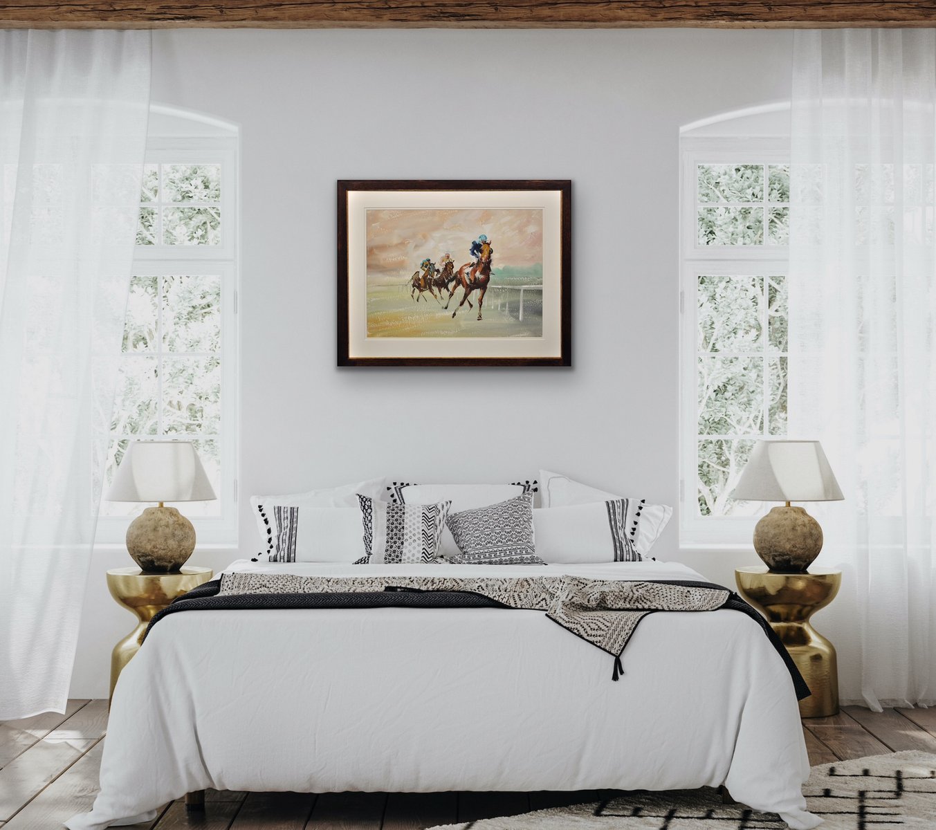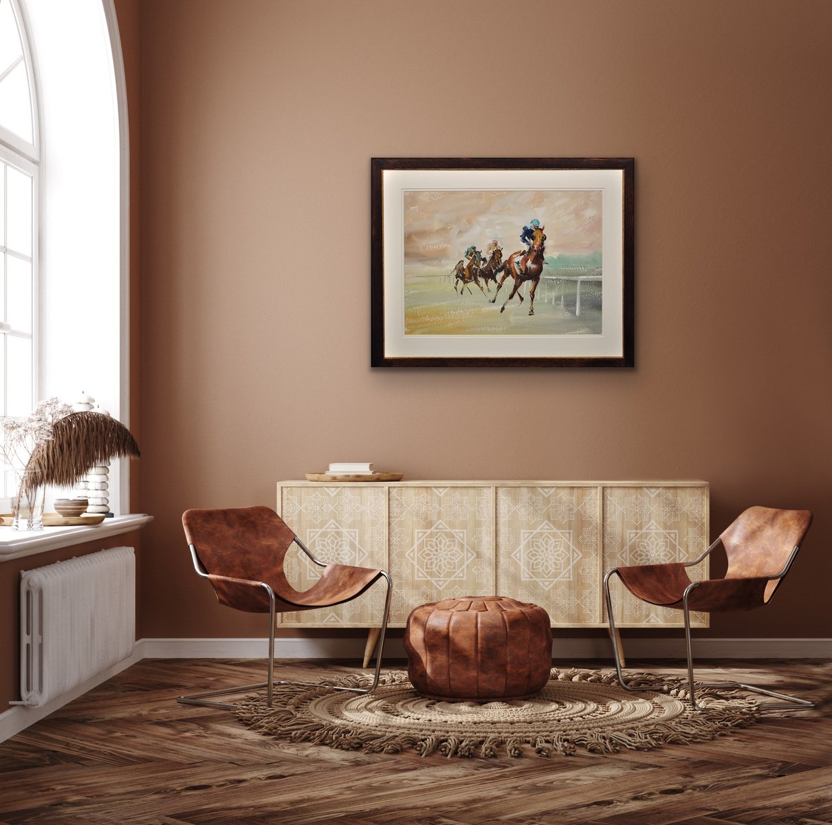 Es handelt sich um ein täuschend einfaches Gemälde von drei Rennpferden, die auf einer Rennbahn galoppieren, mit weißen Zäunen im Hintergrund einer übermäßig minimalen und ländlichen Landschaft. Alle drei Pferde sind rotbraun. Ihre Jockeys, die alle über ihre Sättel erhoben sind, tragen die Farben der Rennpferde, zwei von ihnen in Marine und Türkis, das dritte in Rosa und Creme. Die Pferde sind so gekonnt und leichtfüßig gemalt, dass ein echtes Gefühl von Bewegung und Geschwindigkeit entsteht. Man kann fast die Hufe hören, wenn sie die Zielgerade hinunterdonnern!