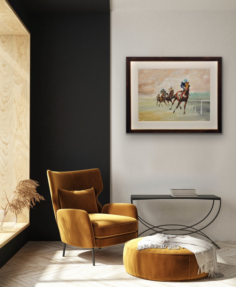 This is a deceptively simple painting of three racehorses galloping on a racetrack, with white rail fencing in the background of an overwise minimal and rural landscape. All three horses are bays. Their jockeys, who are all raised above their saddles, are wearing racing colours, with two of them in navy and turquoise and the third in pink and cream. The horses are painted with such expertise and lightness of touch that there is a real sensation of movement and speed. You can almost hear those hooves thundering down the final straight!