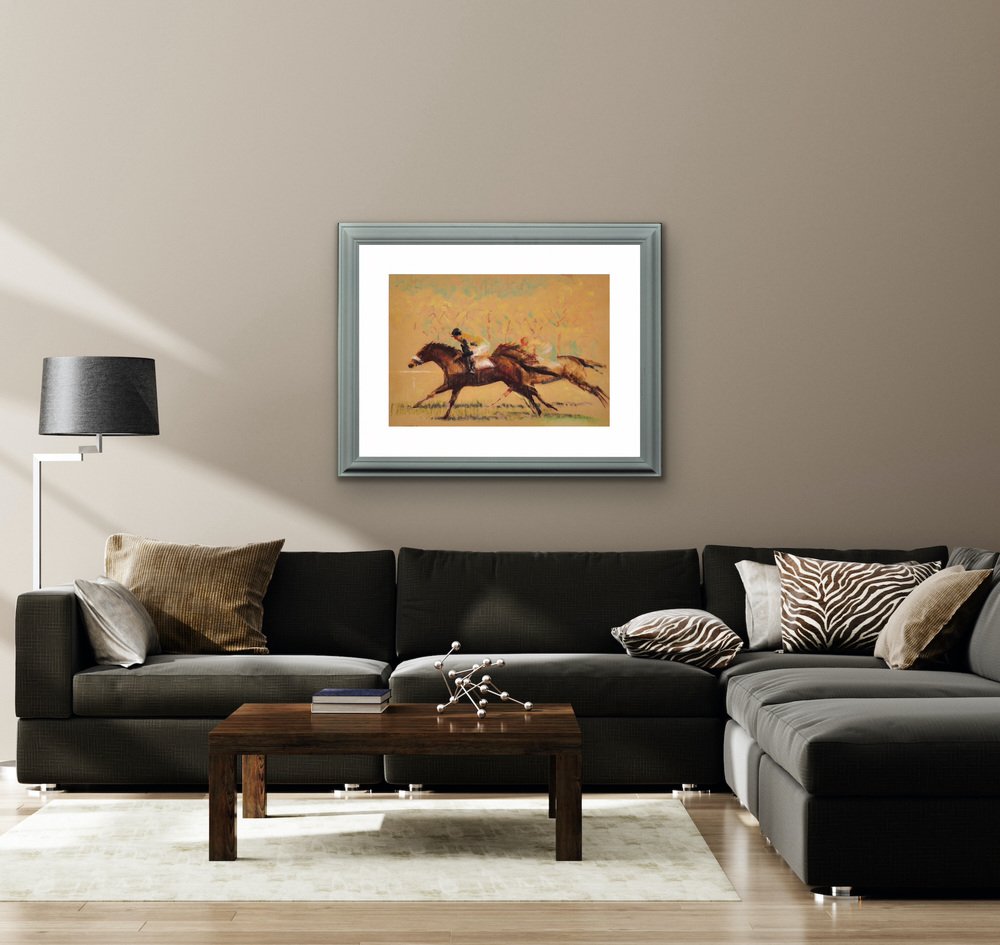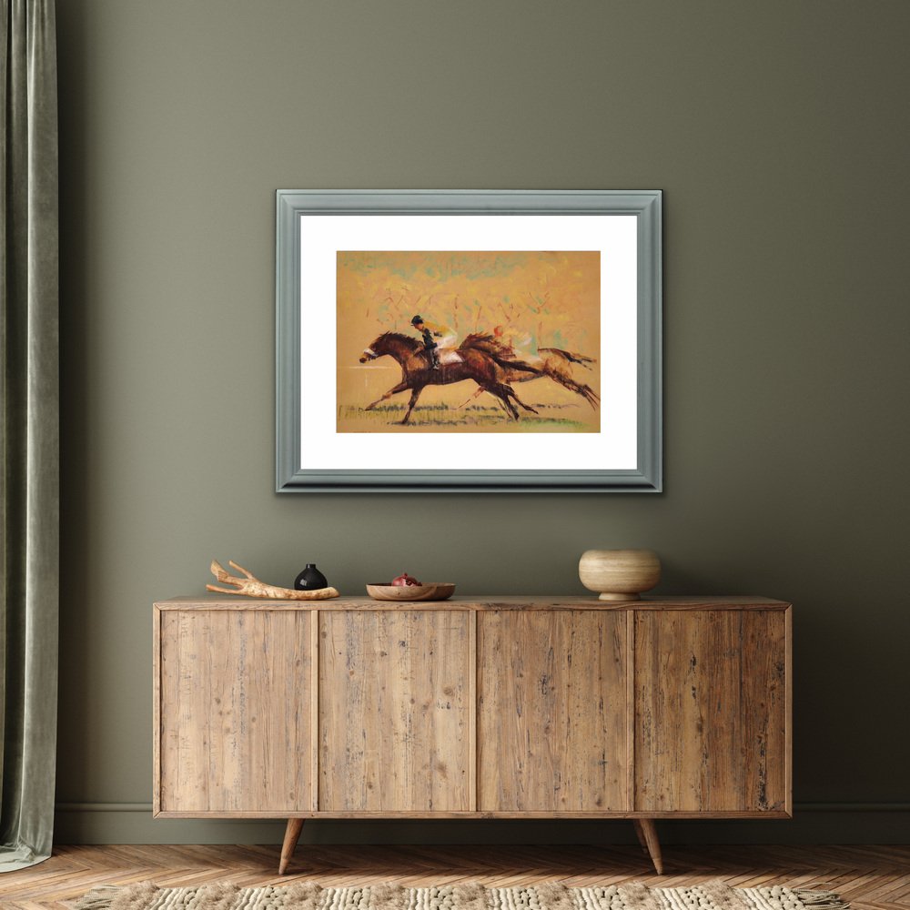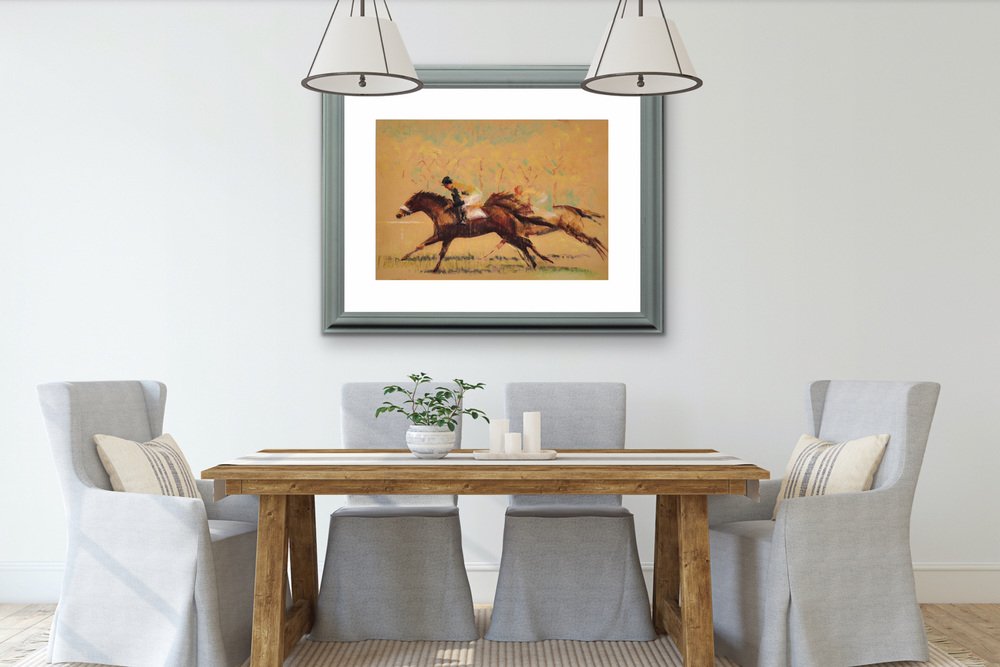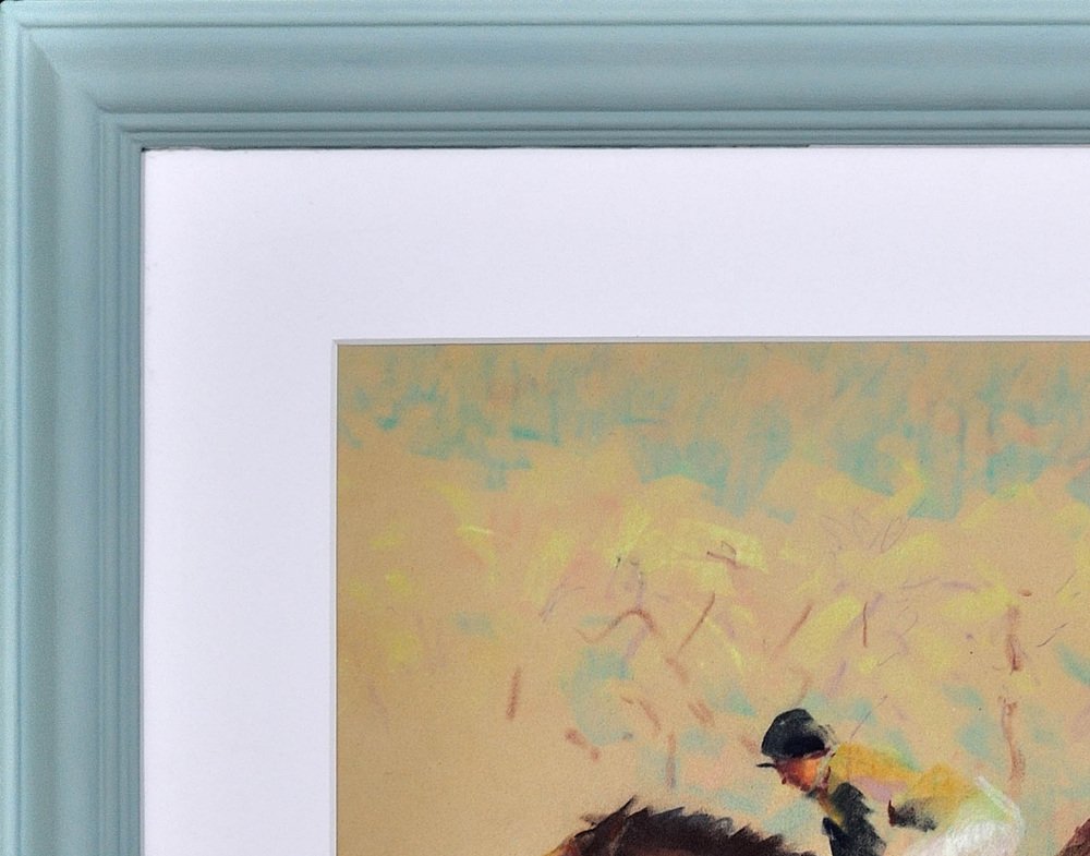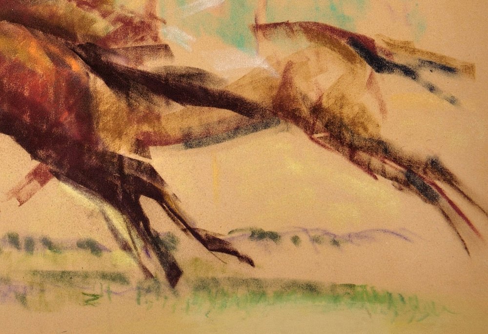 This pastel on paper artwork depicts two racehorses galloping down a racetrack “into the final furlong”; We can almost hear the course commentator on the public address system. It is executed with the lightest of touch, in a manner which perfectly captures the movement of the moment. Both horses are chestnut, or bay. The jockeys wear traditional jodhpurs, silks and caps, one black and one red. The horse nearest to the viewer is in the lead by a neck and is wearing a sheepskin noseband. He is almost the winner, but we cannot be sure how close the finishing post is away …