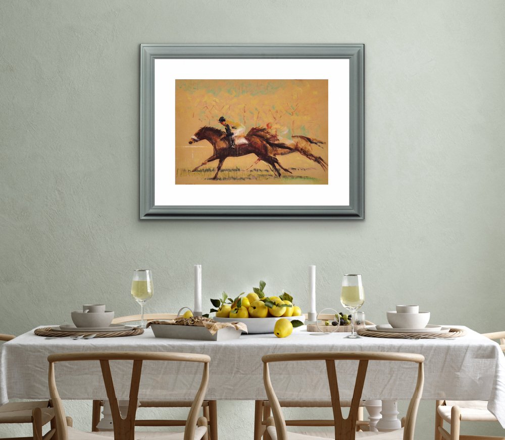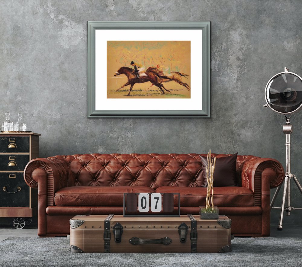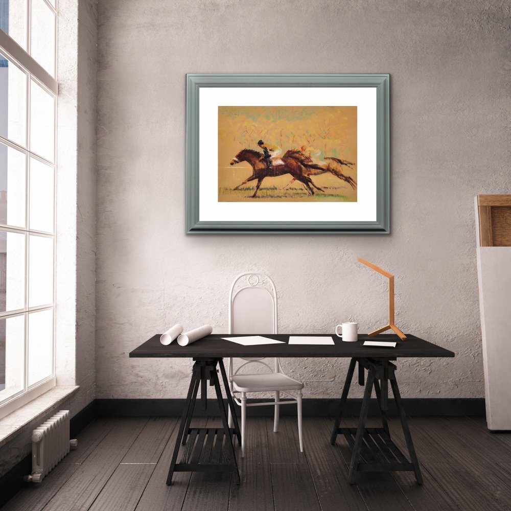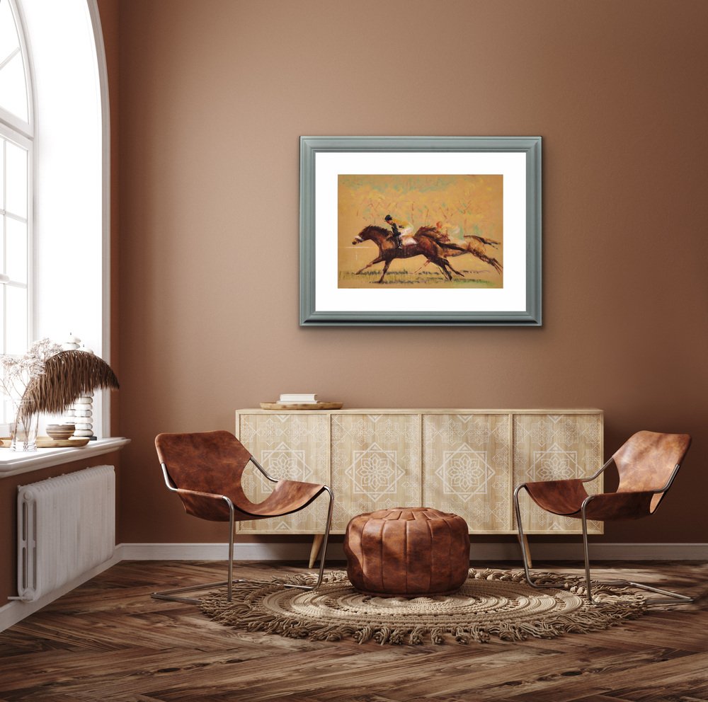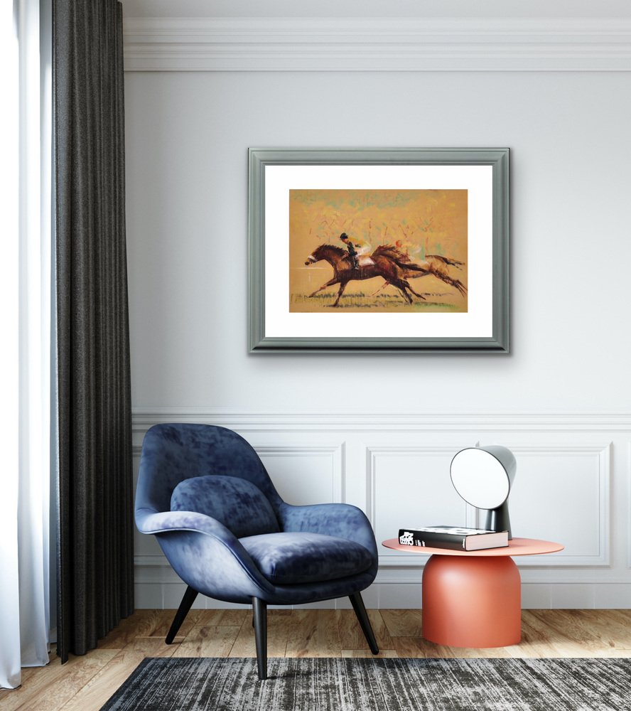 This pastel on paper artwork depicts two racehorses galloping down a racetrack “into the final furlong”; We can almost hear the course commentator on the public address system. It is executed with the lightest of touch, in a manner which perfectly captures the movement of the moment. Both horses are chestnut, or bay. The jockeys wear traditional jodhpurs, silks and caps, one black and one red. The horse nearest to the viewer is in the lead by a neck and is wearing a sheepskin noseband. He is almost the winner, but we cannot be sure how close the finishing post is away …