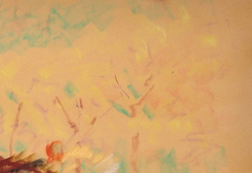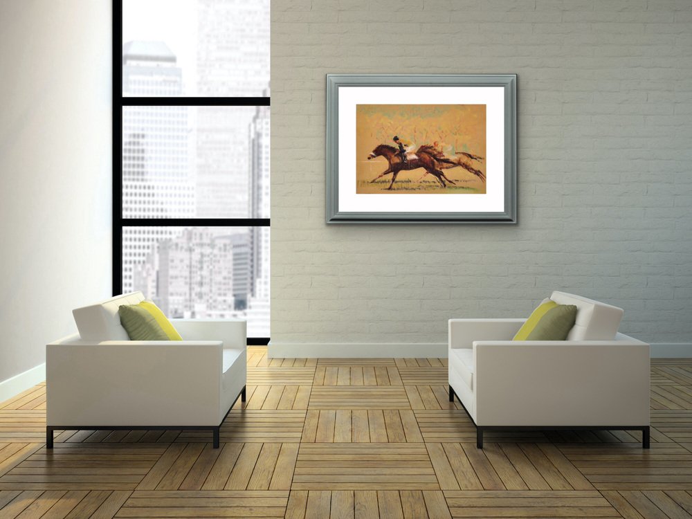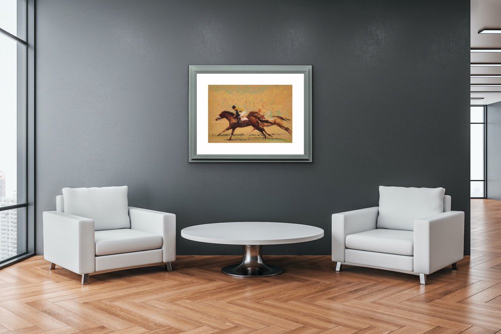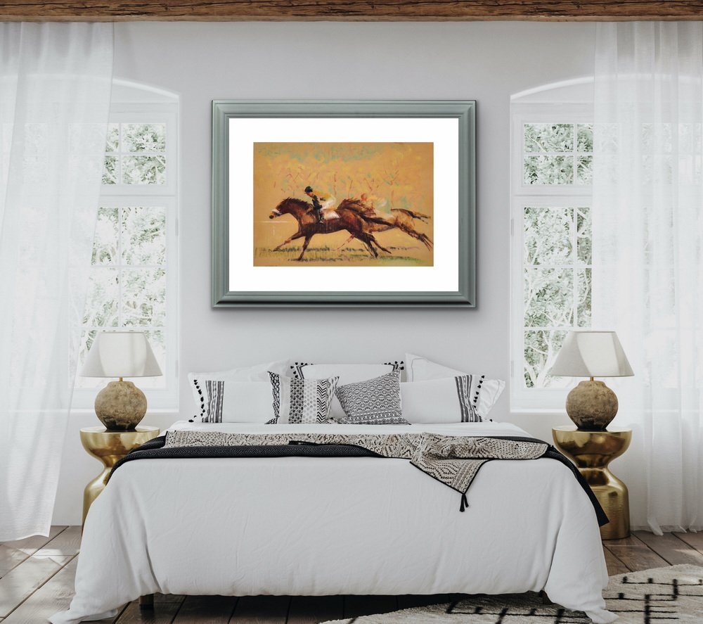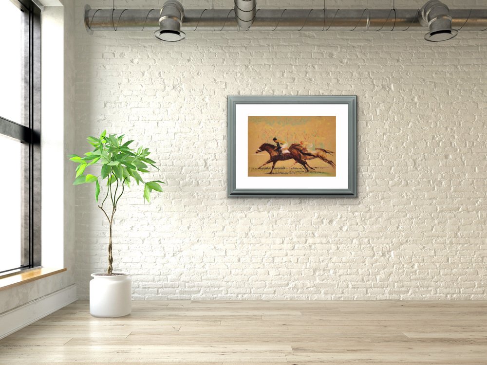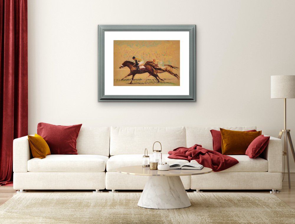 This pastel on paper artwork depicts two racehorses galloping down a racetrack “into the final furlong”; We can almost hear the course commentator on the public address system. It is executed with the lightest of touch, in a manner which perfectly captures the movement of the moment. Both horses are chestnut, or bay. The jockeys wear traditional jodhpurs, silks and caps, one black and one red. The horse nearest to the viewer is in the lead by a neck and is wearing a sheepskin noseband. He is almost the winner, but we cannot be sure how close the finishing post is away …