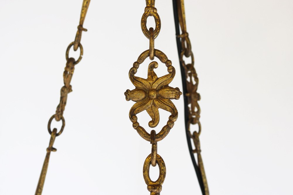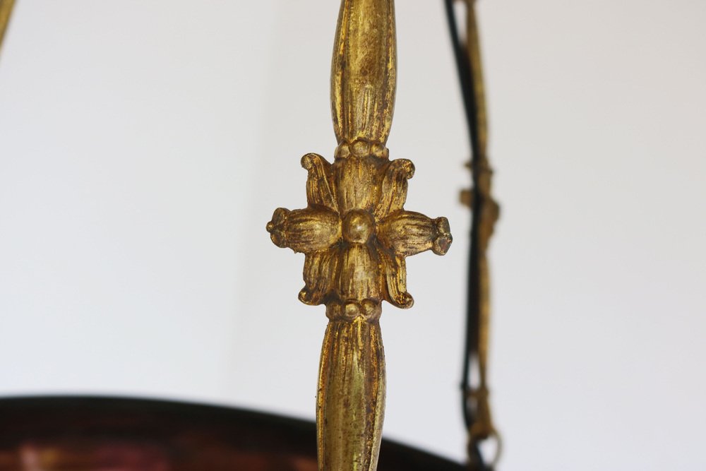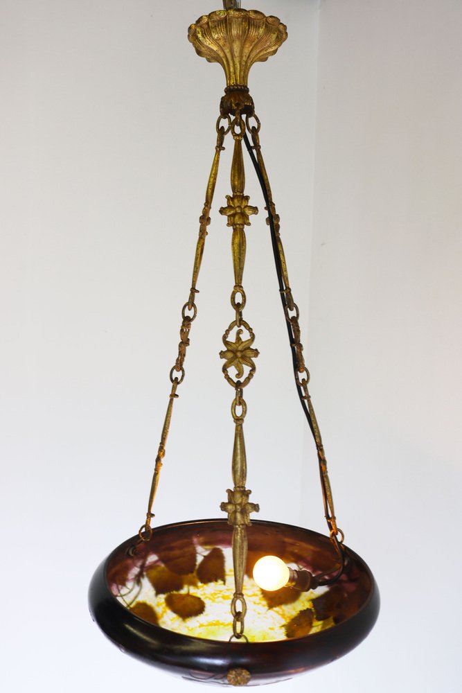 Embrace the beauty of the Art Nouveau era with this exquisite DAUM Nancy chandelier! Crafted in 1910 and signed with the ''Daum Nancy cross the Lorraine'' signature, this stunning piece features delicately etched poplar leaves in rich shades of purple, yellow, brown, and orange on its gorgeous acid etched glass surface. The original and matching bronze floral frame by Atelier Petitot adds a touch of elegance and sophistication, to the masterfully crafted glass shade making this pedant a breathtaking master piece. Each link of the chain and the canopy are all marked with A.P. by petitot. This Daum chandelier remains in gorgeous condition with only traces of age on the frame. Fully original and a real collectors piece, rewired & ready for safe use