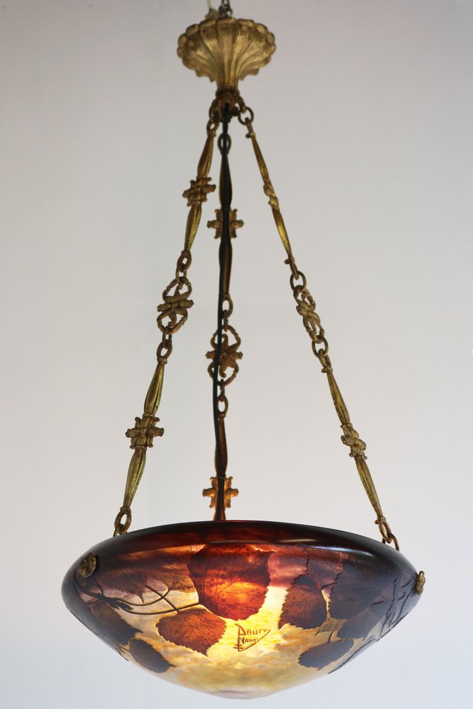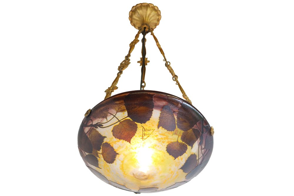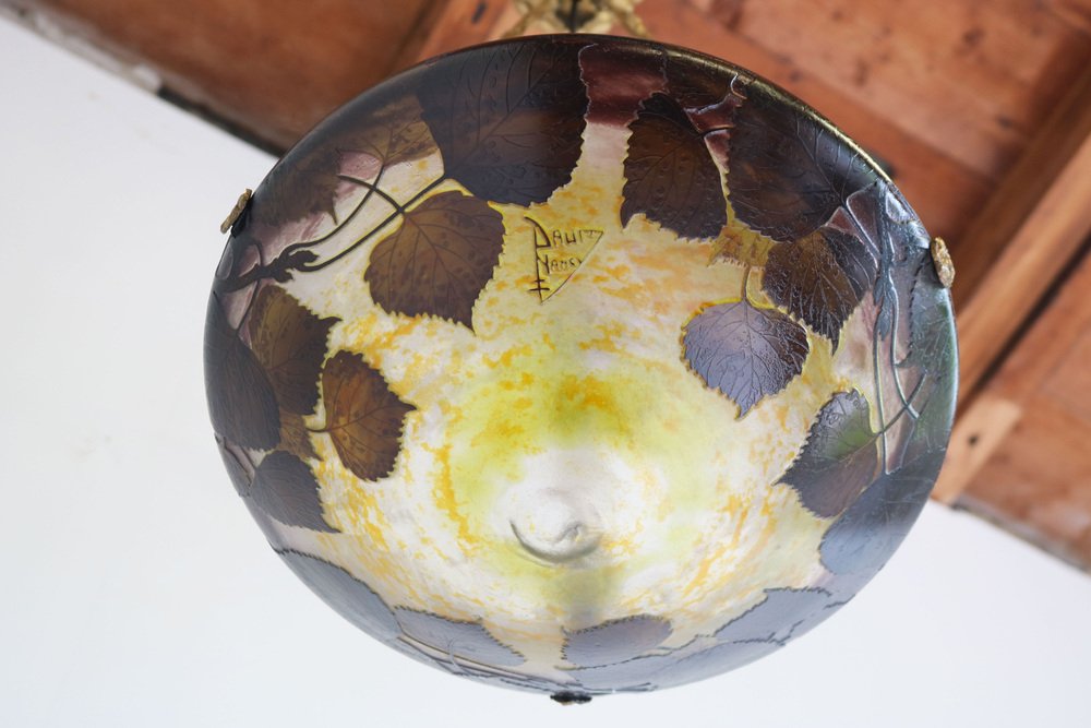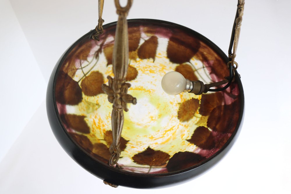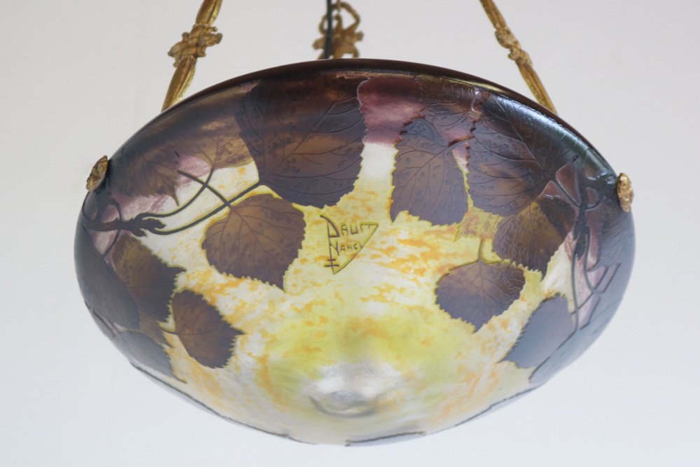 Genießen Sie die Schönheit des Jugendstils mit diesem exquisiten DAUM Nancy Kronleuchter! Das 1910 gefertigte und mit der Signatur "Daum Nancy cross the Lorraine" signierte Stück besticht durch fein geätzte Pappelblätter in satten Violett-, Gelb-, Braun- und Orangetönen auf der wunderschönen, geätzten Glasoberfläche. Der originelle und passende bronzene Blumenrahmen von Atelier Petitot verleiht dem meisterhaft gefertigten Glasschirm einen Hauch von Eleganz und Raffinesse und macht diese Pedant zu einem atemberaubenden Meisterwerk. Jedes Glied der Kette und der Baldachin sind mit A.P. by petitot gekennzeichnet. Dieser Daum-Kronleuchter befindet sich in einem ausgezeichneten Zustand und weist lediglich Altersspuren am Rahmen auf. Völlig original und ein echtes Sammlerstück, neu verkabelt und bereit für den sicheren Gebrauch