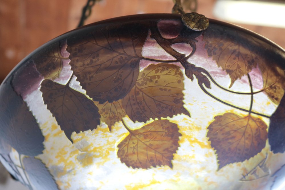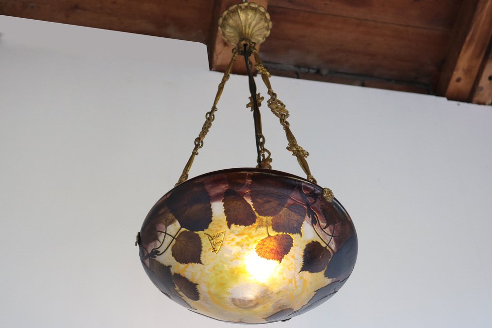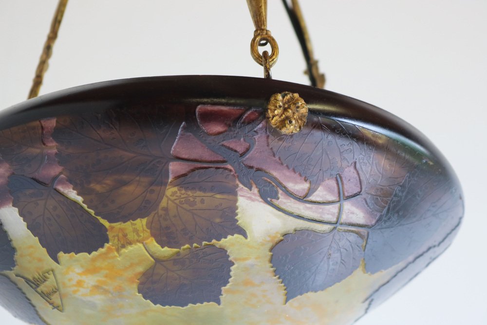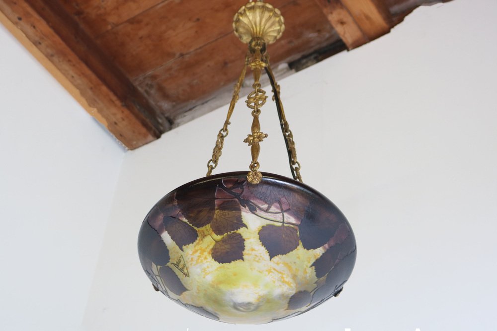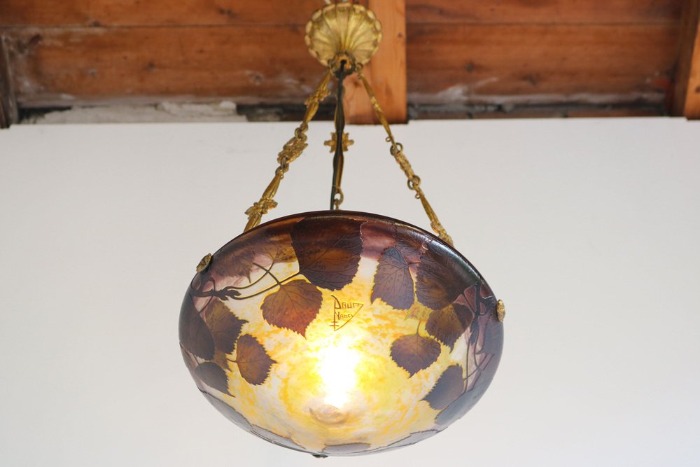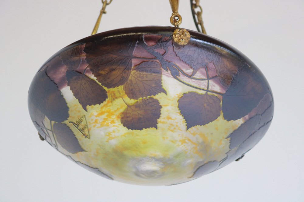 Genießen Sie die Schönheit des Jugendstils mit diesem exquisiten DAUM Nancy Kronleuchter! Das 1910 gefertigte und mit der Signatur "Daum Nancy cross the Lorraine" signierte Stück besticht durch fein geätzte Pappelblätter in satten Violett-, Gelb-, Braun- und Orangetönen auf der wunderschönen, geätzten Glasoberfläche. Der originelle und passende bronzene Blumenrahmen von Atelier Petitot verleiht dem meisterhaft gefertigten Glasschirm einen Hauch von Eleganz und Raffinesse und macht diese Pedant zu einem atemberaubenden Meisterwerk. Jedes Glied der Kette und der Baldachin sind mit A.P. by petitot gekennzeichnet. Dieser Daum-Kronleuchter befindet sich in einem ausgezeichneten Zustand und weist lediglich Altersspuren am Rahmen auf. Völlig original und ein echtes Sammlerstück, neu verkabelt und bereit für den sicheren Gebrauch