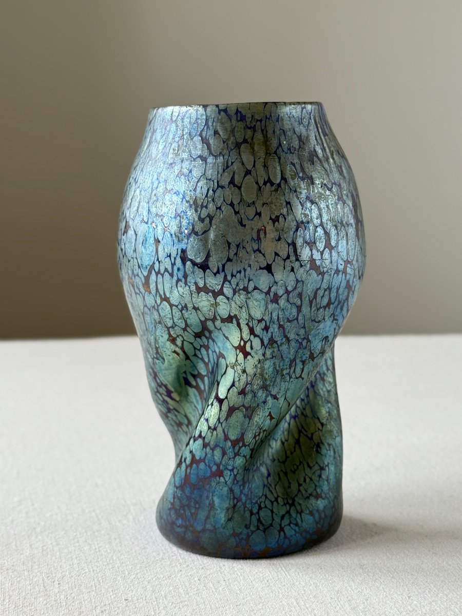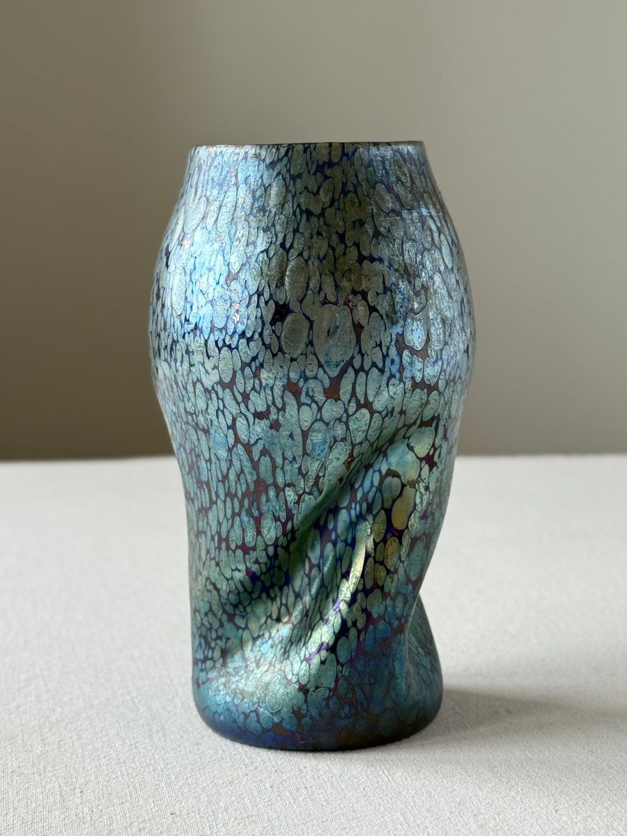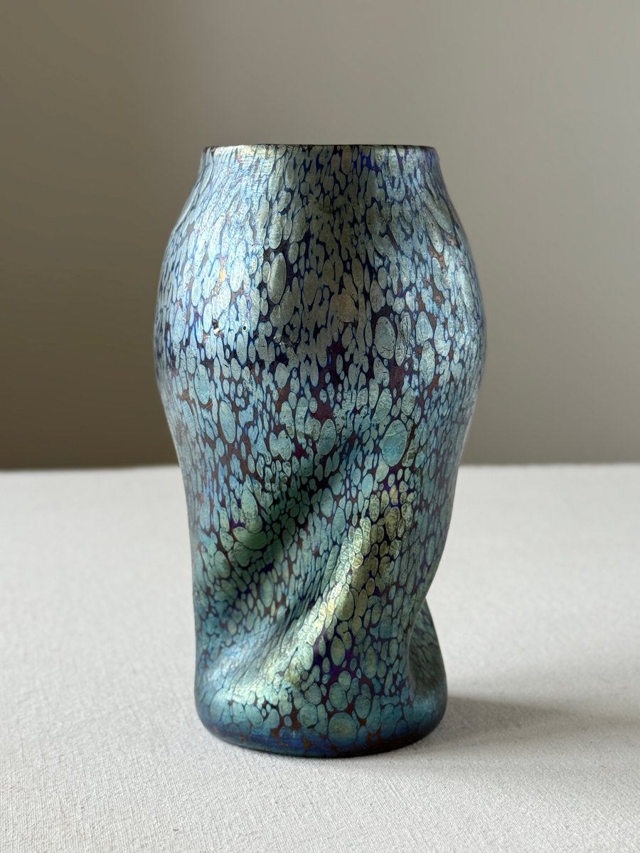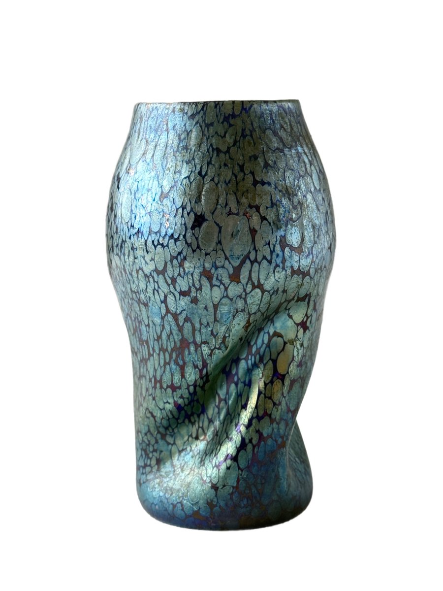 The organically shaped body with its subtle twisted form enhances the fluid, dynamic aesthetics typical of Art Nouveau and lends the piece a sculptural presence. The changing reflections and colour transitions — responding to movement and light — exemplify the unique optical qualities that made Loetz’s iridescent glass internationally admired.