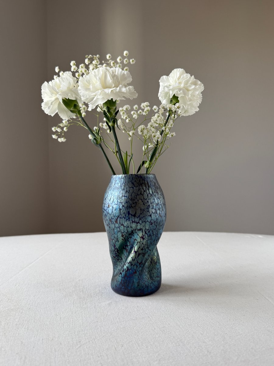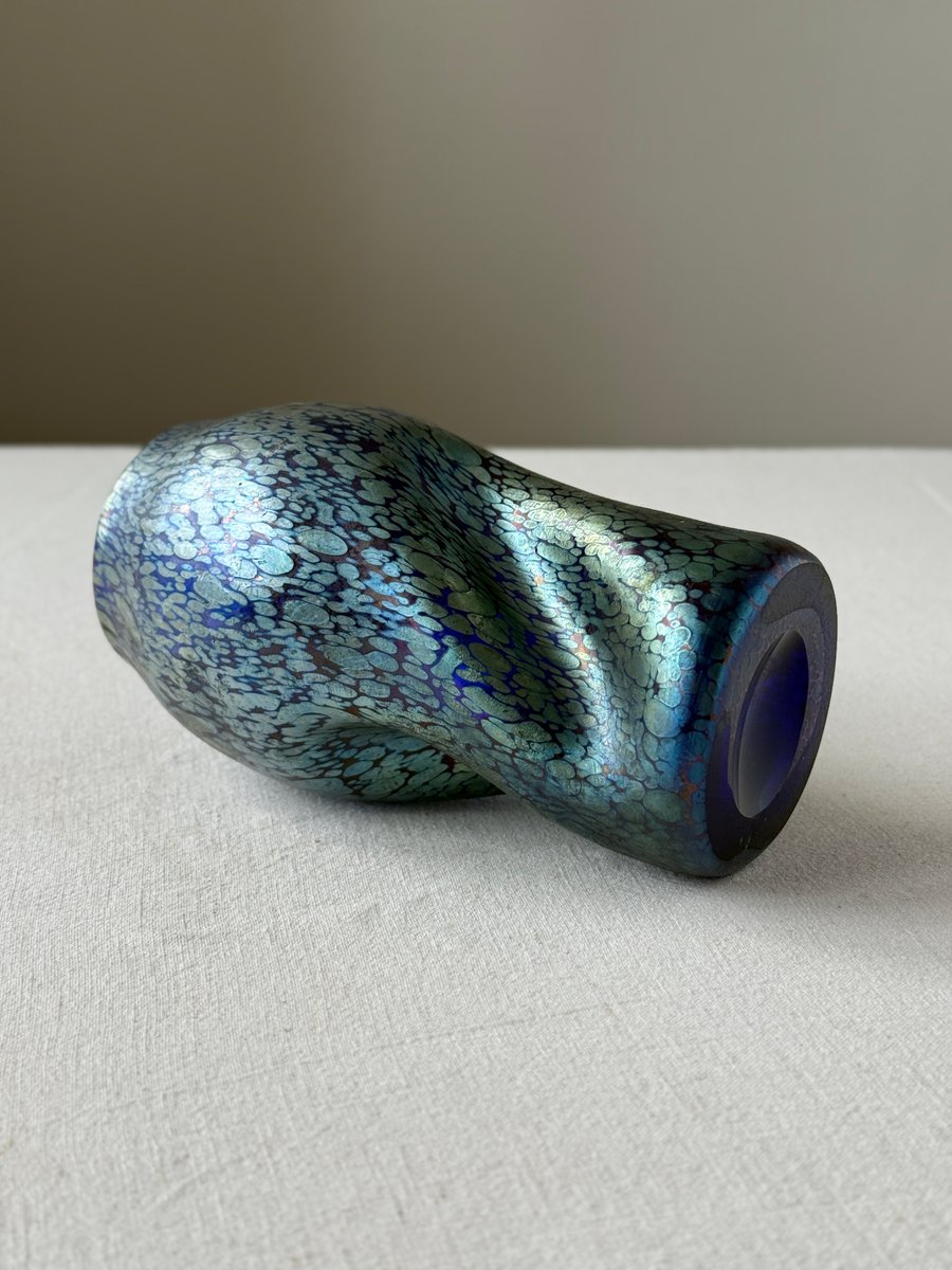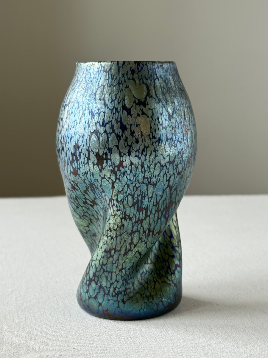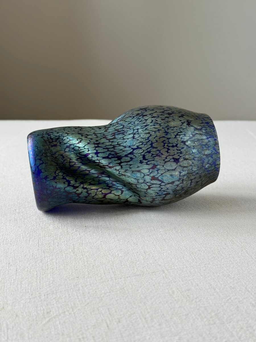 The organically shaped body with its subtle twisted form enhances the fluid, dynamic aesthetics typical of Art Nouveau and lends the piece a sculptural presence. The changing reflections and colour transitions — responding to movement and light — exemplify the unique optical qualities that made Loetz’s iridescent glass internationally admired.