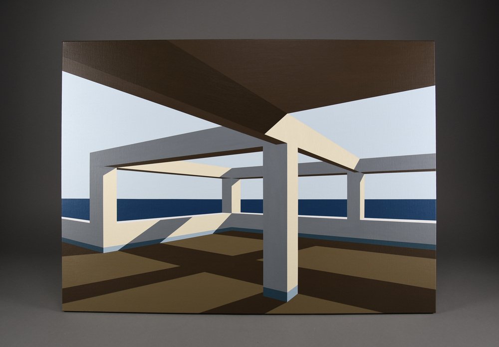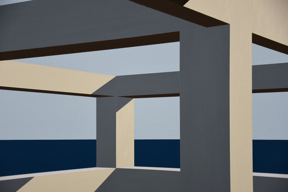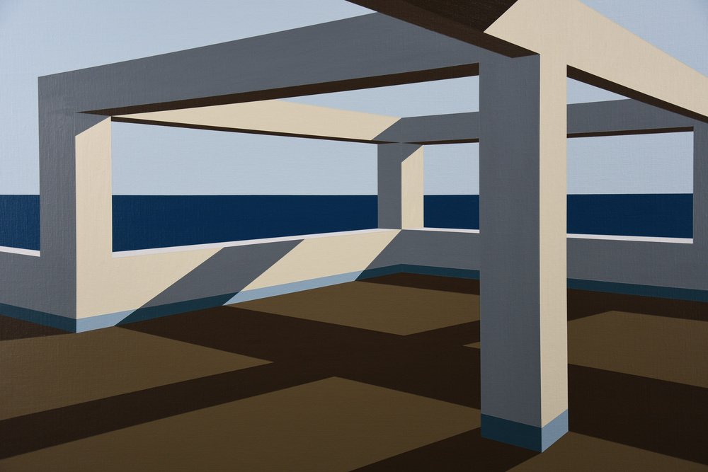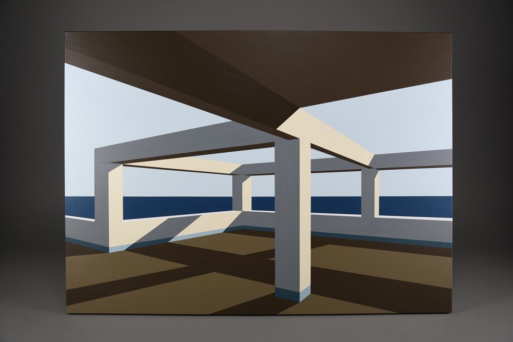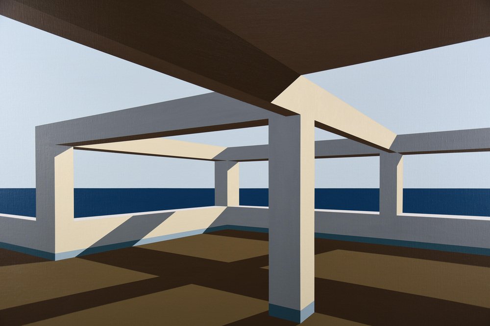 In Arteaga, Jurriaan Molenaar translates his lifelong fascination with space, light, perspective, and structure into a serene yet powerful visual language. Painted in acrylic on linen, this series of four large-scale works—three measuring 80 x 110 cm (31.5 x 43.3 in.) and one commanding piece of 120 x 150 cm (47.2 x 59.1 in.)—is based on an open architectural framework by the sea. One of the 80 x 110 has recently been sold.