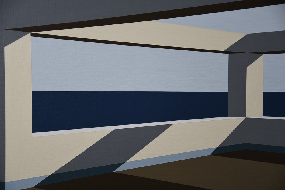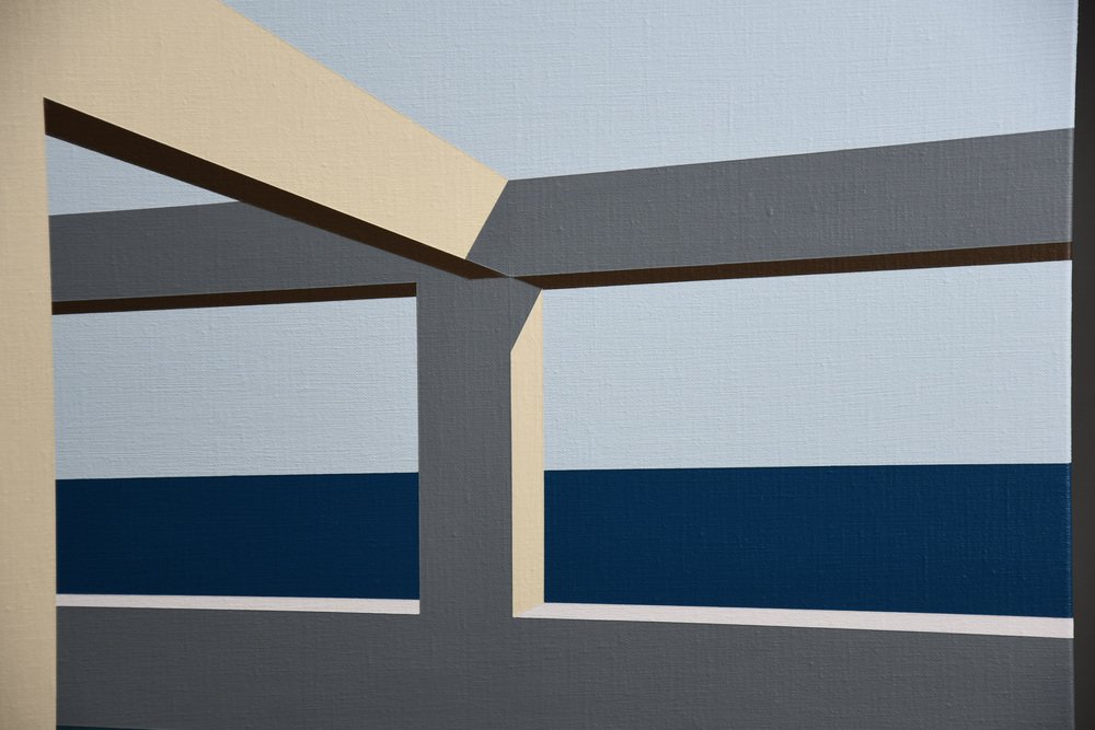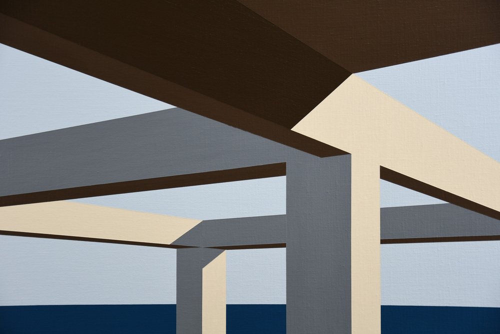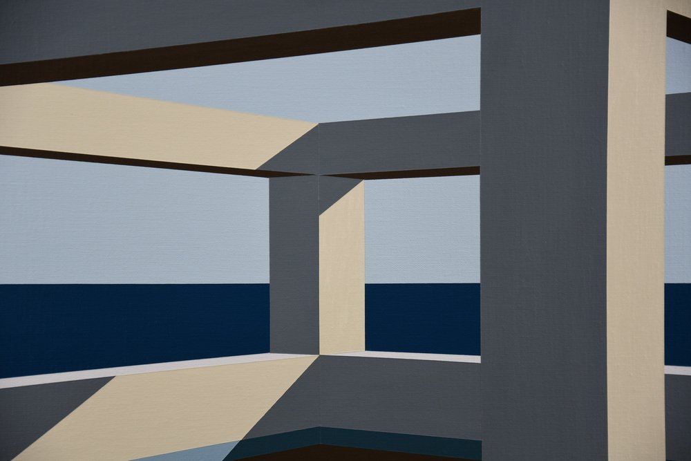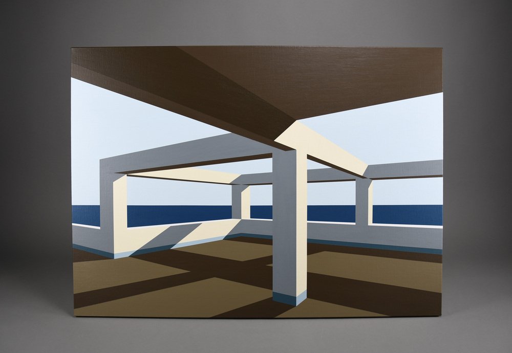 In Arteaga, Jurriaan Molenaar translates his lifelong fascination with space, light, perspective, and structure into a serene yet powerful visual language. Painted in acrylic on linen, this series of four large-scale works—three measuring 80 x 110 cm (31.5 x 43.3 in.) and one commanding piece of 120 x 150 cm (47.2 x 59.1 in.)—is based on an open architectural framework by the sea. One of the 80 x 110 has recently been sold.