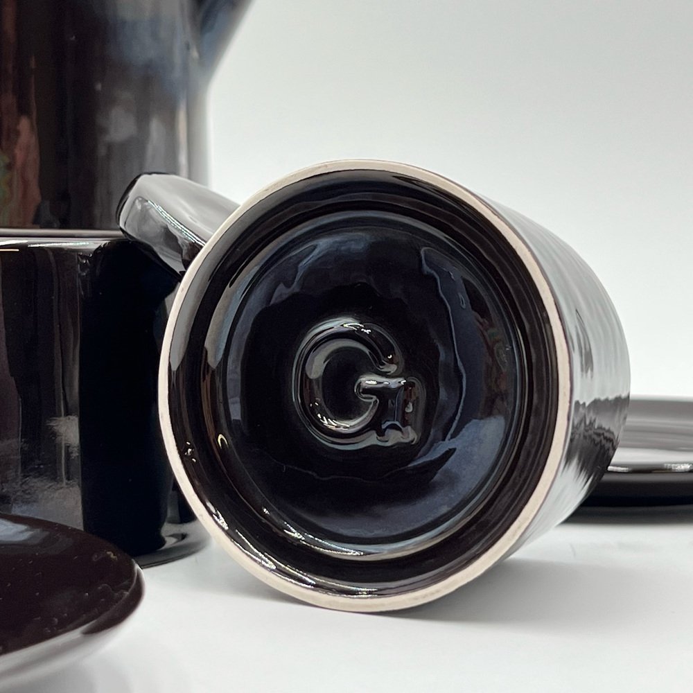 Dieses unauffindbare Set ist komplett und besteht aus sechs Tassen, sechs Tellern, einer Karaffe und einer Zuckerdose (14 Teile). Alle Stücke sind mit der Herstellermarke "G" versehen.