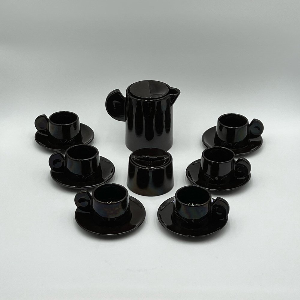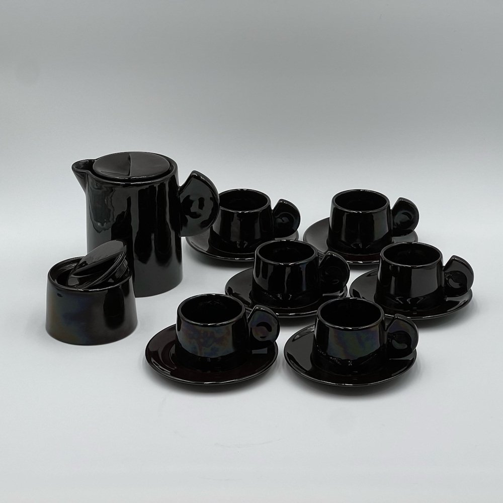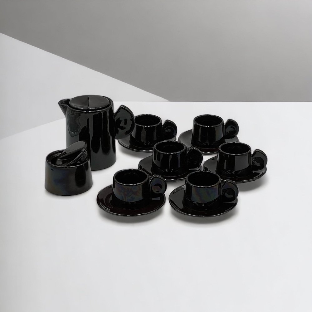 This is a rare and distinctive vintage set of 6 coffee cups with matching plates, carafe and sugar bowl manufactured by the famous Italian maker Gabbianelli in the 60s.