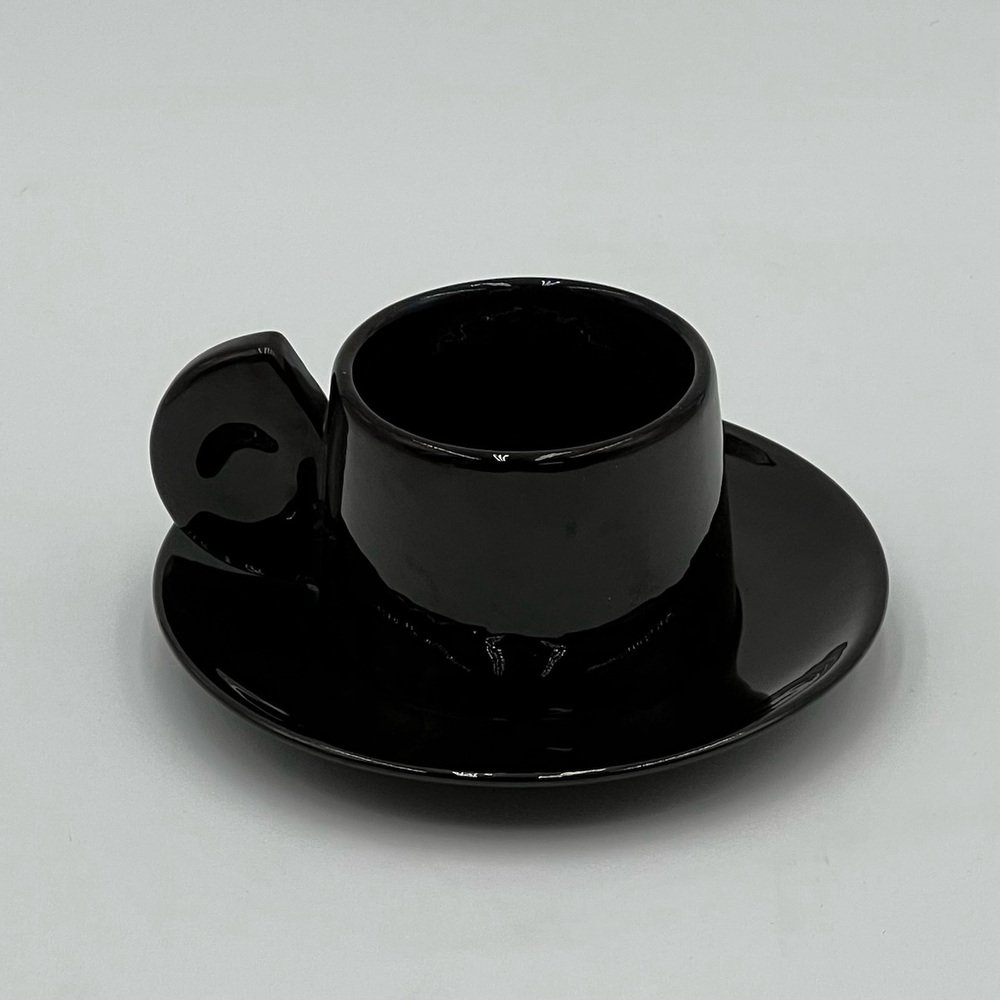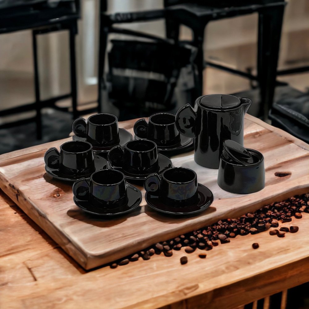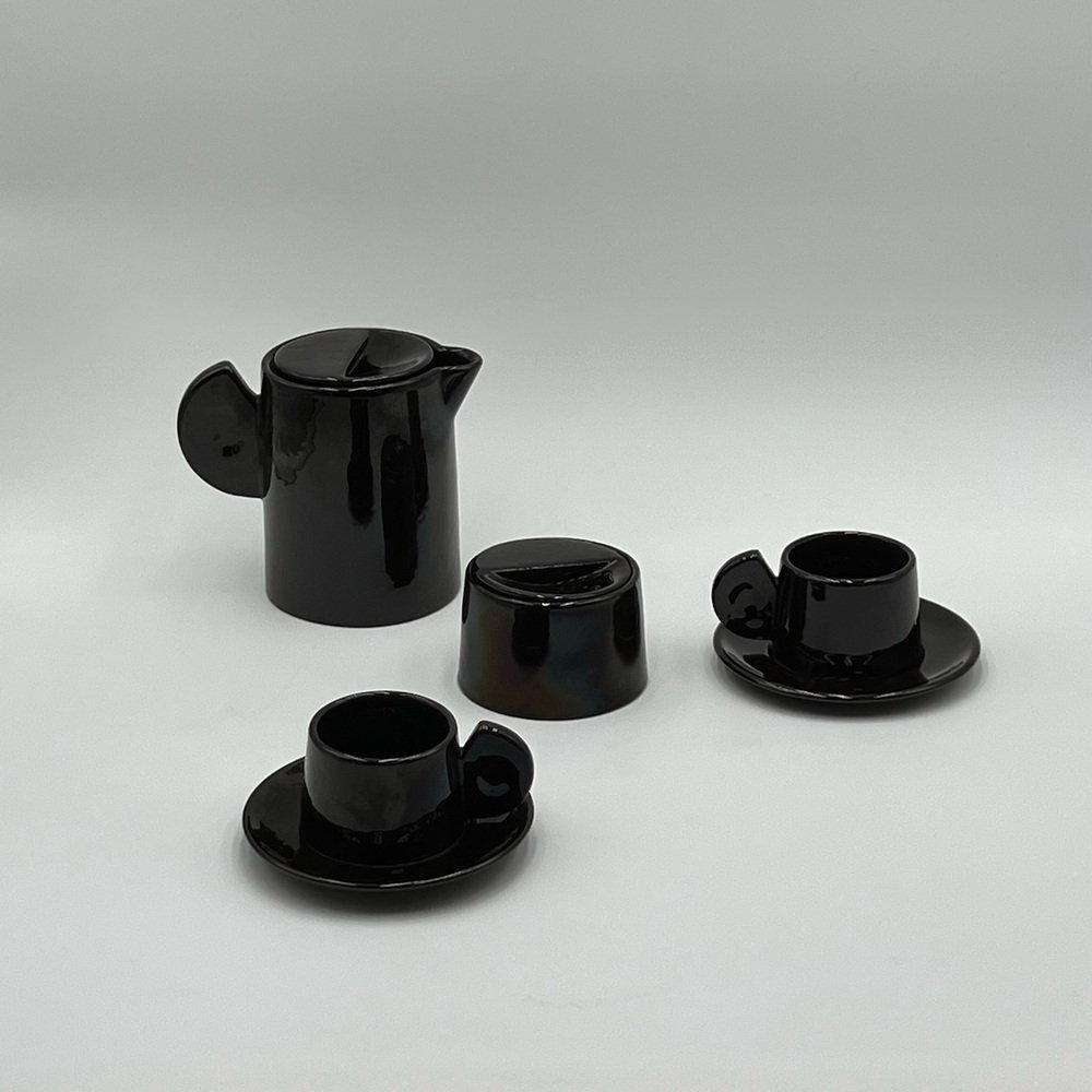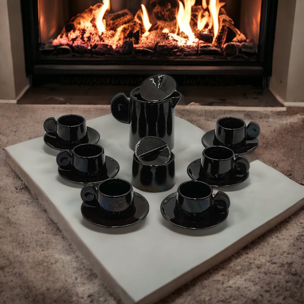 This is a rare and distinctive vintage set of 6 coffee cups with matching plates, carafe and sugar bowl manufactured by the famous Italian maker Gabbianelli in the 60s.