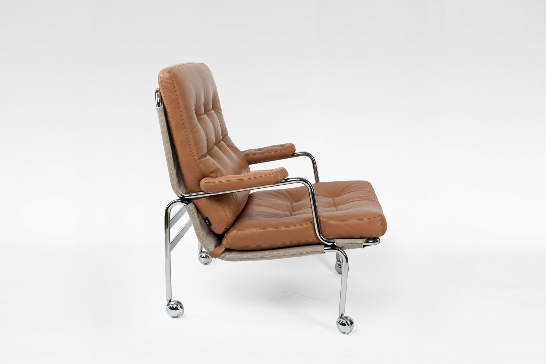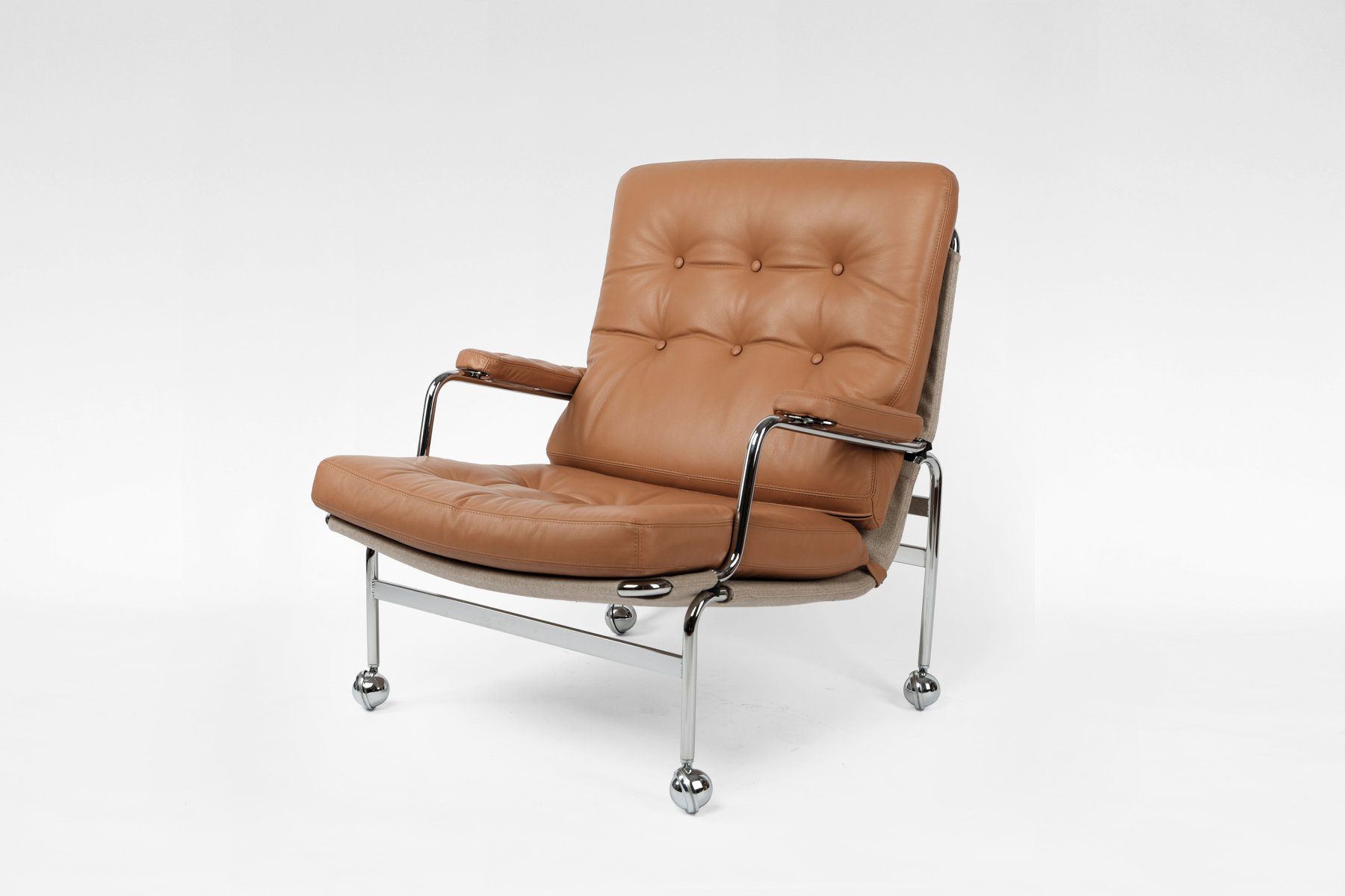 A beautiful example of Swedish modernism, this vintage Karin Lounge Chair by Bruno Mathsson for DUX (late 1960s) embodies the designer’s mastery of comfort and structural lightness. The polished chrome frame remains fully original and exceptionally well-preserved, while the cushions have been refreshed in warm cognac leather, restoring softness and depth without altering the chair’s authentic character. Elegant, architectural, and effortlessly comfortable, Karin stands as one of Mathsson’s most iconic designs, prized by collectors for its timeless balance of transparency and refinement.