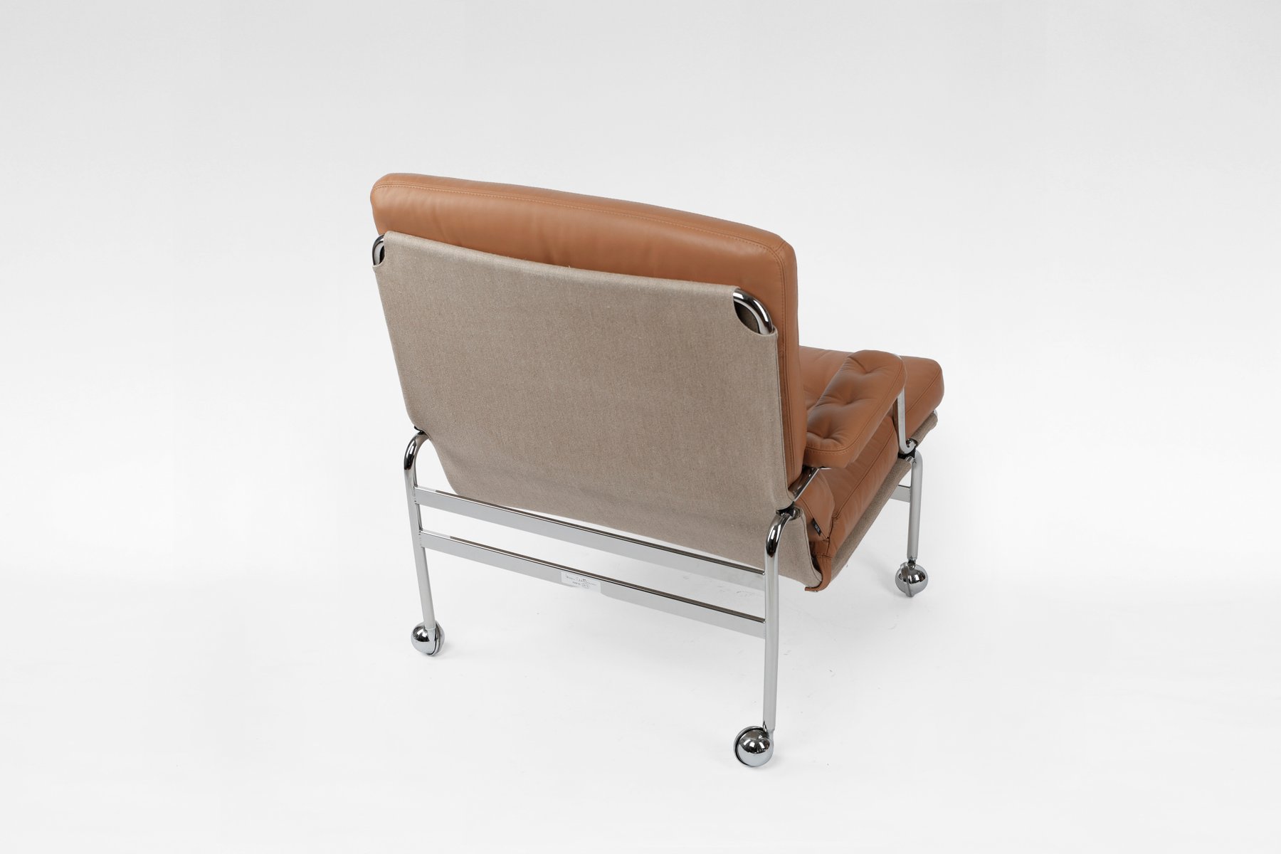 Dieser Karin Lounge Chair von Bruno Mathsson für DUX (Ende der 1960er Jahre) ist ein schönes Beispiel für die schwedische Moderne und verkörpert die Meisterschaft des Designers in Bezug auf Komfort und strukturelle Leichtigkeit. Das polierte Chromgestell ist noch vollständig original und außergewöhnlich gut erhalten, während die Kissen in warmem cognacfarbenem Leder aufgefrischt wurden, was dem Sessel seine Weichheit und Tiefe zurückgibt, ohne seinen authentischen Charakter zu verändern. Elegant, architektonisch und mühelos bequem - Karin ist eines der ikonischsten Designs von Mathsson und wird von Sammlern wegen seiner zeitlosen Balance aus Transparenz und Raffinesse geschätzt.