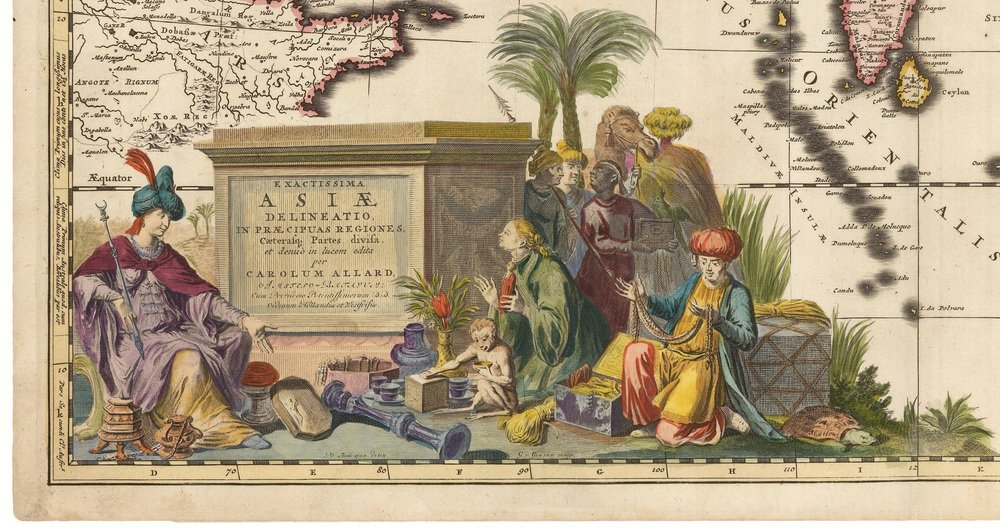Eine hochdekorative Karte Asiens, abgeleitet von Nicolaas Witsens 4-Blatt-Karte von 1687, mit einem Einschub oben rechts, der die nördlichen Ausläufer Sibiriens zeigt.