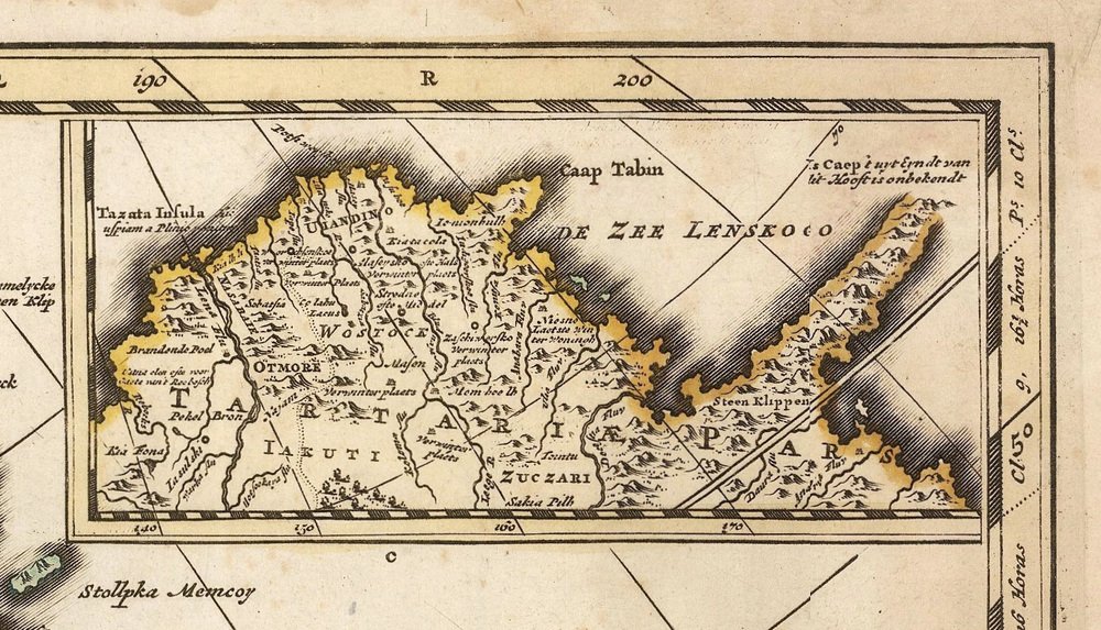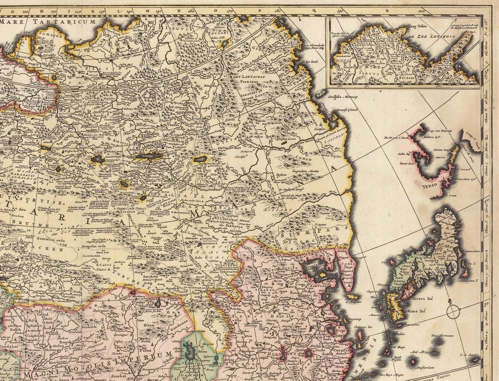 A highly decorative map of Asia, derived from Nicolaas Witsen's 4-sheet map of 1687, with an inset top right showing the northern extemities of Siberia.