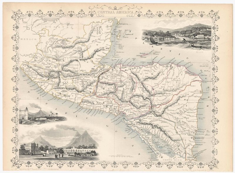 A mid-19th century map of Guatemala, El Salvador, Honduras, Nicaragua and Belize, with an ornate border and vignette views of Antigua Guatemala, Belize and the Volcano of Isalco. The map was drawn and engraved by John Rapkin for the 'The Illustrated Atlas, and Modern History of the World, Geographical Political, Commercial & Statistical', edited by Montgomery Martin, which was one of the last decorative atlases to be published.