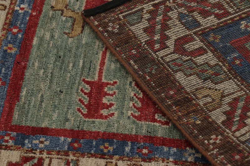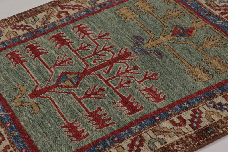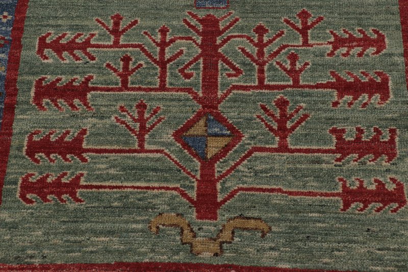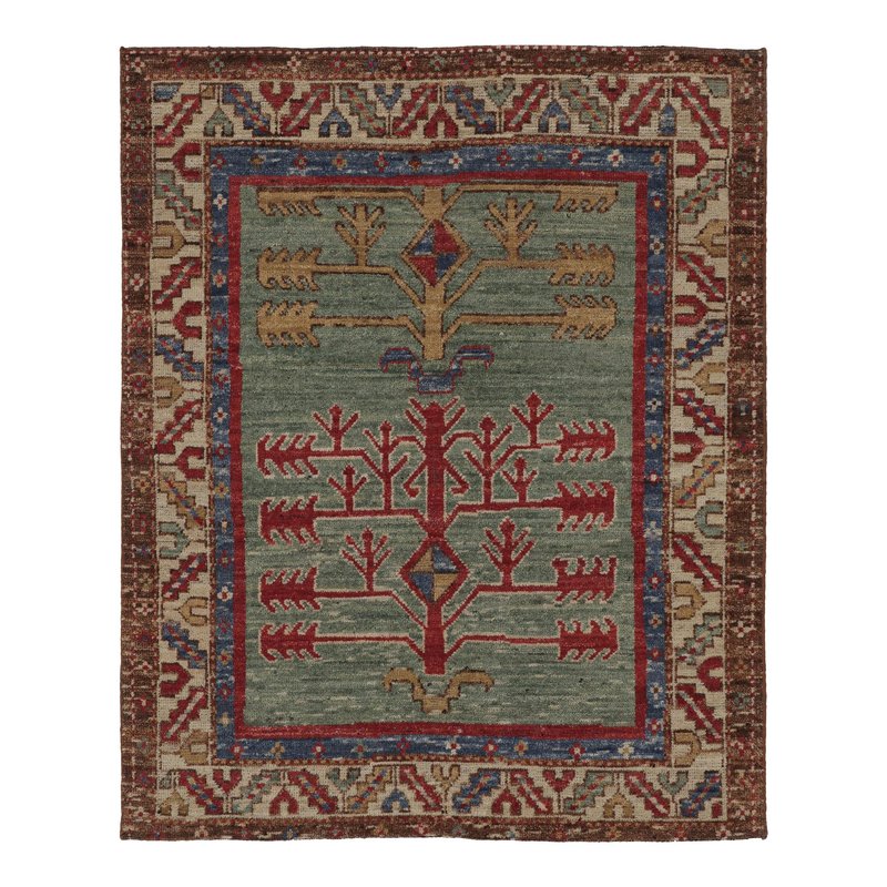 Hand-knotted in a special blend of Ghazni wool, this 3x4 rug from the custom-classics Burano Collection by Rug&Kilim is inspired by mid-19th-century antique Caucasian rug design—particularly one of Kuba provenance. On the Design: This rug is a vivid tapestry of tribal symbolism, drawing direct inspiration from the clear drawing and sophisticated geometry characteristic of Caucasian Kuba provenance. The central field is rendered in a soft, striated sage green/celadon, which serves as the backdrop for a powerful, centralized Tree of Life motif. This sacred figure is defined by strong, stylized branches in both mustard yellow (at the top) and rich red (at the base). Keen eyes will note the minimalist geometric interpretations of pictorial designs woven into the field and emerging from the central tree, which keen eyes will recognize as tribal illustrations of animals—with those here most closely resembling abstract dogs, horses, or birds. The border system is complex and warm, featuring guard bands of geometric diamonds and stylized motifs in deep brick red and warm browns. Admirers of the craft will further appreciate an especially soft, comfortable texture and beauty inherent to the Ghazni wool that underscores this piece. It’s an intentional contribution to a classic for a more contemporary level of comfort, and one of the many beauties that makes the Burano collection a sophisticated, smart new language in design.