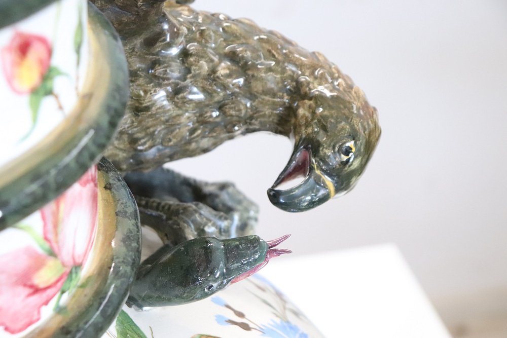 Sunning, large vase, made in Italy, dating back to the early 20th century. The vase is crafted from polychrome glazed ceramic. The eye-catching decoration captures the eye with its magnificent, large flowers. Two large relief figures create a dramatic effect with a three-dimensional decoration: a crocodile and an eagle battling around the vase. Look closely at every detail of this vase and you'll be truly amazed.