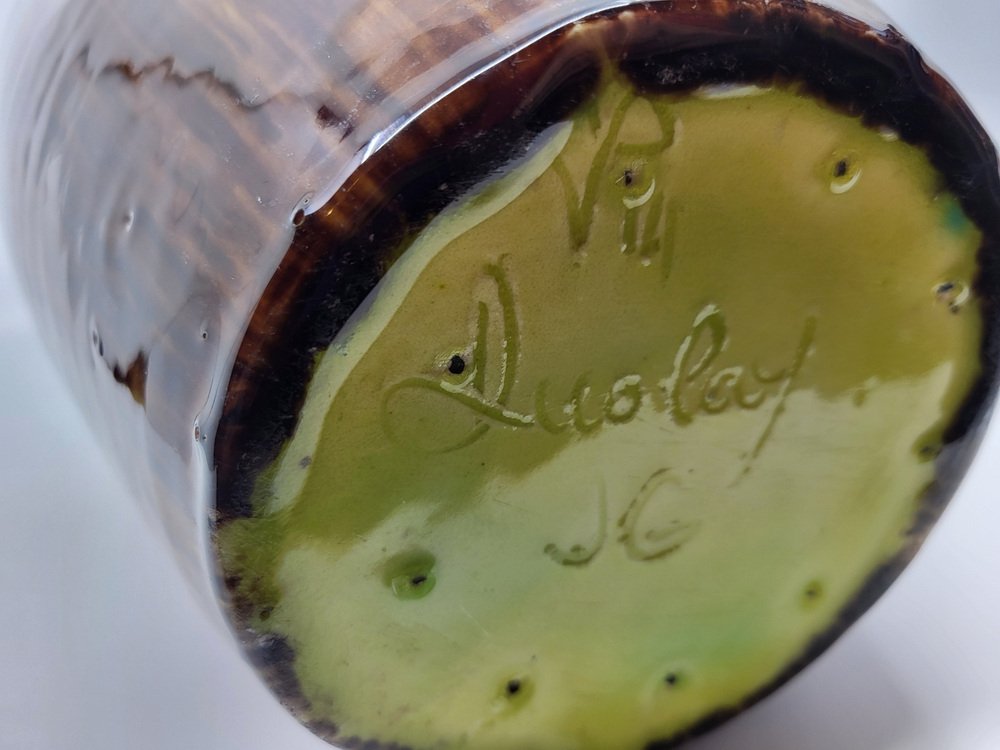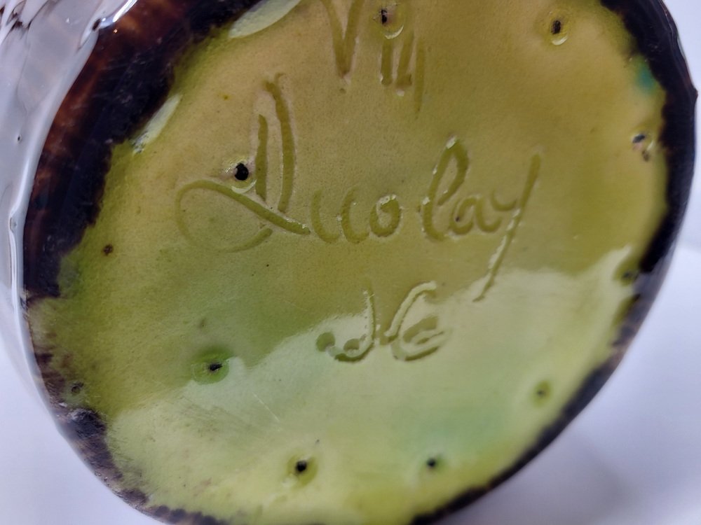 Große Dinosaurier-Vase aus der Accolay-Töpferei, die 40 cm hoch ist und einen Durchmesser von 22 cm hat. In hervorragendem Zustand, seine Größe und Farben sind wirklich spektakulär, unweigerlich ziehen das Auge. Diese Vase ist nicht nur eine handwerkliche Meisterleistung, sondern auch ein echtes Zeugnis für die Leidenschaft und das Können der Accolay-Künstler. Ihre akribische Arbeit und ihre Fähigkeit, Funktionalität und Ästhetik zu verbinden, machen jedes Stück zu einem einzigartigen Kunstwerk. Diese Vase eignet sich sowohl zur Verschönerung Ihres Zuhauses als auch als dekoratives Element für besondere Anlässe.