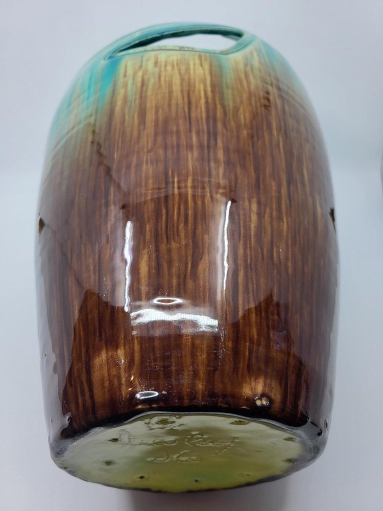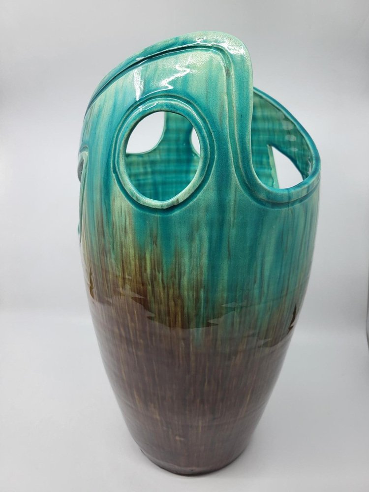 Large dinosaur vase from the Accolay pottery, measuring 40 cm in height and 22 cm in diameter. In superb condition, its size and colors are truly spectacular, inevitably drawing the eye. This vase is not only a feat of craftsmanship but also a true testament to the passion and expertise of Accolay's artisans. Their meticulous work and their ability to combine functionality and aesthetics make each piece a unique work of art. Indeed, this vase is ideal both for enhancing your home and as a decorative element for special occasions.