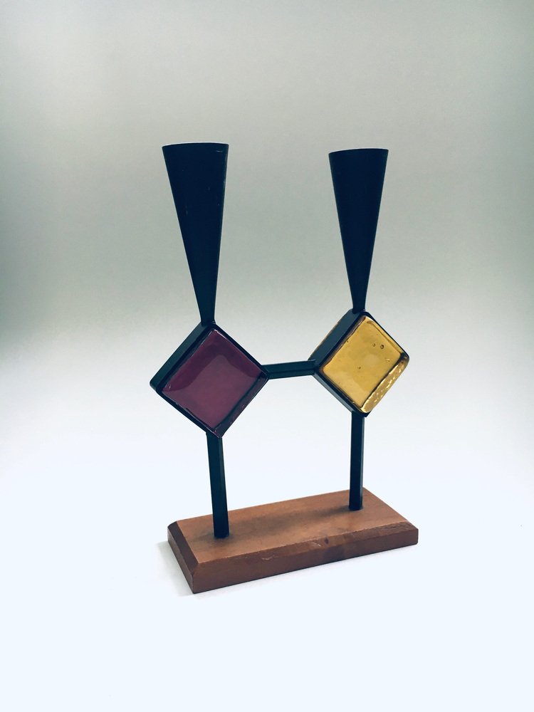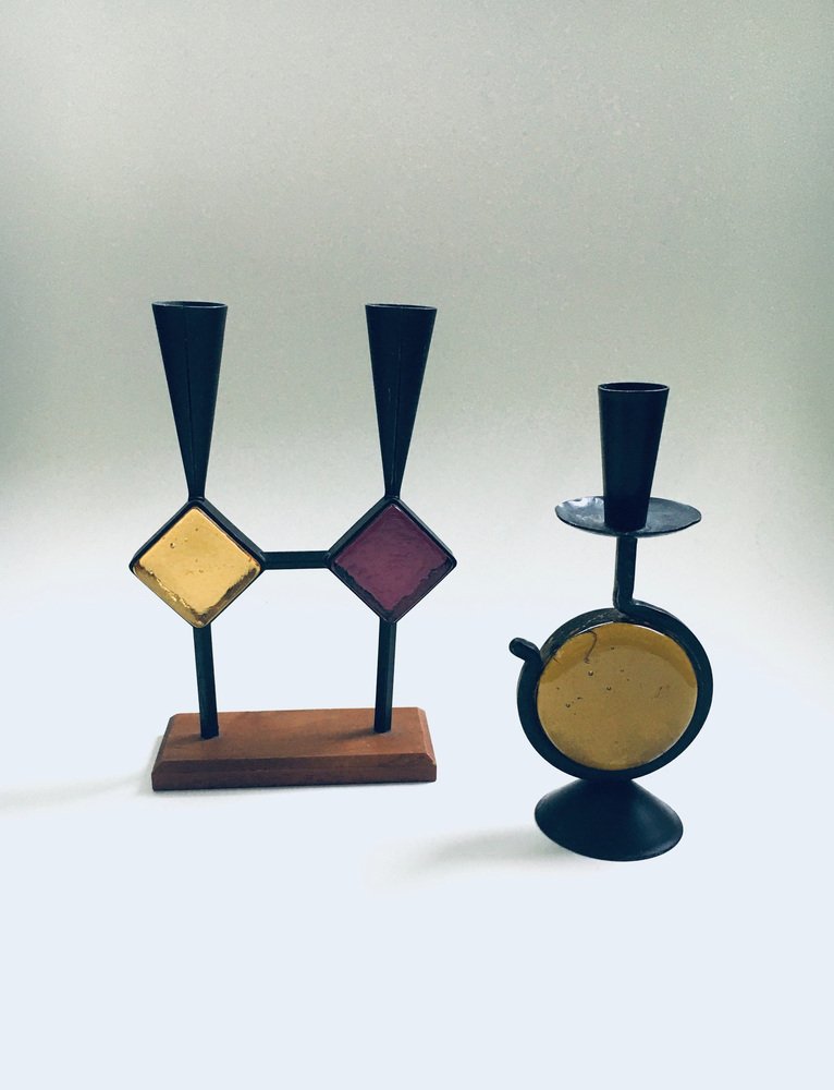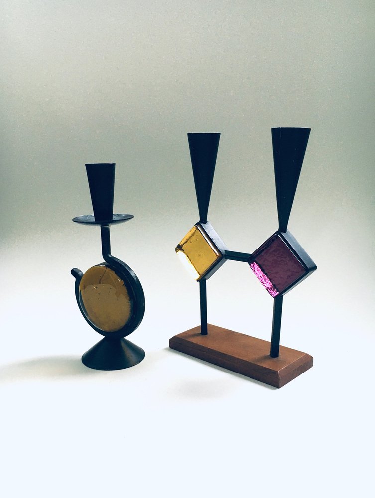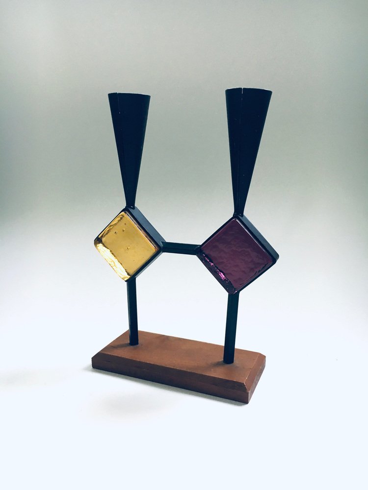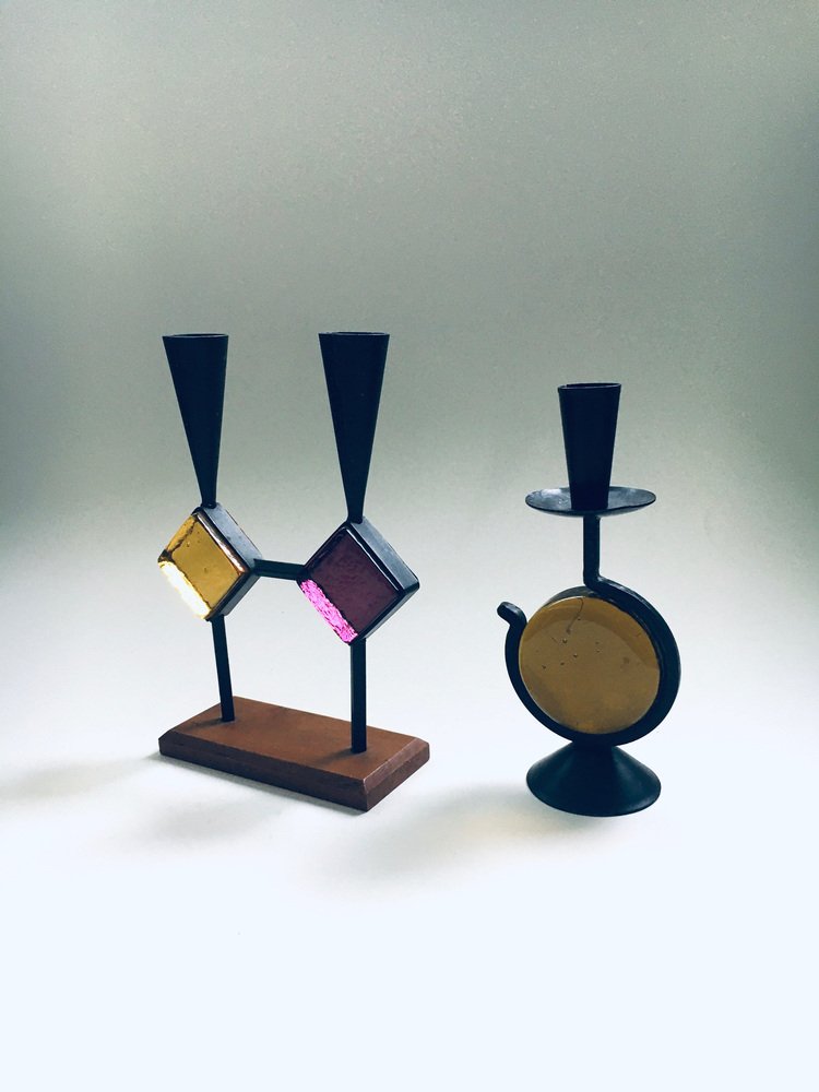 Vintage Midcentury Modern Scandinavian Design Swedish Candleholders in Colored Glass and Wrought Iron by Erik Höglund & Pierre Forsell for Bo Svensk, made in Sweden 1950s / 60's. Candleholder set of 2 different models. The double candle holder on teak bottom plate is stamped on the bottom, Made in Sweden and model number 243 2. The other model is unmarked. Wrought iron constructed with thick colored glass insets. In very good condition. Double model measures 19cm x 13cm x 5cm, Single model measures 16,5cm x 7,5cm x 5,5cm.
