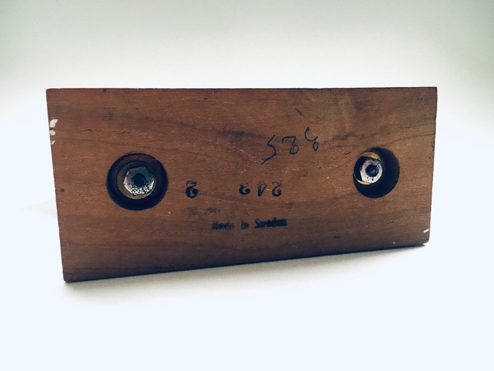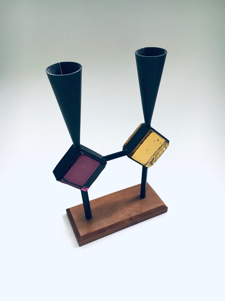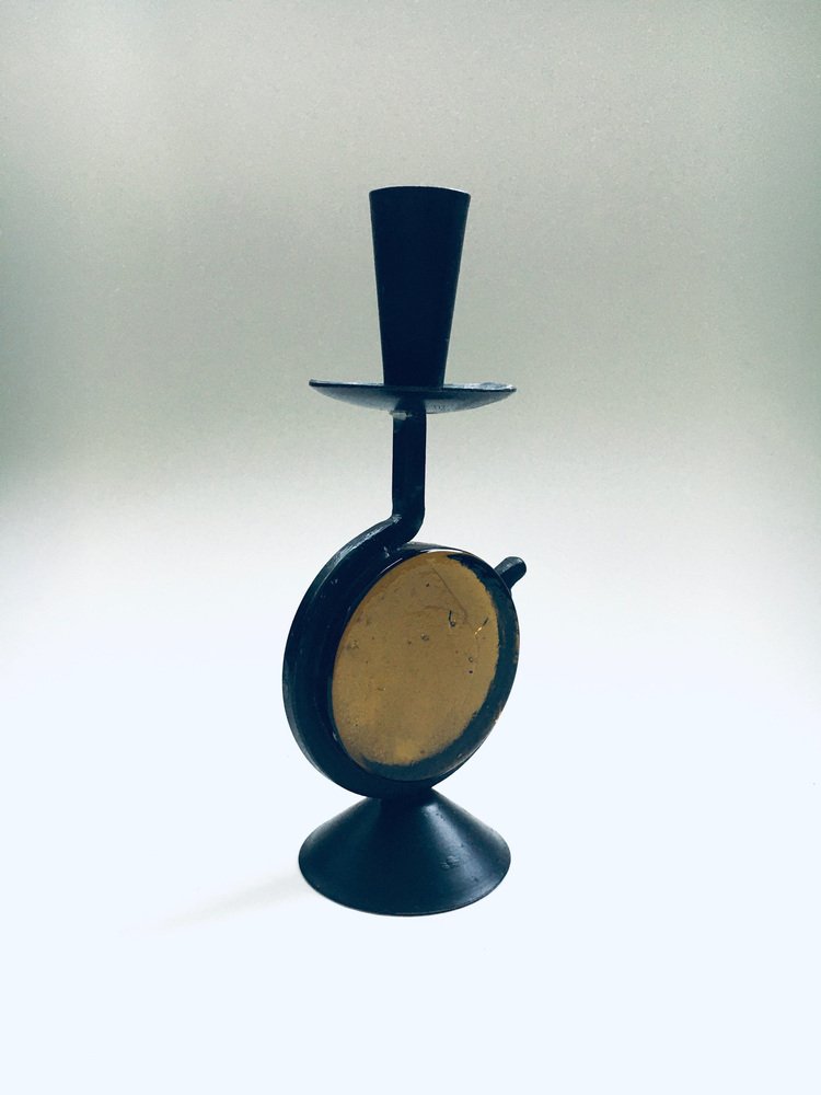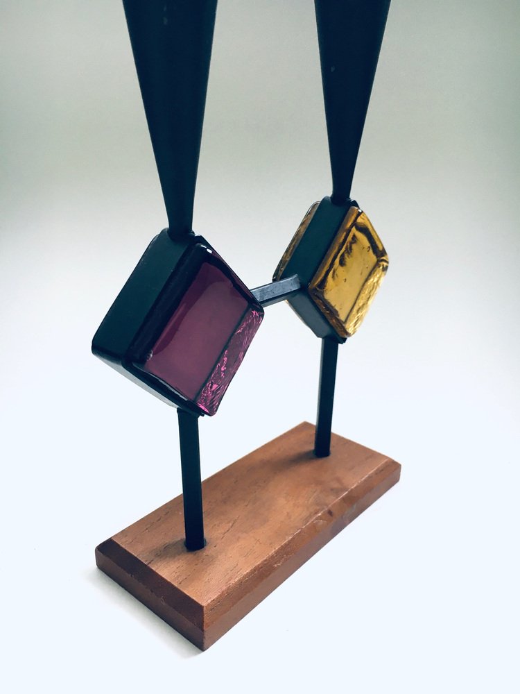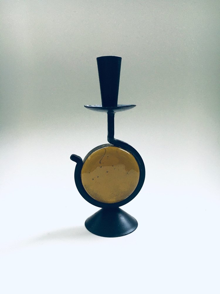 Vintage Midcentury Modern Scandinavian Design Swedish Candleholders in Colored Glass and Wrought Iron by Erik Höglund & Pierre Forsell for Bo Svensk, made in Sweden 1950s / 60's. Candleholder set of 2 different models. The double candle holder on teak bottom plate is stamped on the bottom, Made in Sweden and model number 243 2. The other model is unmarked. Wrought iron constructed with thick colored glass insets. In very good condition. Double model measures 19cm x 13cm x 5cm, Single model measures 16,5cm x 7,5cm x 5,5cm.