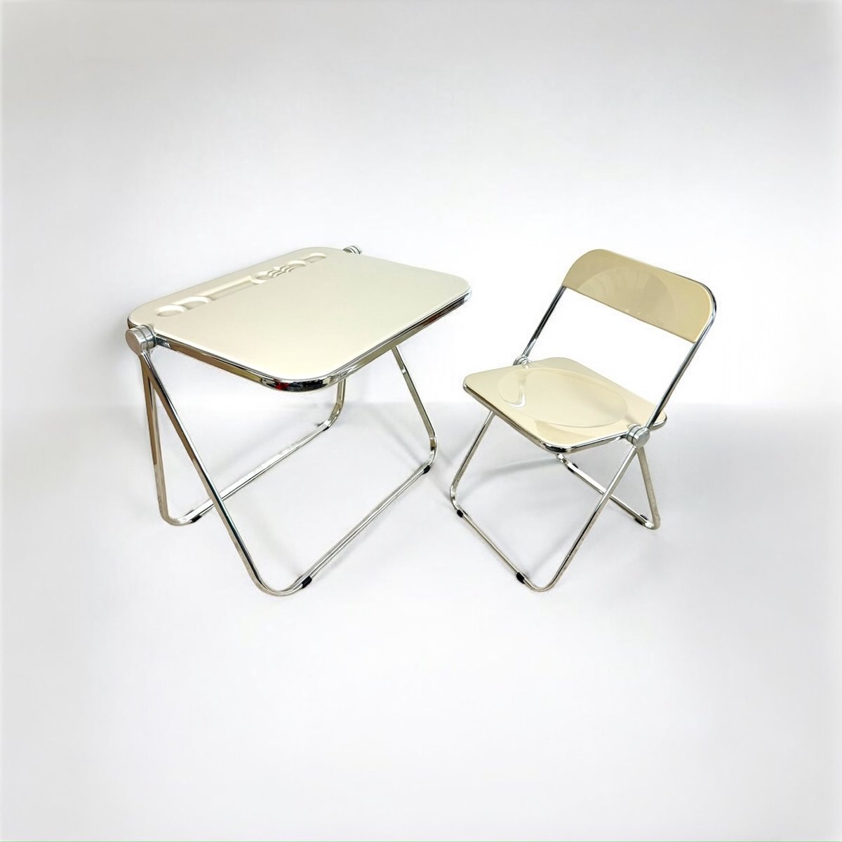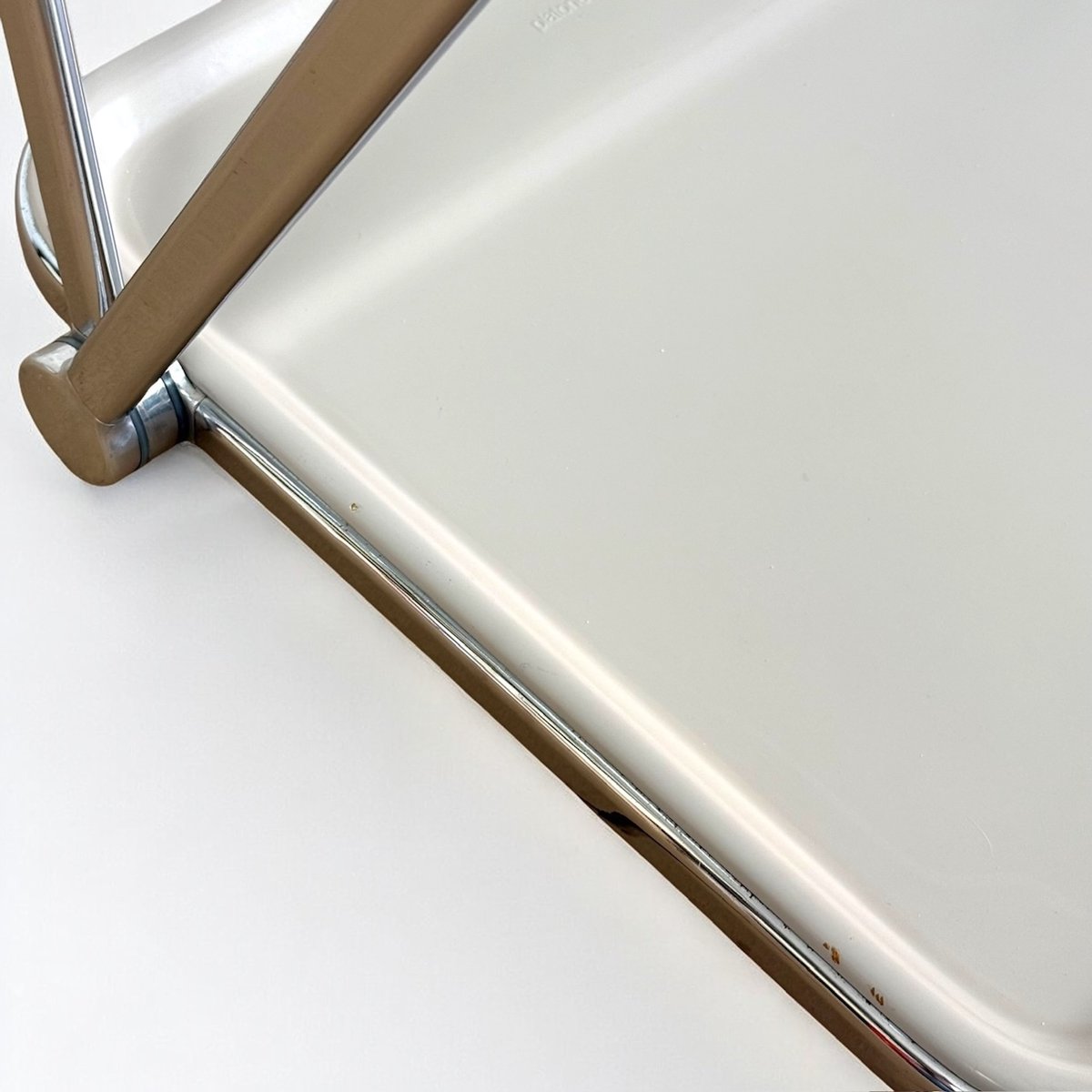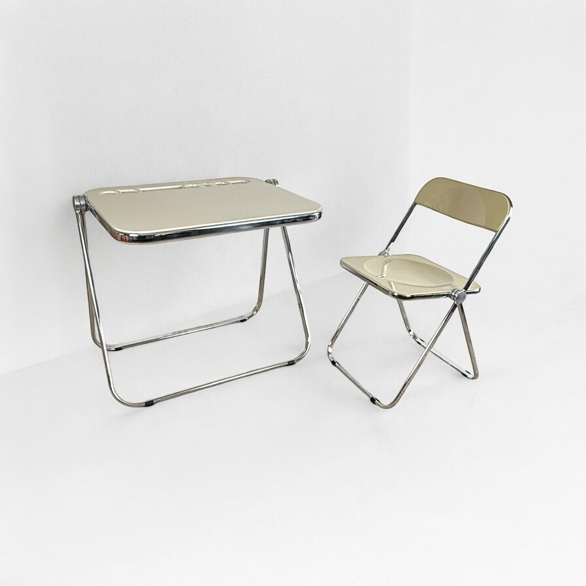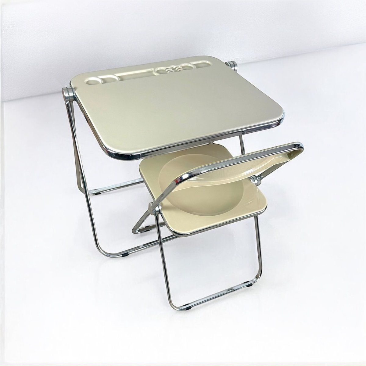 Der Klappstuhl Plia, ebenfalls von Piretti, ergänzt den Schreibtisch. Mit seiner schlanken Silhouette und seiner mühelosen Zweckmäßigkeit unterstreicht der Plia die Eleganz des Schreibtisches und bildet eine stimmige und anspruchsvolle Kombination.