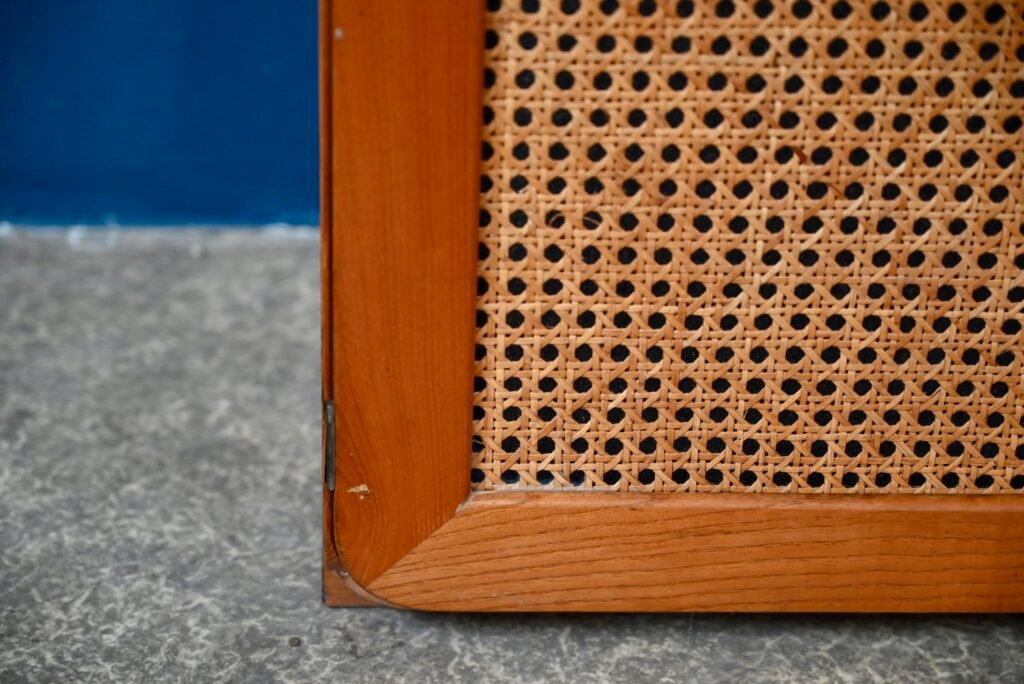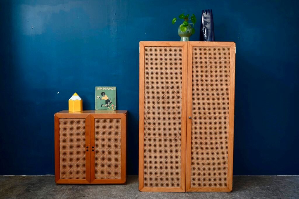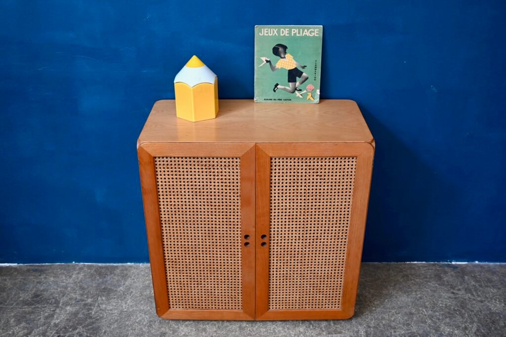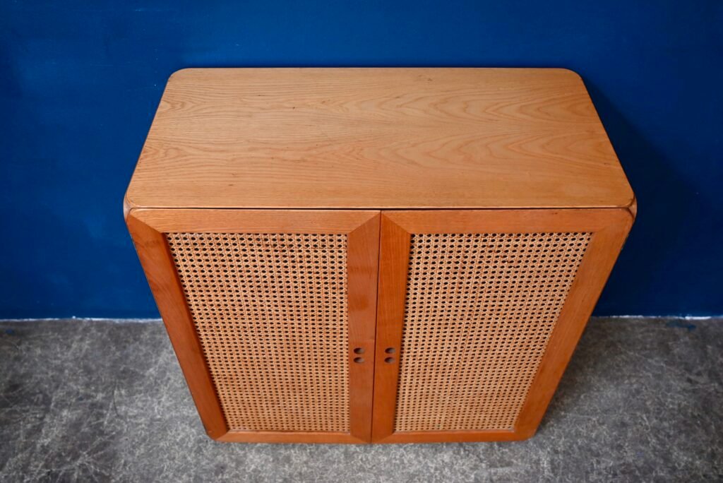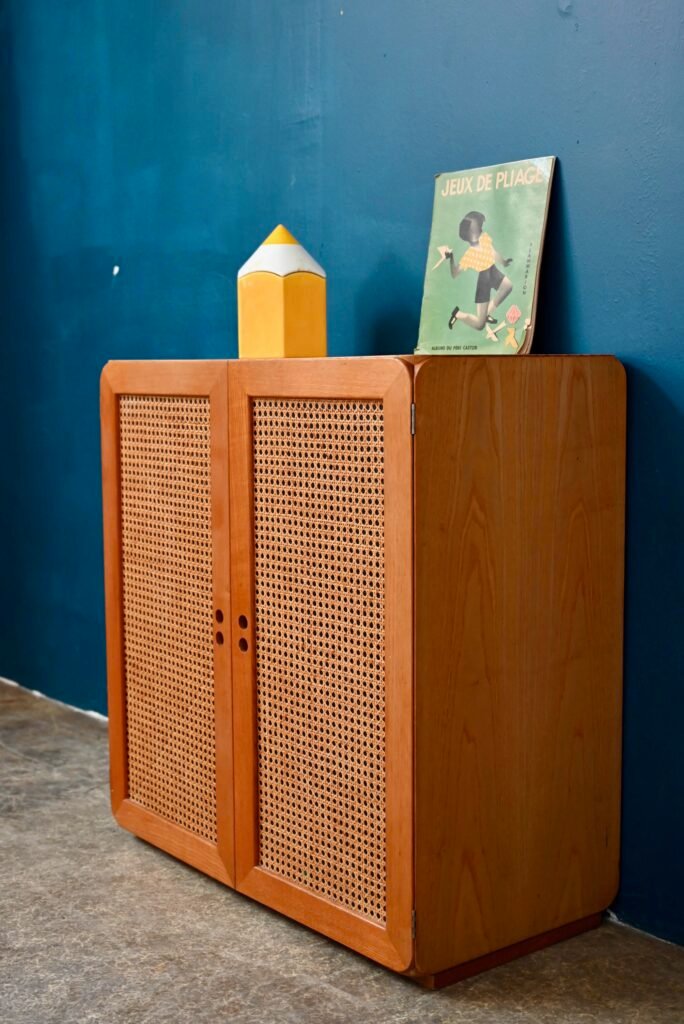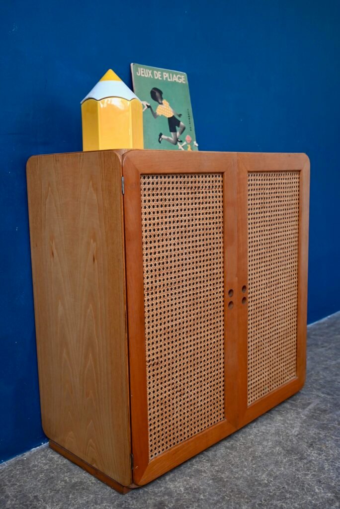 Although their design is of Dutch origin, Dirk Van De Vries' furniture was nevertheless mainly produced in Italy. The pure, minimalist lines highlight the beauty of the materials: light wood and wicker canework. We also appreciate the rounded and delicately designed furniture corners. This chest of drawers from the 1960s reflects the Italian elegance and avant-garde of Dutch design. Timeless and endearing, this module is an original retro piece of furniture with undeniable decorative power. We can easily imagine it in an entrance, a child's bedroom or a bathroom.