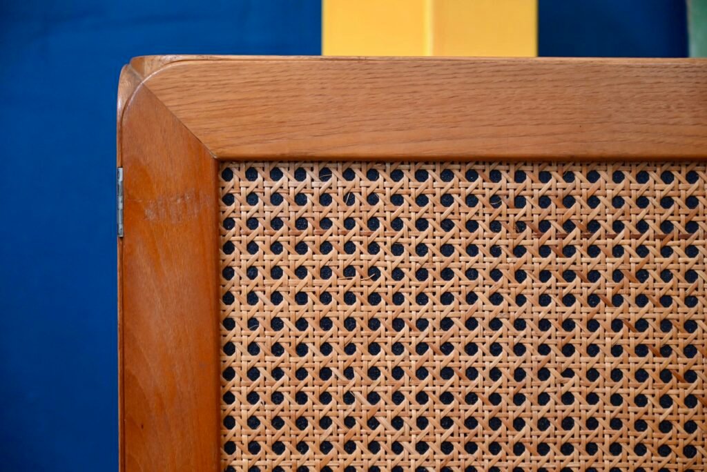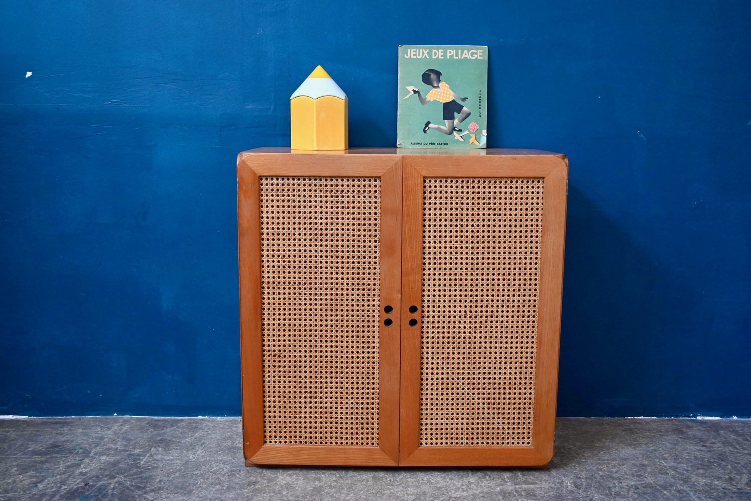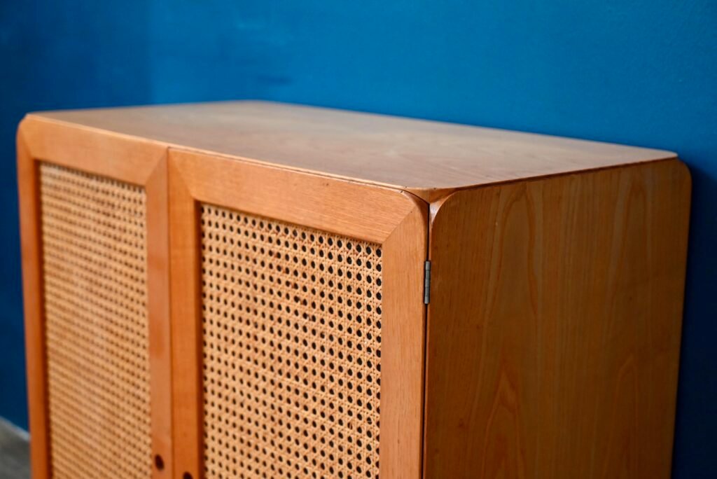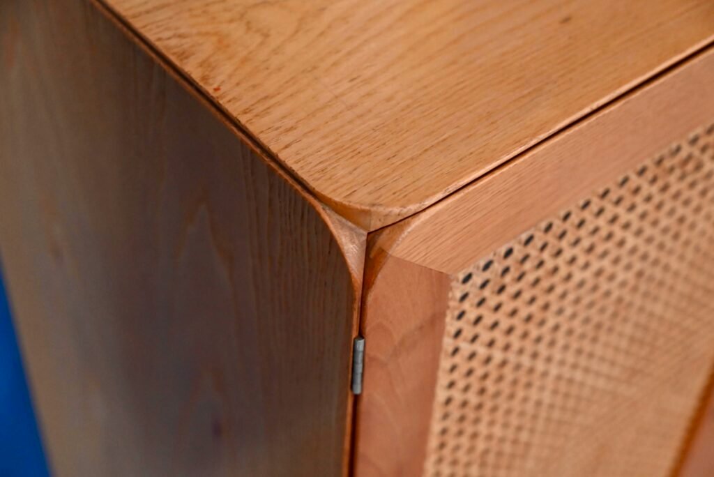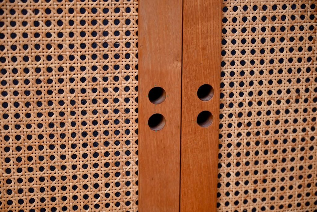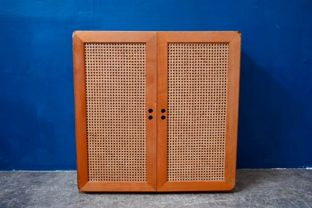 Although their design is of Dutch origin, Dirk Van De Vries' furniture was nevertheless mainly produced in Italy. The pure, minimalist lines highlight the beauty of the materials: light wood and wicker canework. We also appreciate the rounded and delicately designed furniture corners. This chest of drawers from the 1960s reflects the Italian elegance and avant-garde of Dutch design. Timeless and endearing, this module is an original retro piece of furniture with undeniable decorative power. We can easily imagine it in an entrance, a child's bedroom or a bathroom.