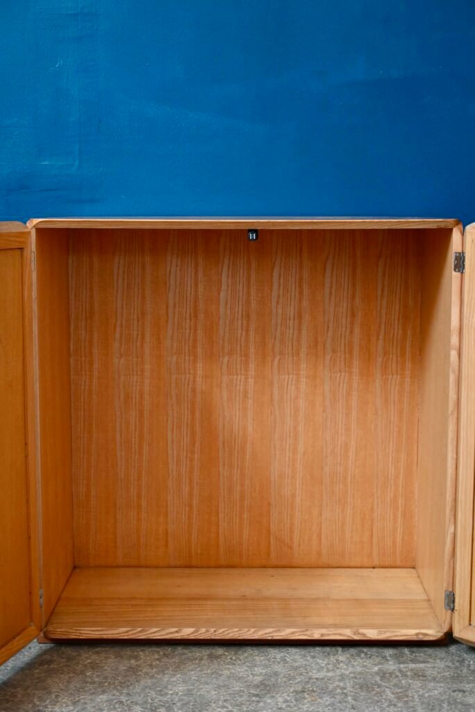 The box is old and dates from the 60s. Designed by Dutch designer Derk Van de Vries, the lines are minimalist and highlight the materials: solid wood and wicker canework. No lack of strand is noted. The whole thing is in very good condition. This model does not have a base, however it is possible to raise the structure. Key and lock are original.