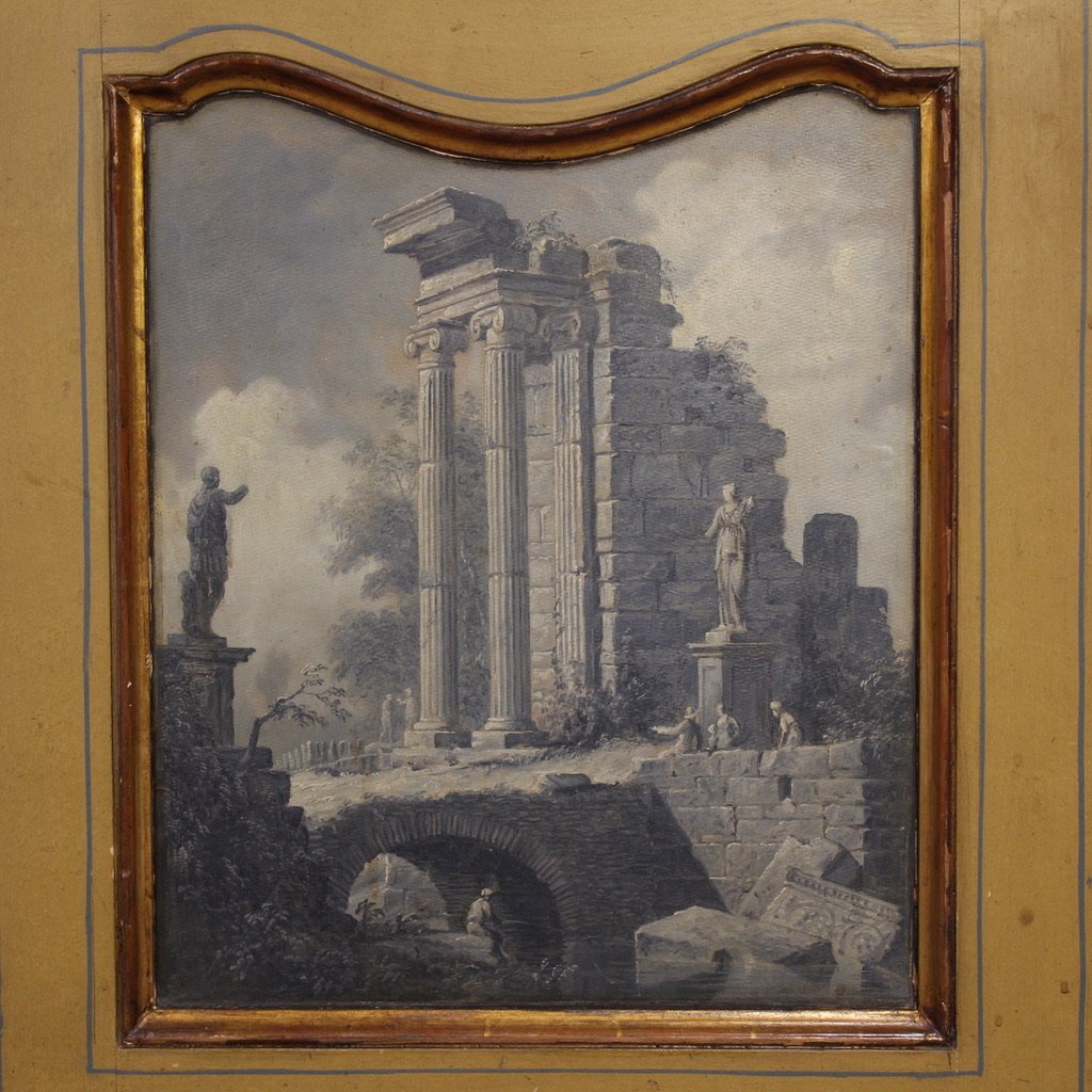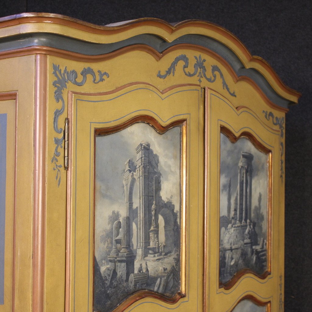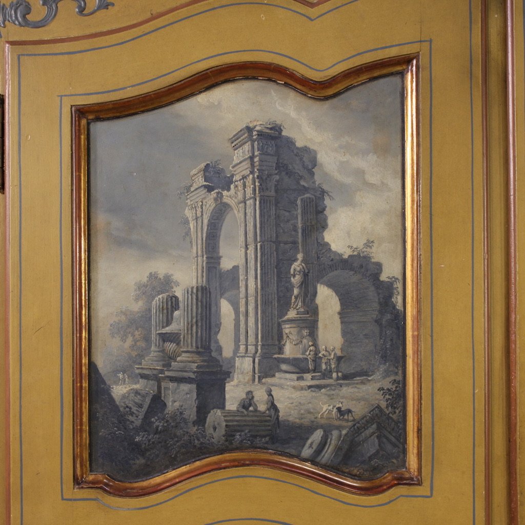 Small Piedmontese wardrobe from the mid-20th century. Carved, lacquered, gilded, and hand-painted furniture, of excellent quality. The doors are adorned with six beautifully colored grisaille prints depicting romantic views of ruins. This two-door armoire, complete with key and working lock, offers several shelves and a hanging rail, offering good storage and practicality.