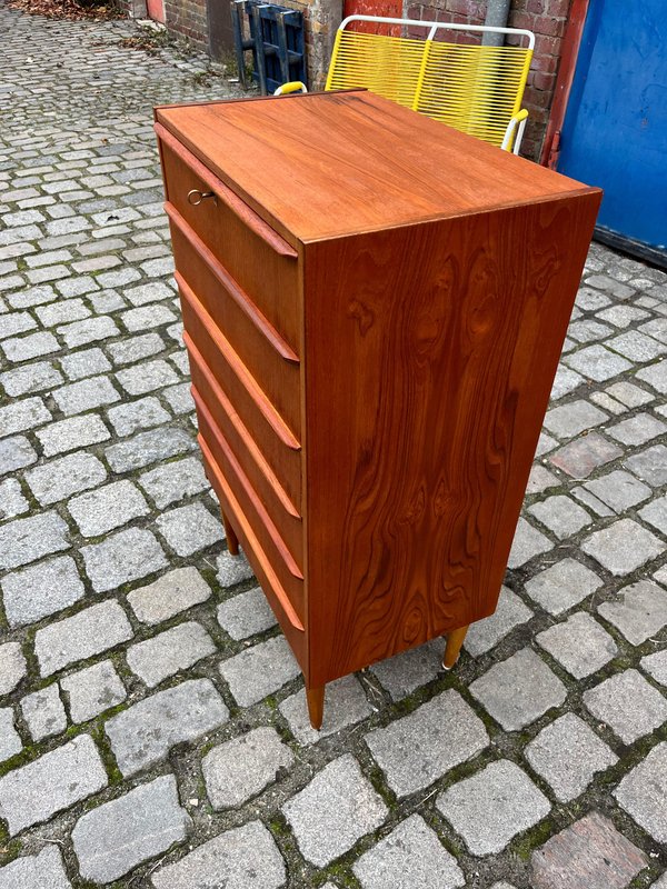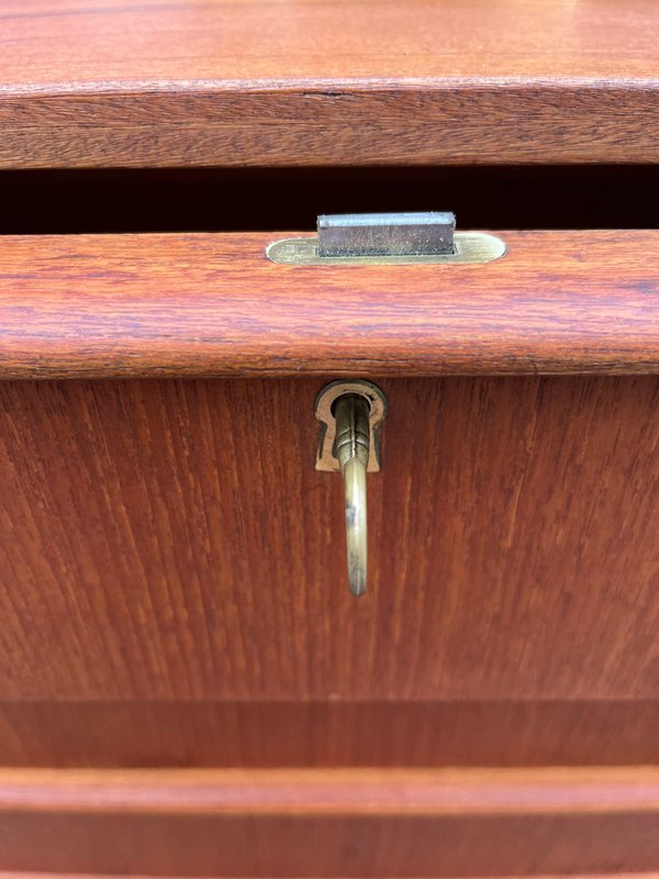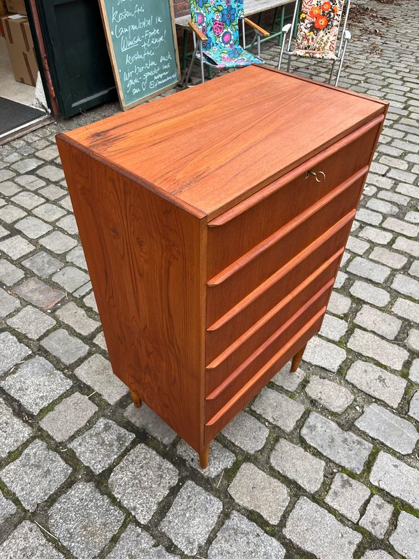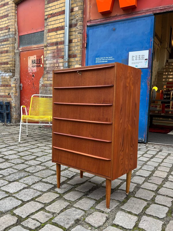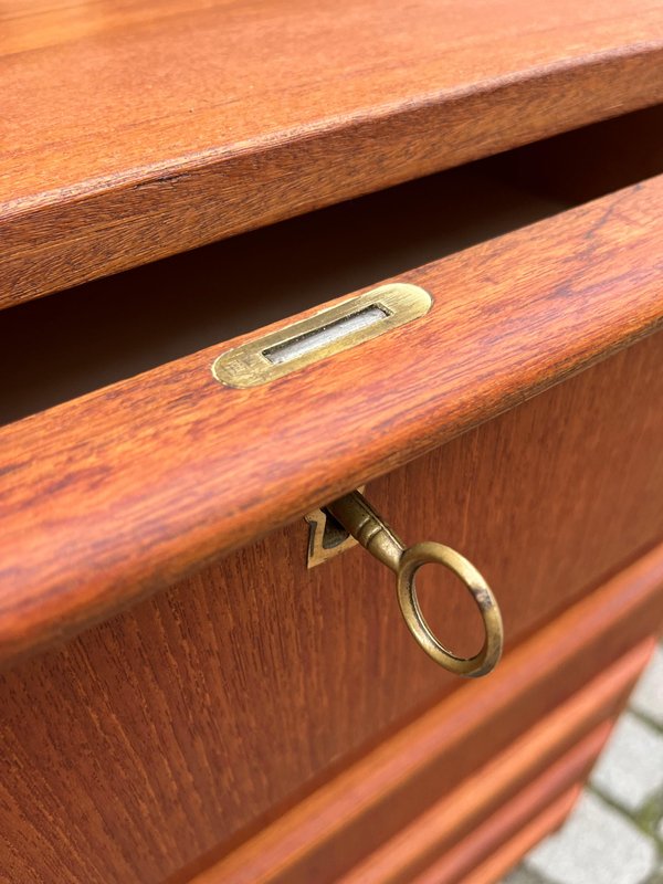 Diese schmale Teak-Kommode aus Dänemark vereint Mid-Century-Ästhetik mit einer angenehm klaren, zeitlosen Linienführung. Besonders hervorzuheben sind die durchgängigen, elegant geformten Griffleisten, die sich über die gesamte Breite jeder Schublade ziehen und der Front eine ruhige, horizontale Struktur verleihen. Das Möbel wurde aufgearbeitet und präsentiert sich in warmem, gleichmäßigem Teakton mit schöner Maserung. Die Kommode verfügt über ein Schloss und bietet trotz ihrer schlanken Silhouette großzügigen Stauraum auf sechs Schubladenebenen.
