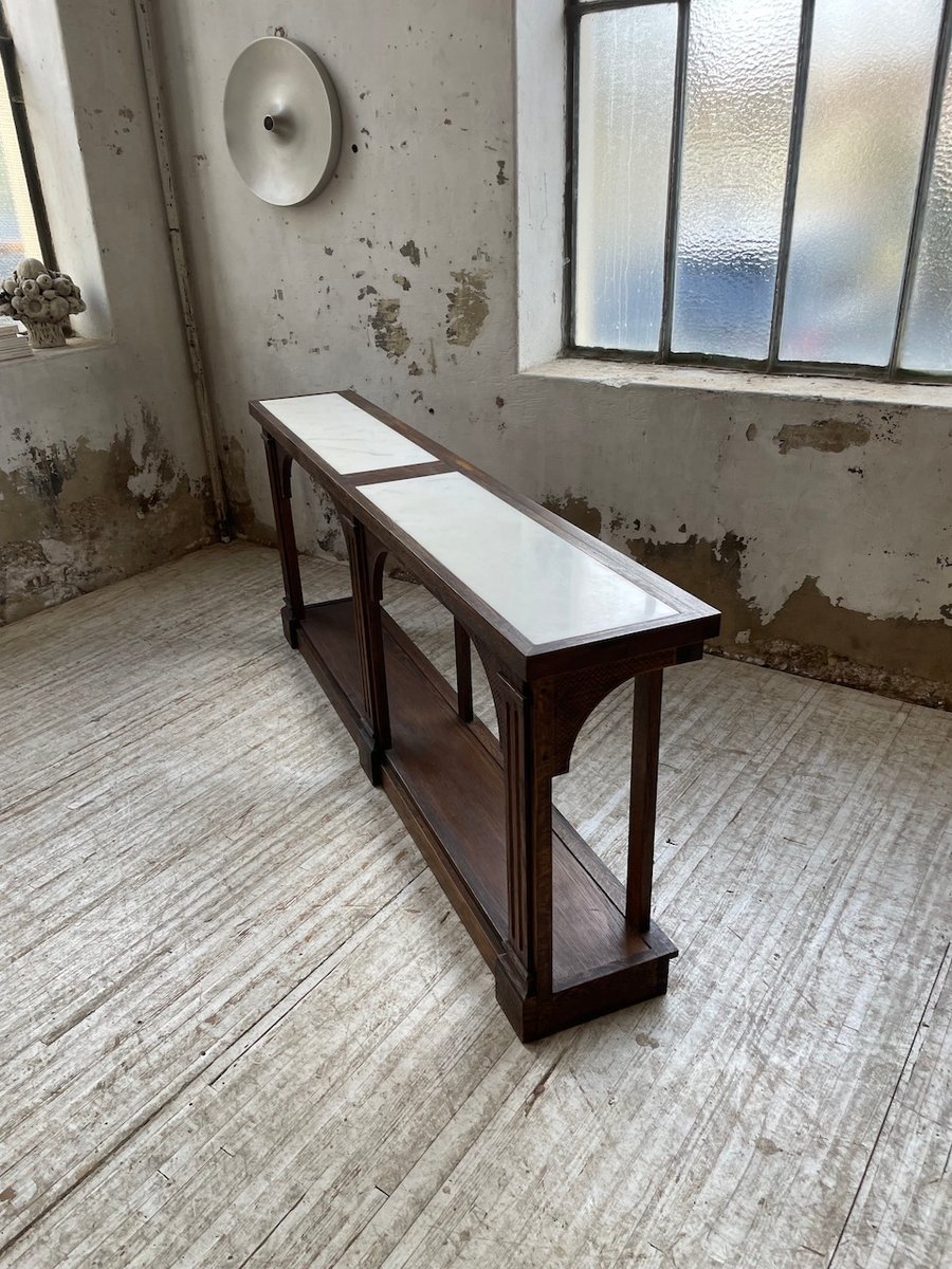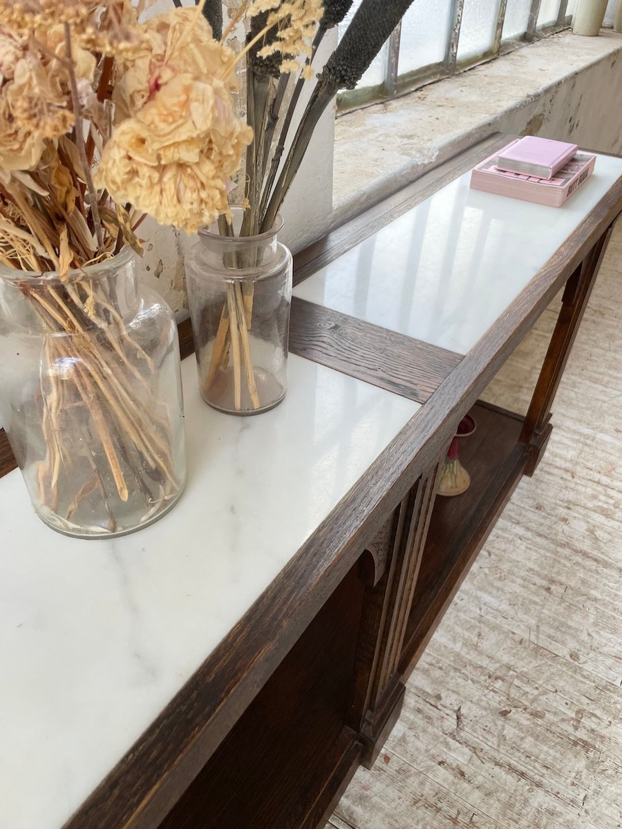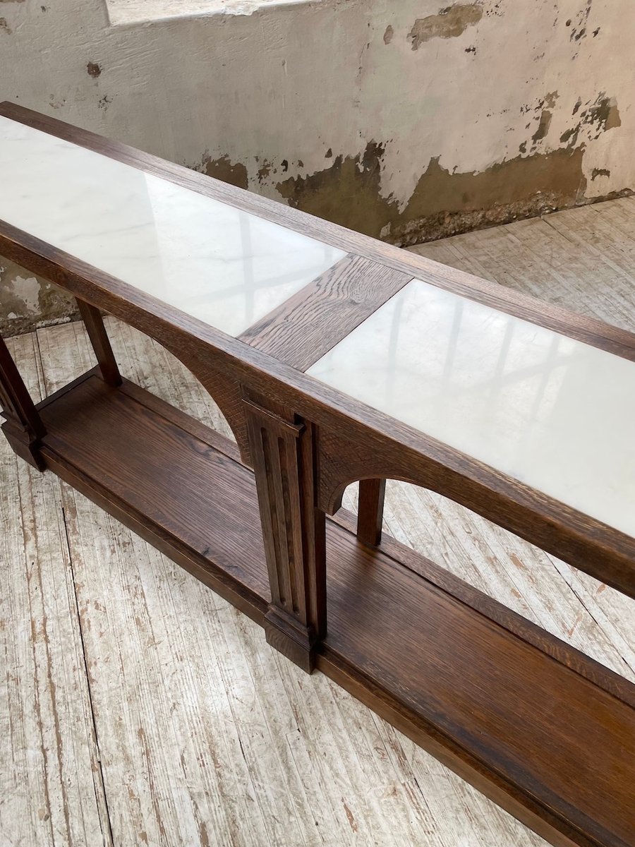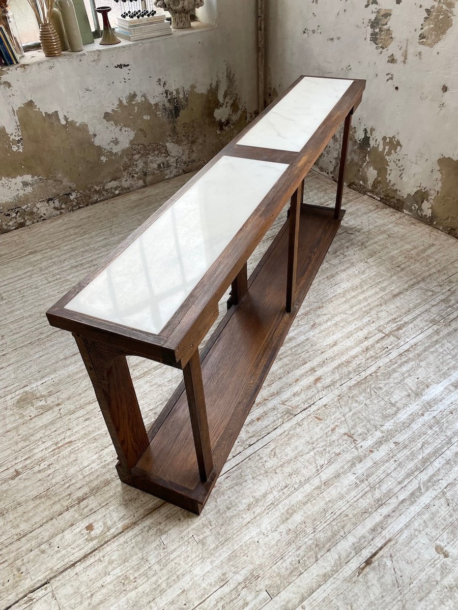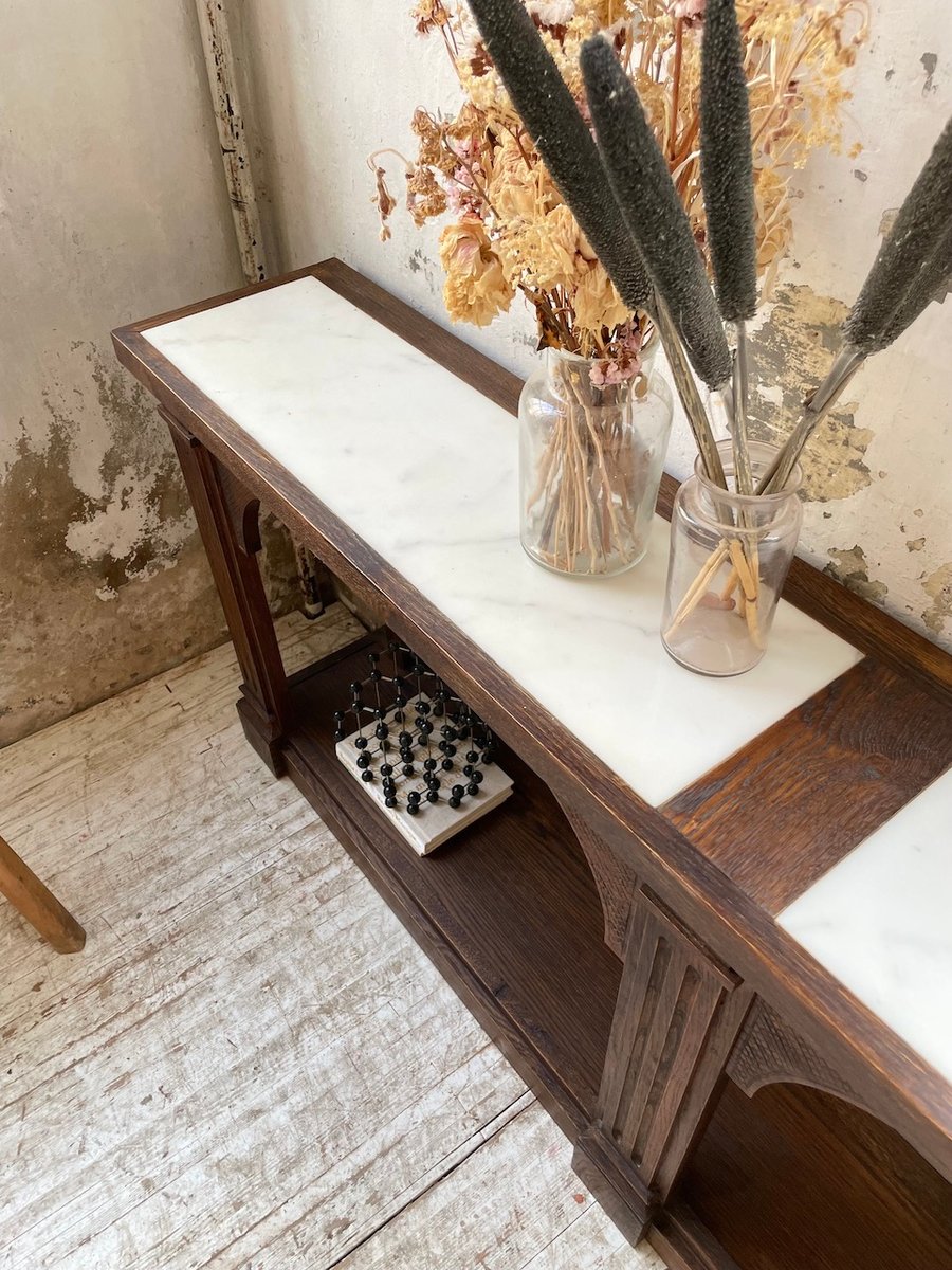 Antiker Konsolentisch aus Eiche mit zwei integrierten Platten aus weißem Marmor.
