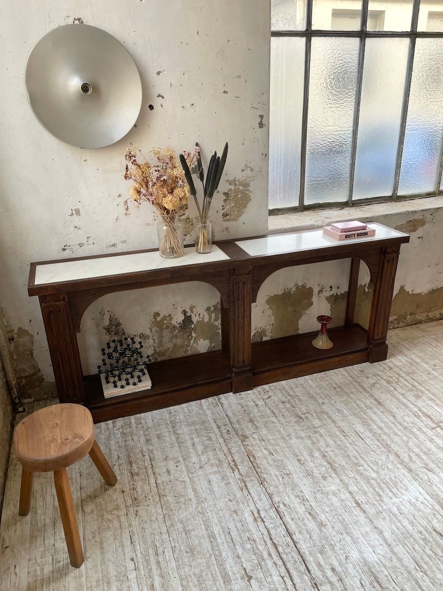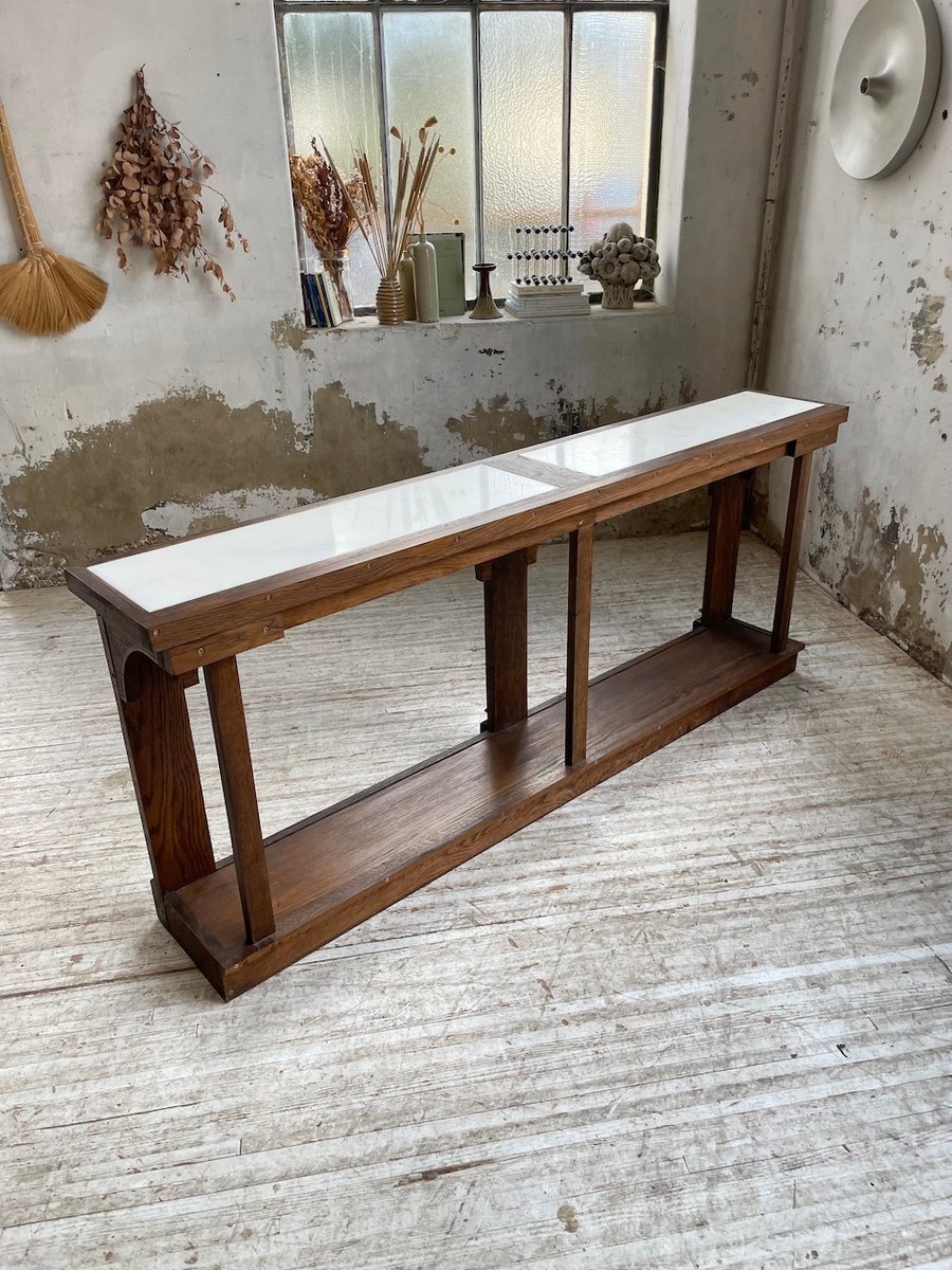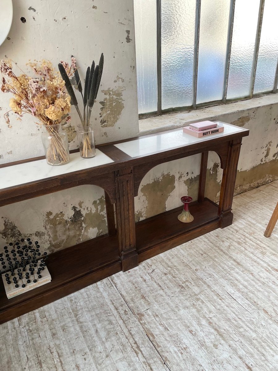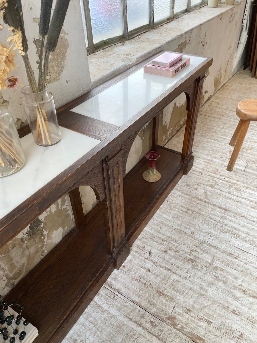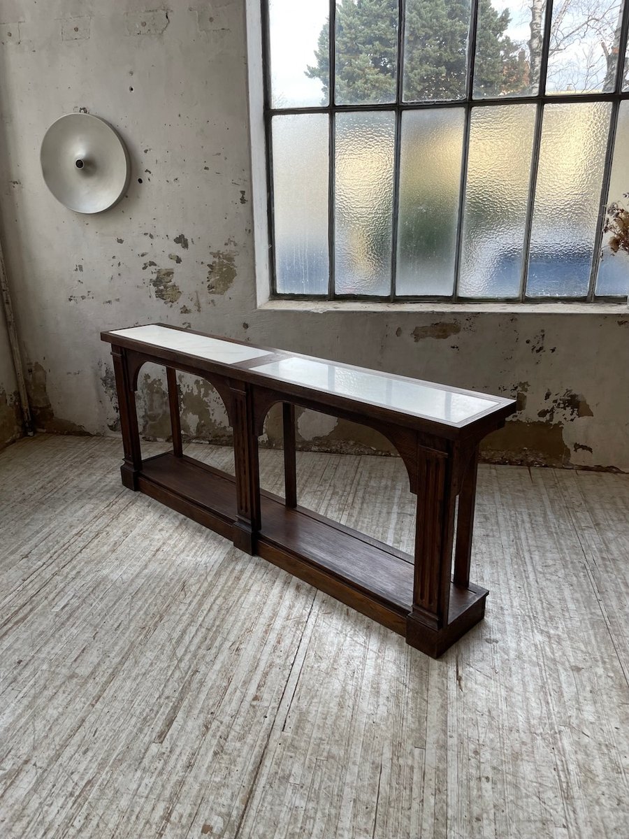 Antiker Konsolentisch aus Eiche mit zwei integrierten Platten aus weißem Marmor.