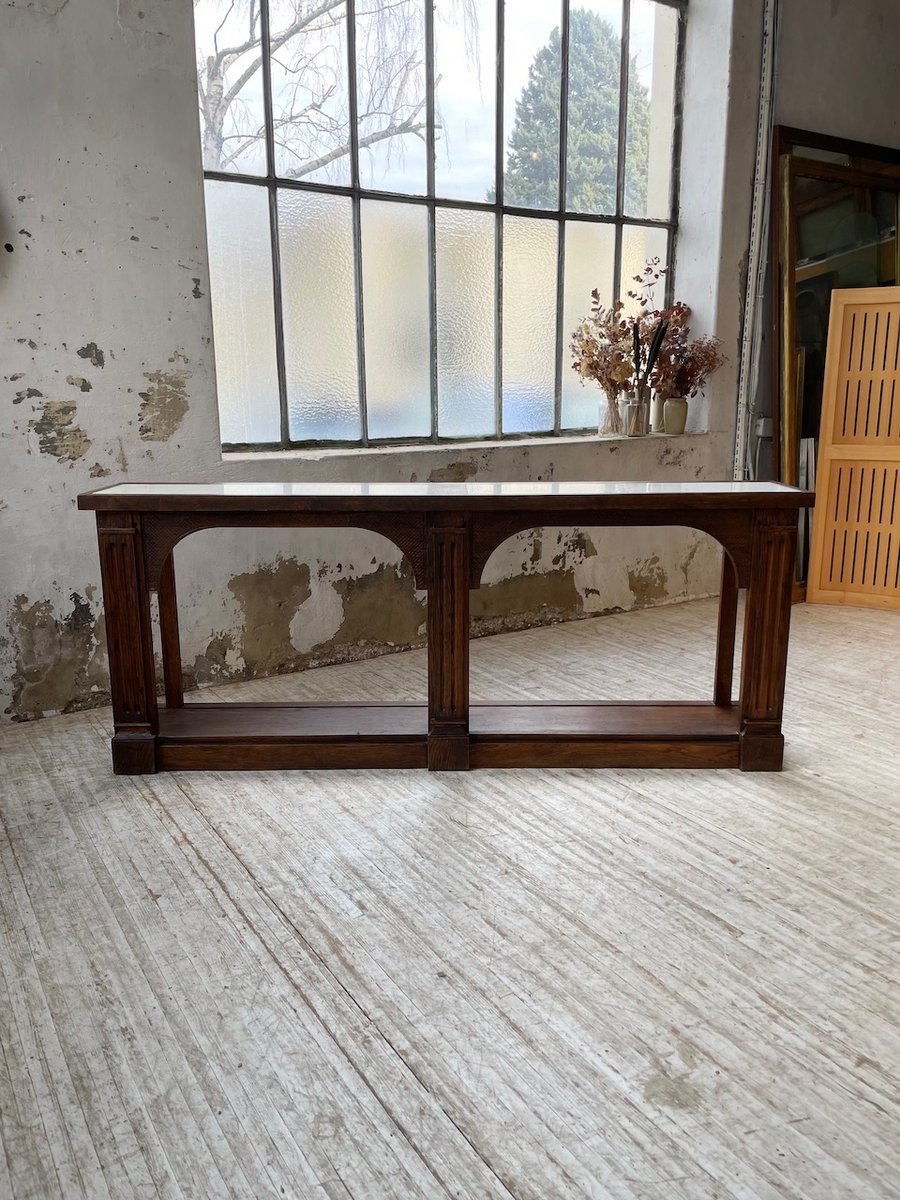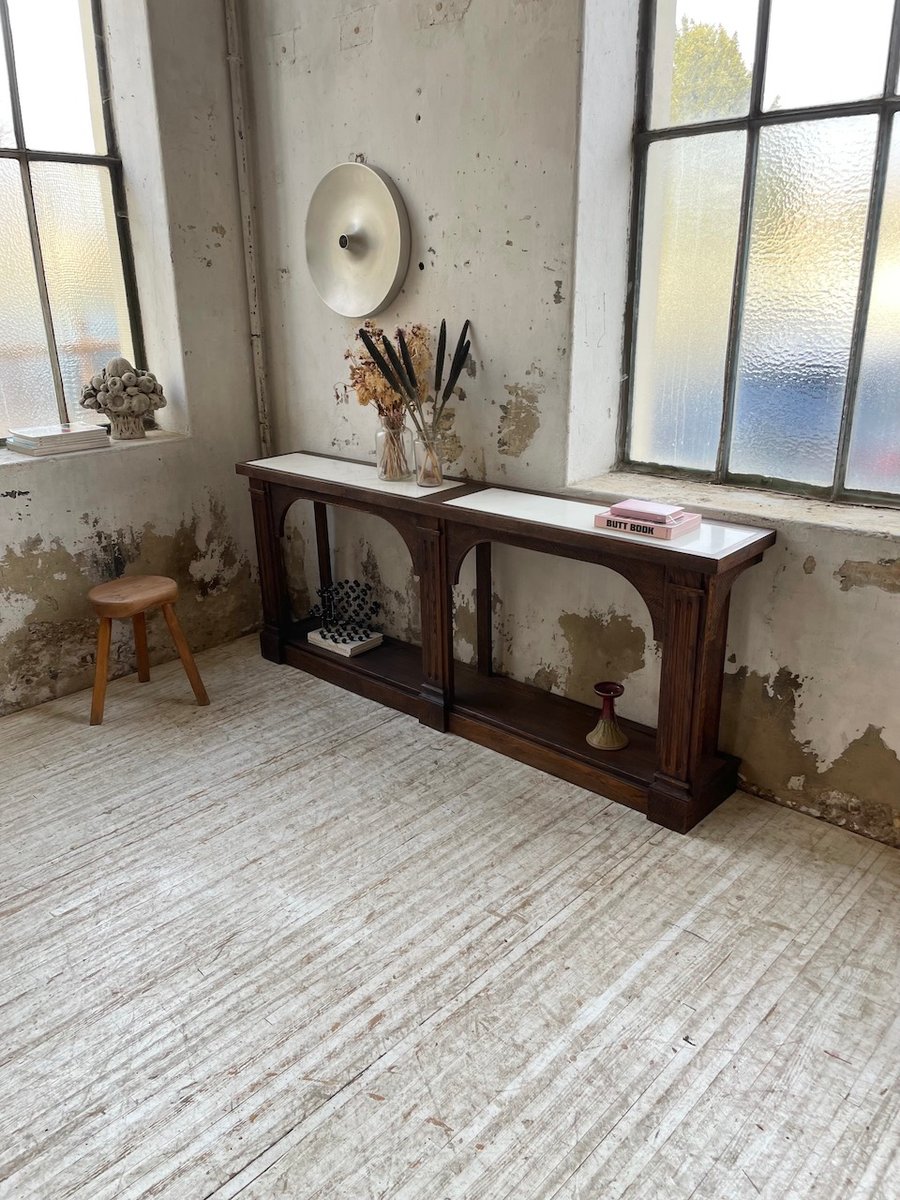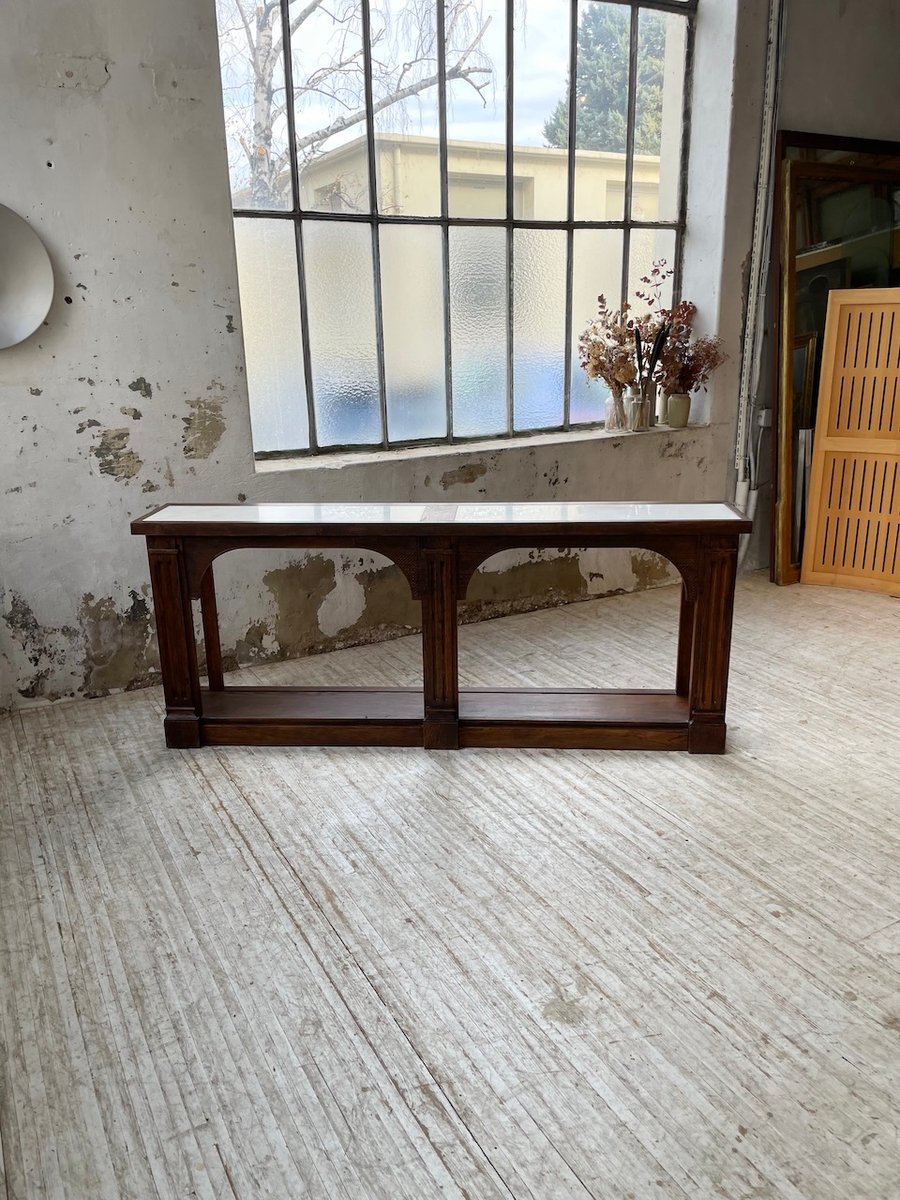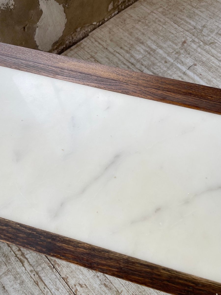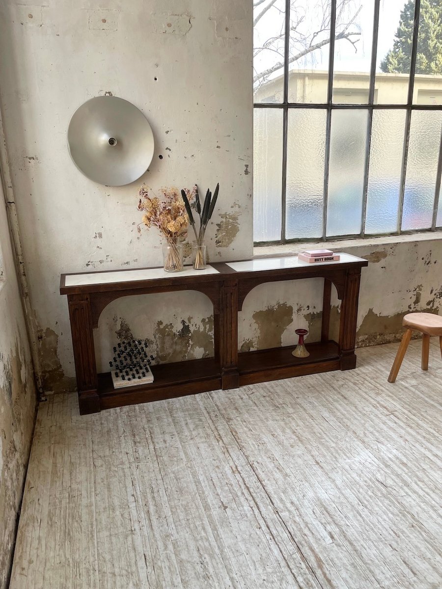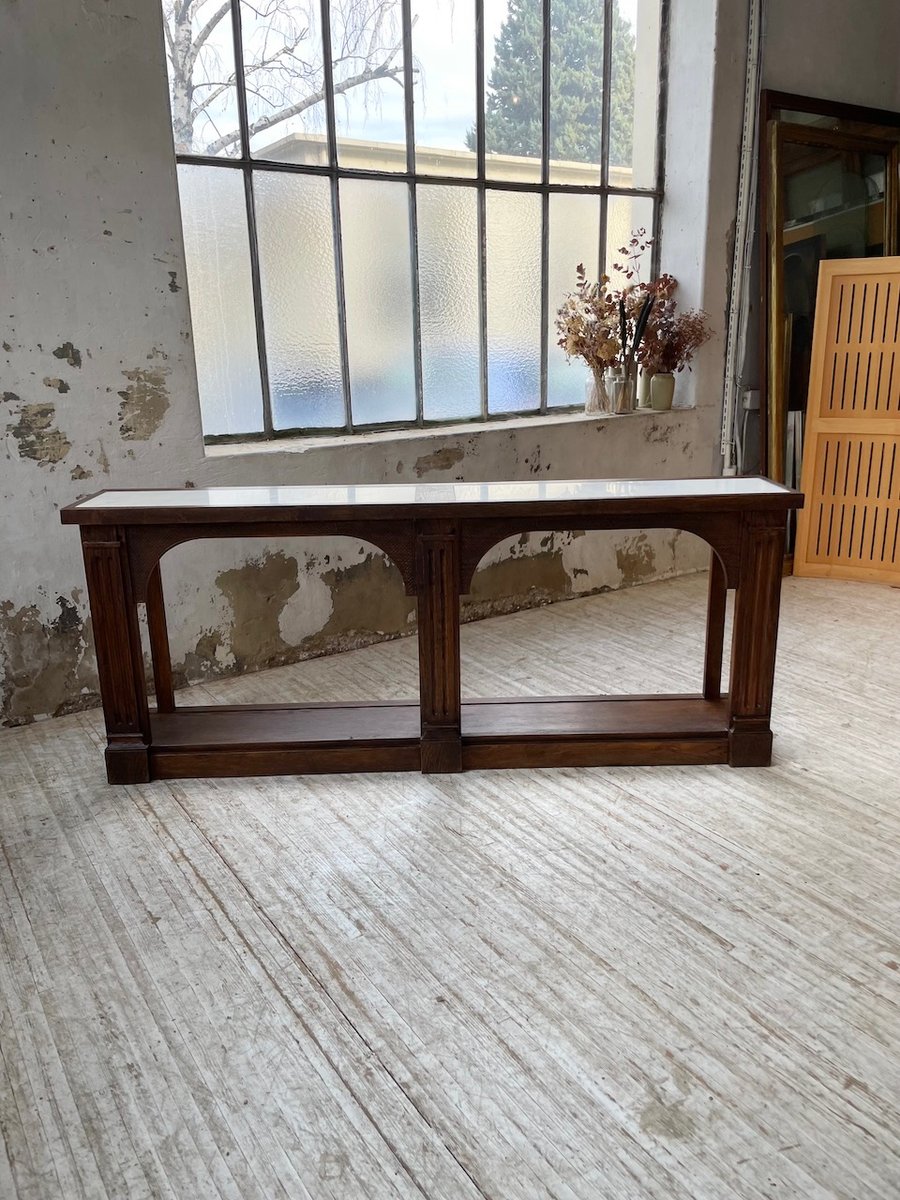 Antiker Konsolentisch aus Eiche mit zwei integrierten Platten aus weißem Marmor.