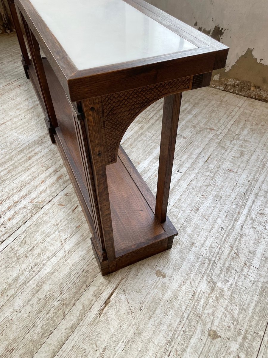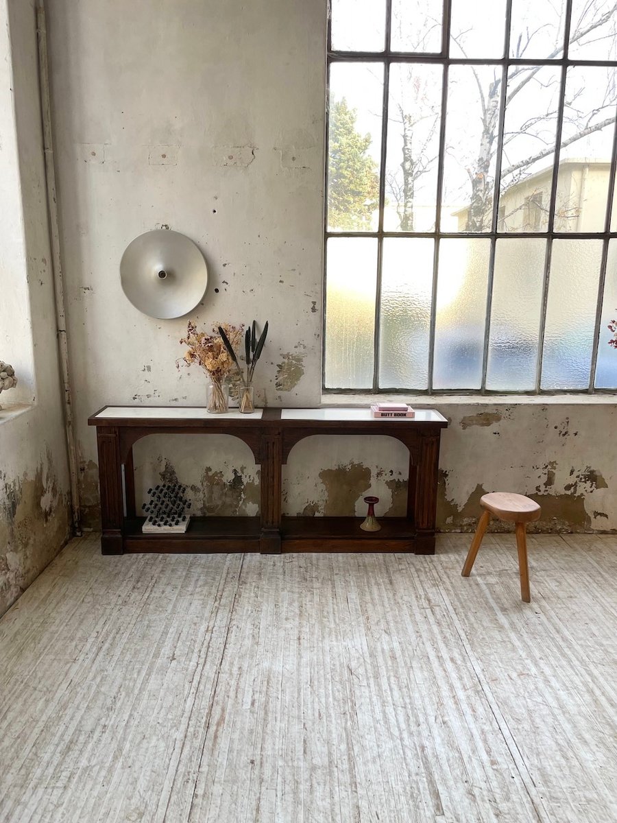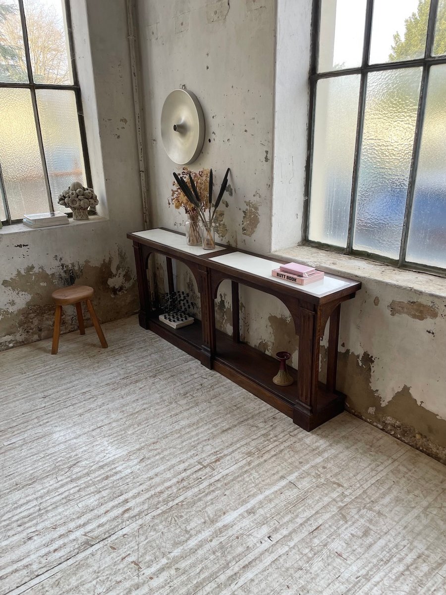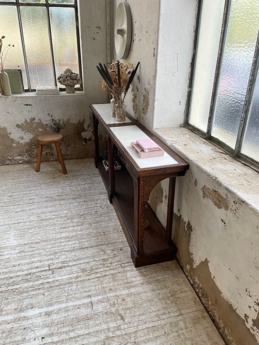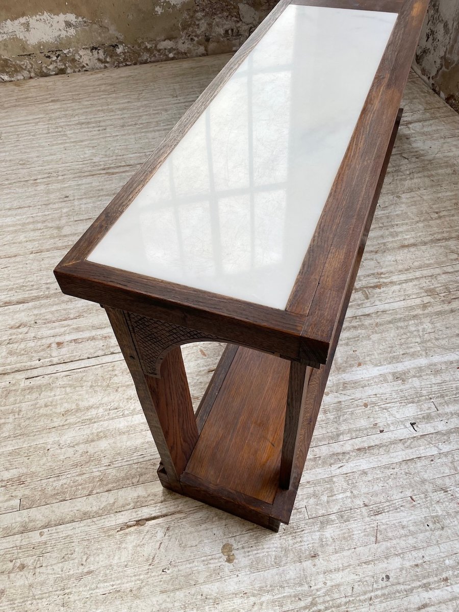 Antiker Konsolentisch aus Eiche mit zwei integrierten Platten aus weißem Marmor.