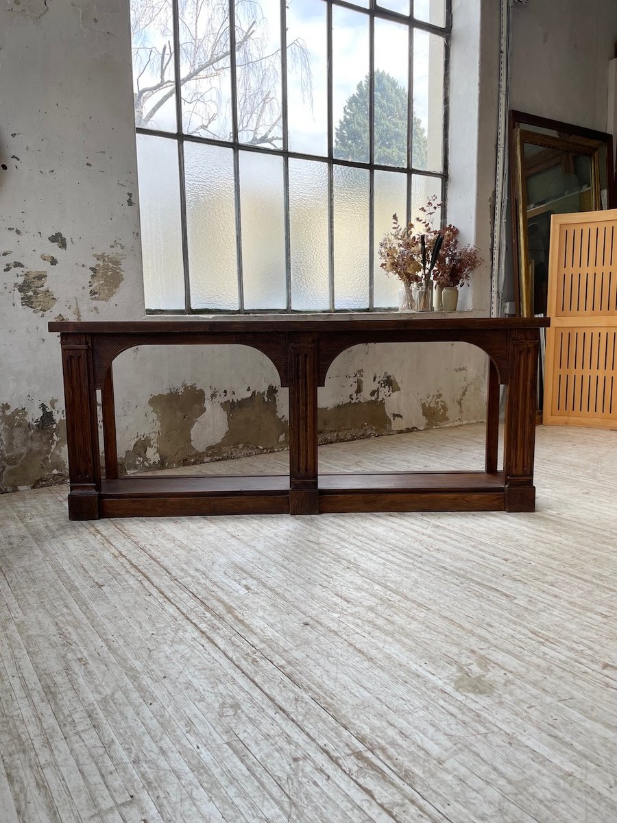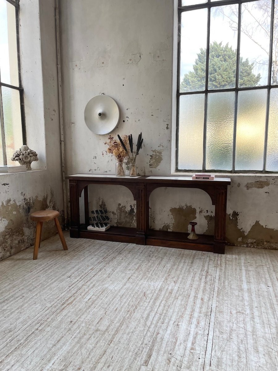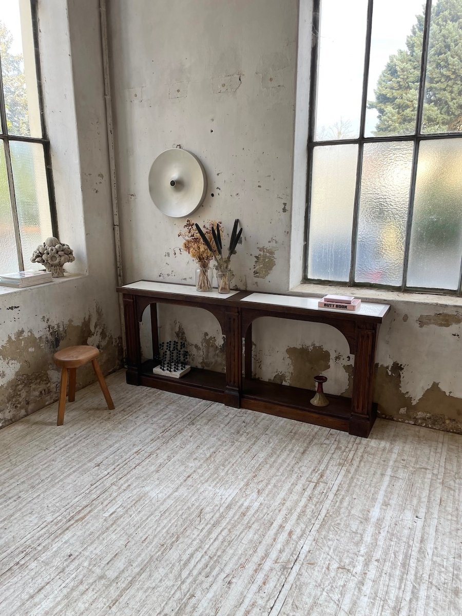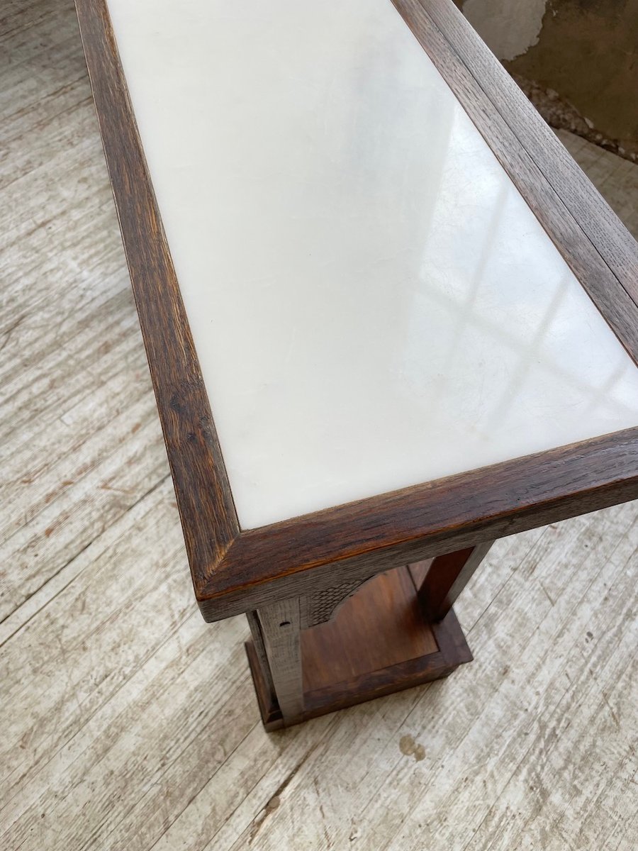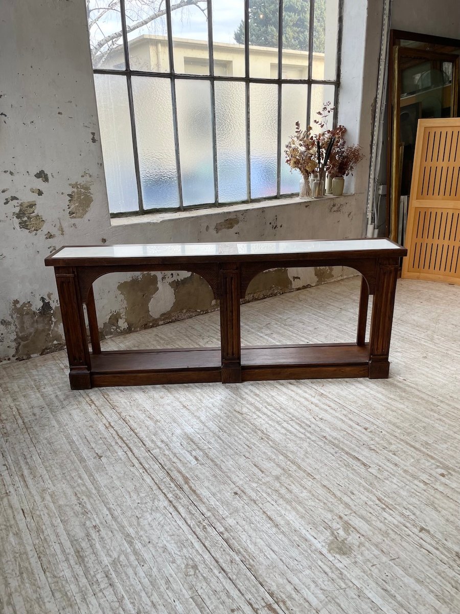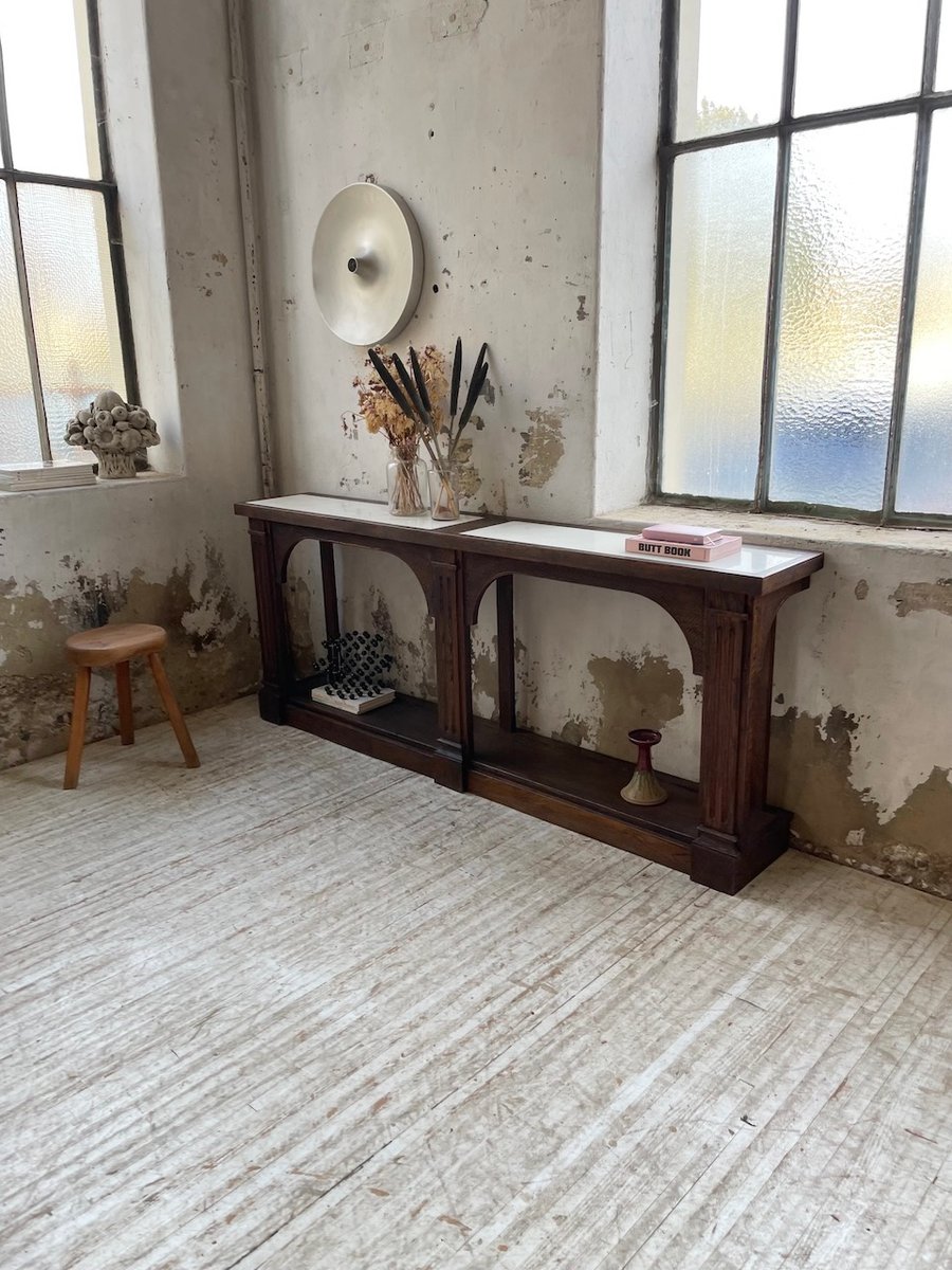 Antiker Konsolentisch aus Eiche mit zwei integrierten Platten aus weißem Marmor.