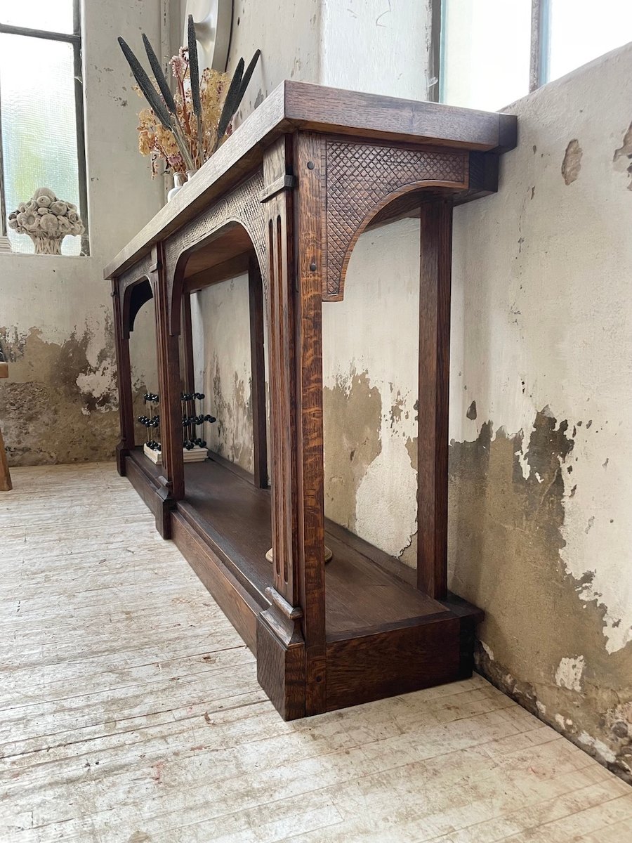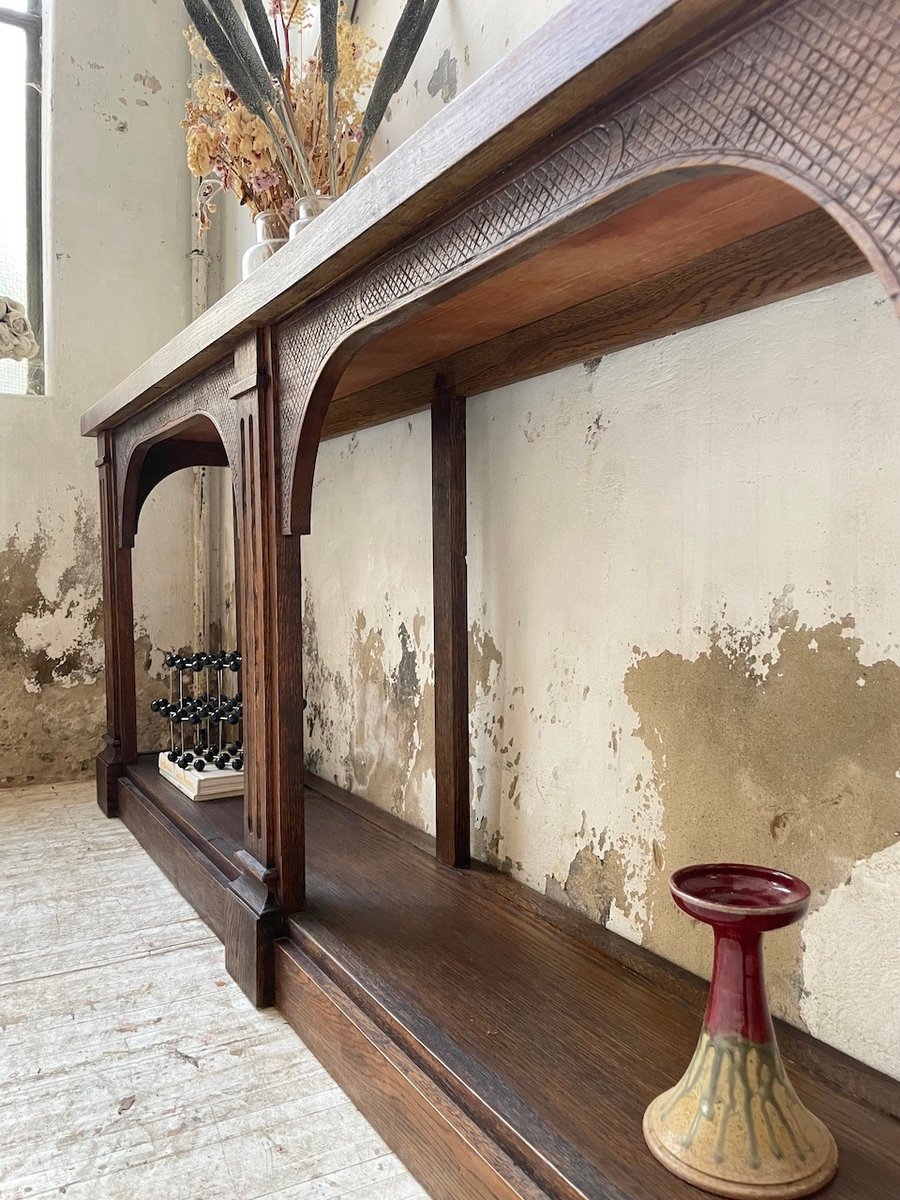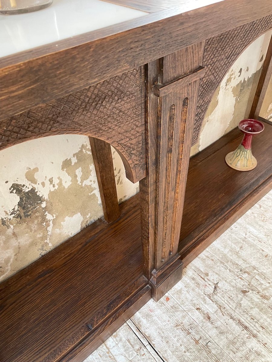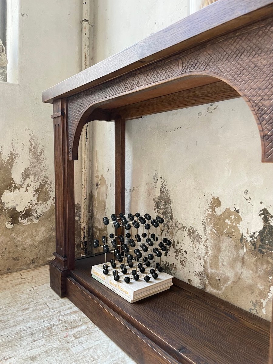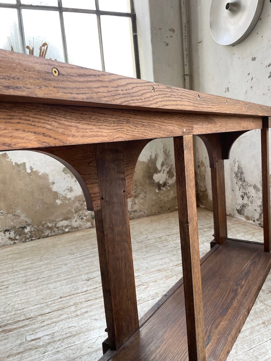 Antiker Konsolentisch aus Eiche mit zwei integrierten Platten aus weißem Marmor.